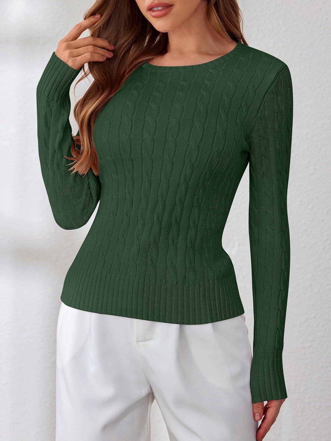 ANRABESS Womens Long Sleeve Cable Knit Sweater Jumper Crewneck Pullover Soft Dressy Casual Tops Cute 2025 Fall Trendy Outfits(Deep Green)