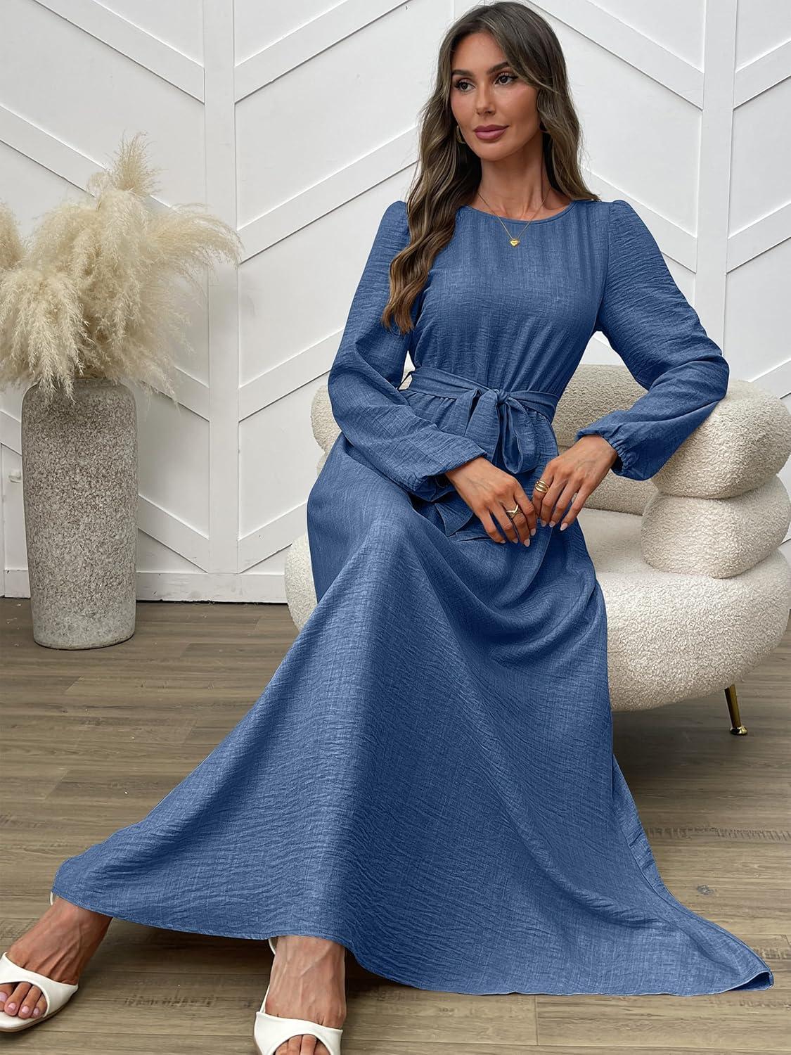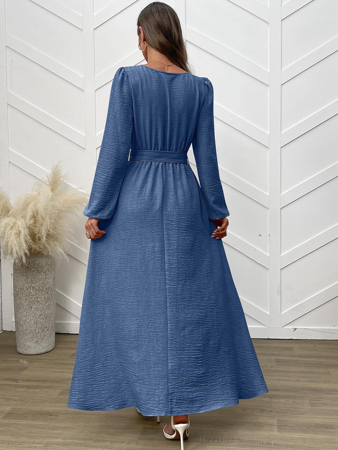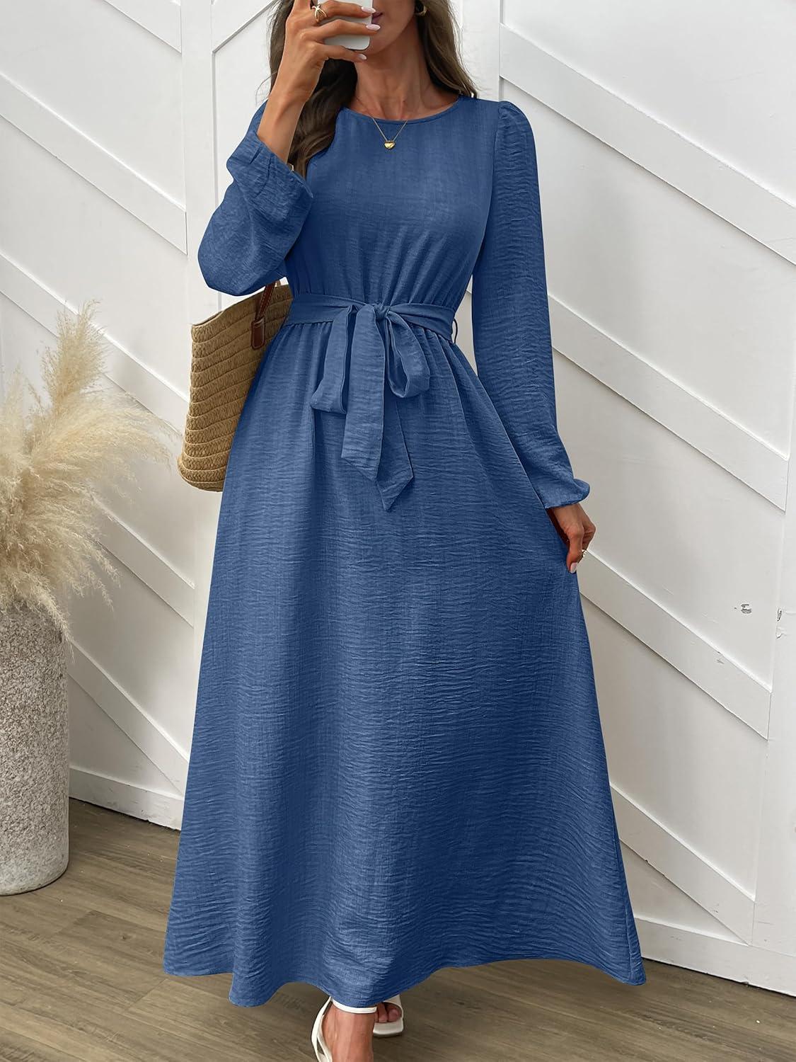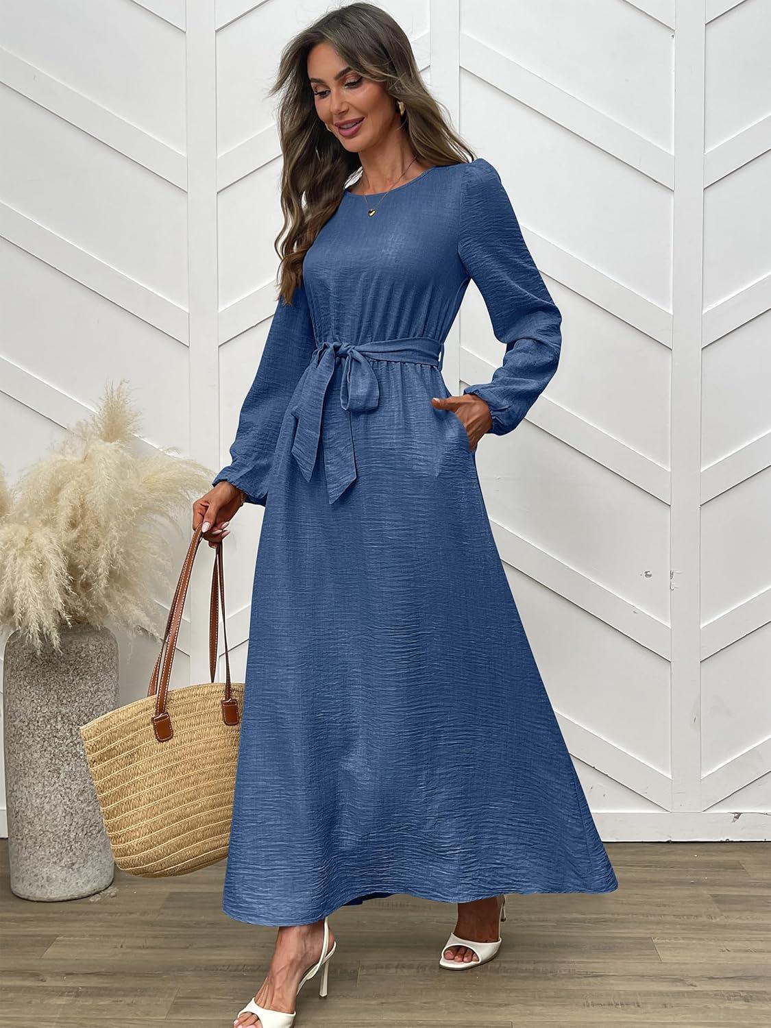 ANRABESS Womens Long Sleeve Dress 2025 Fall Casual Empire Waist A-Line Flowy Maxi Dresses with Pockets Vacation Outfits(Blue)
