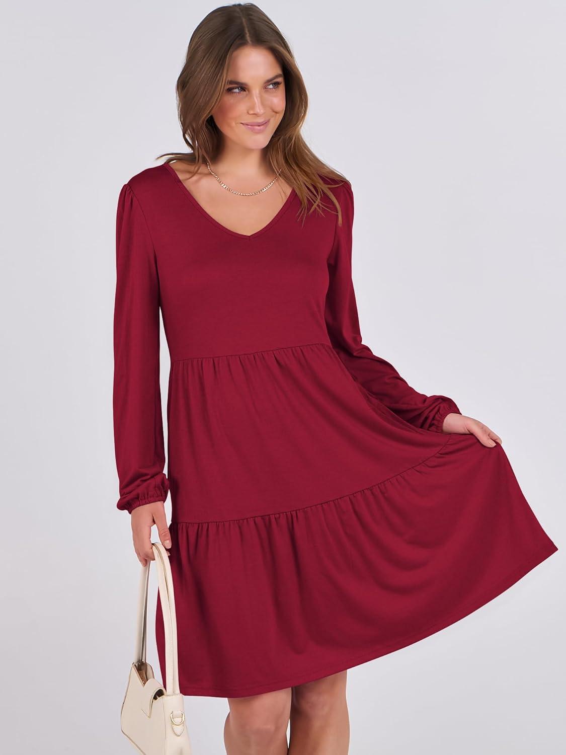 ANRABESS Womens Long Sleeve Dress 2025 Fall Casual V Neck Tiered Flowy Short Dresses Beach Travel Vacation Outfits(Burgundy)