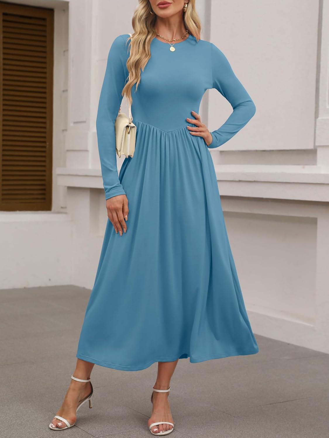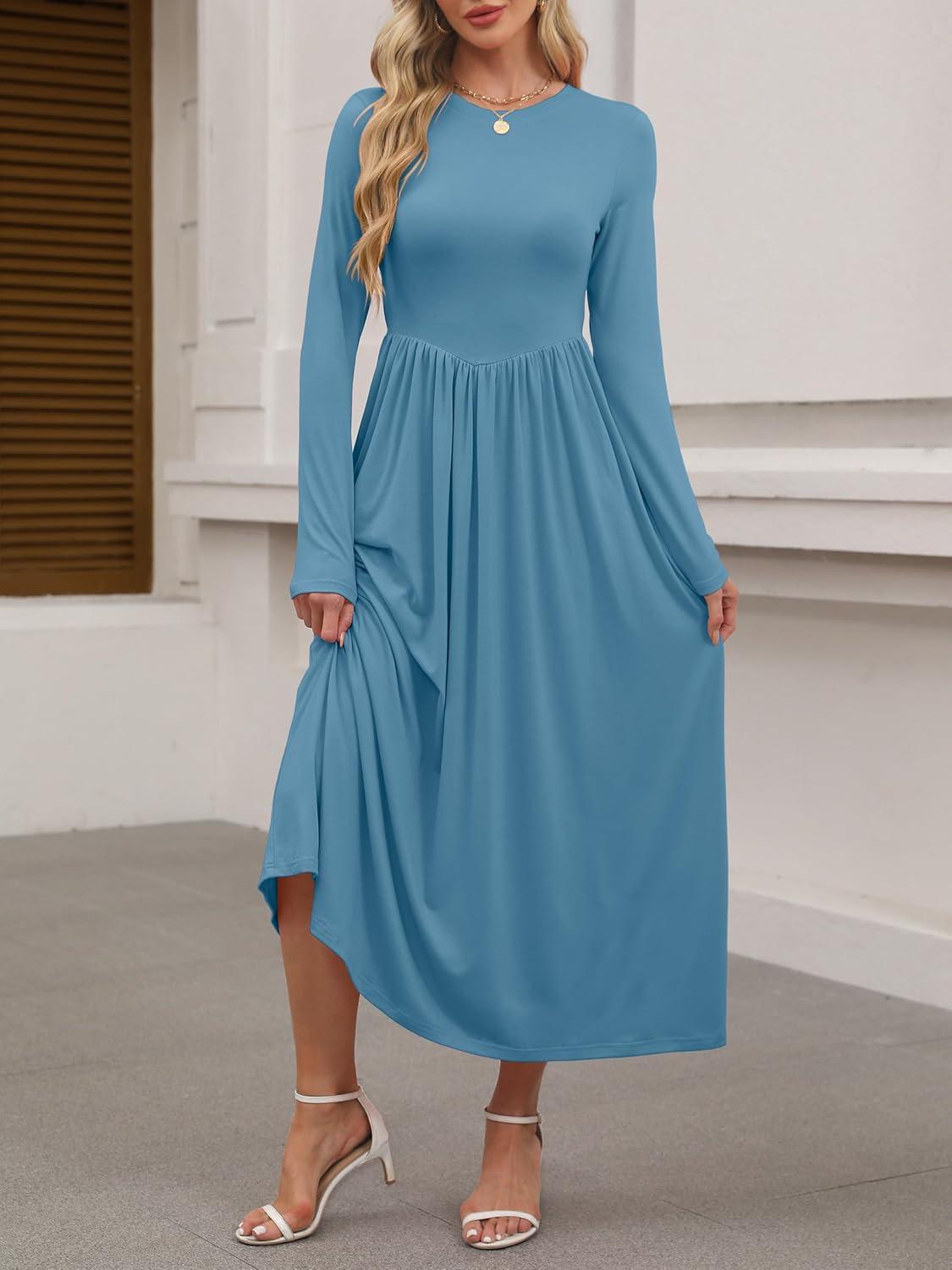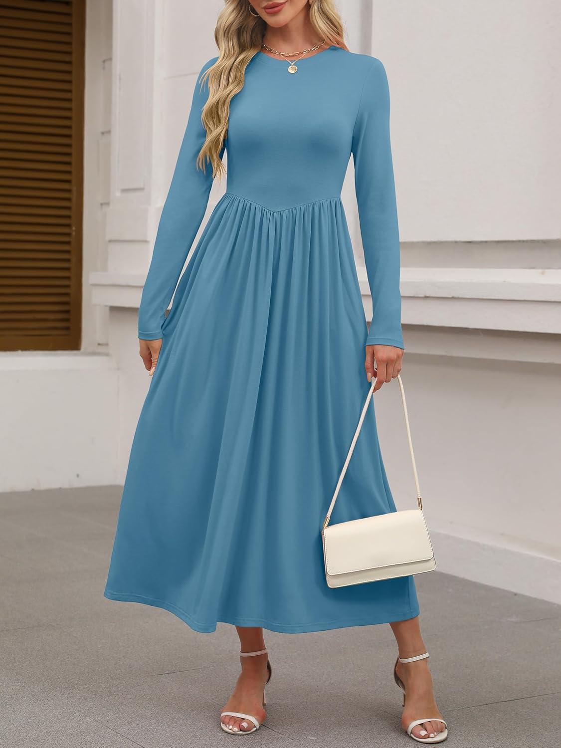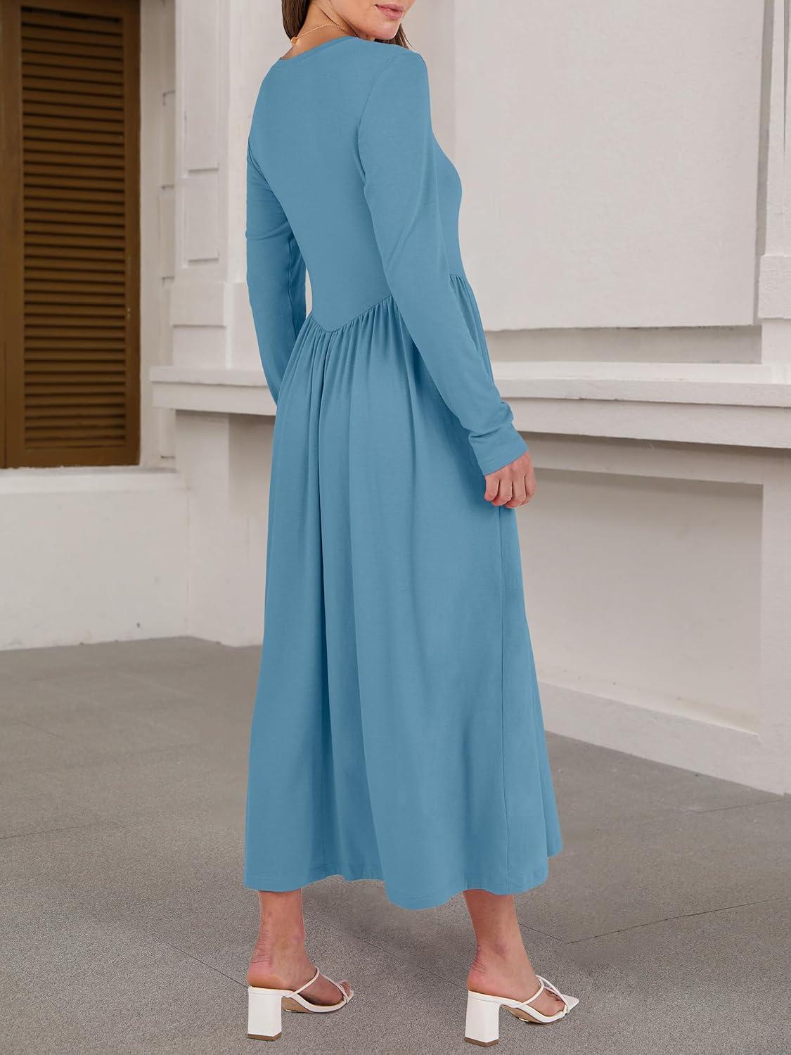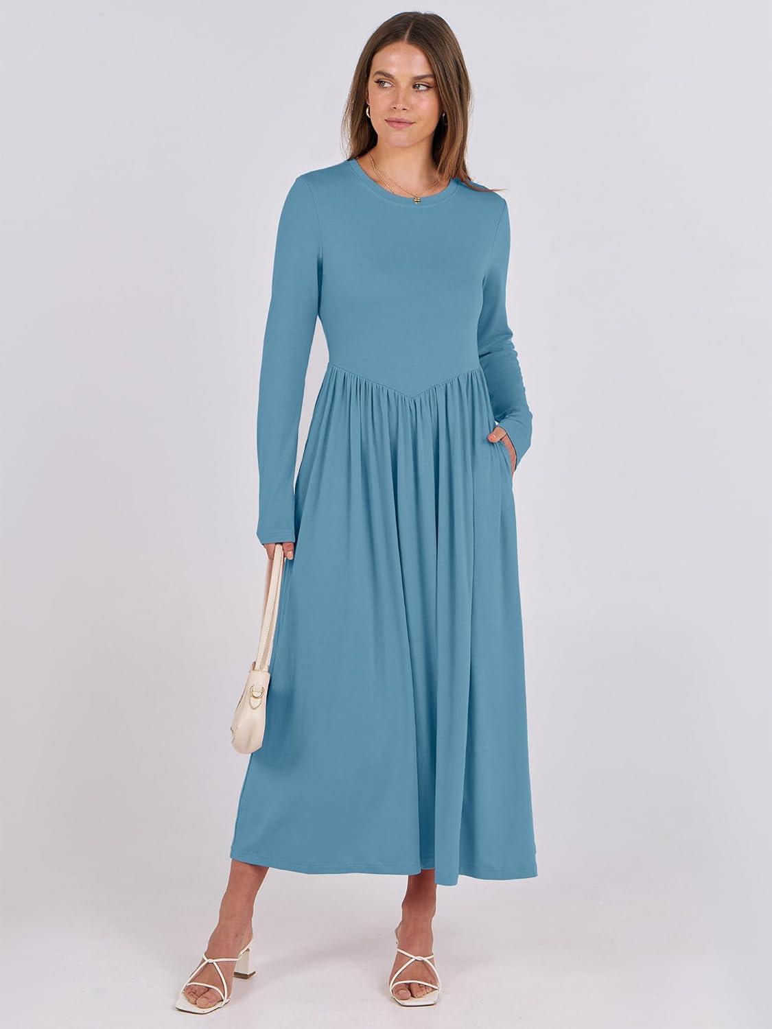 ANRABESS Women’s Long Sleeve Elegant Modest Drop Waist Maxi Dress 2025 Fall Casual Flowy Pleated Long Dresses with Pockets(Lake Green)