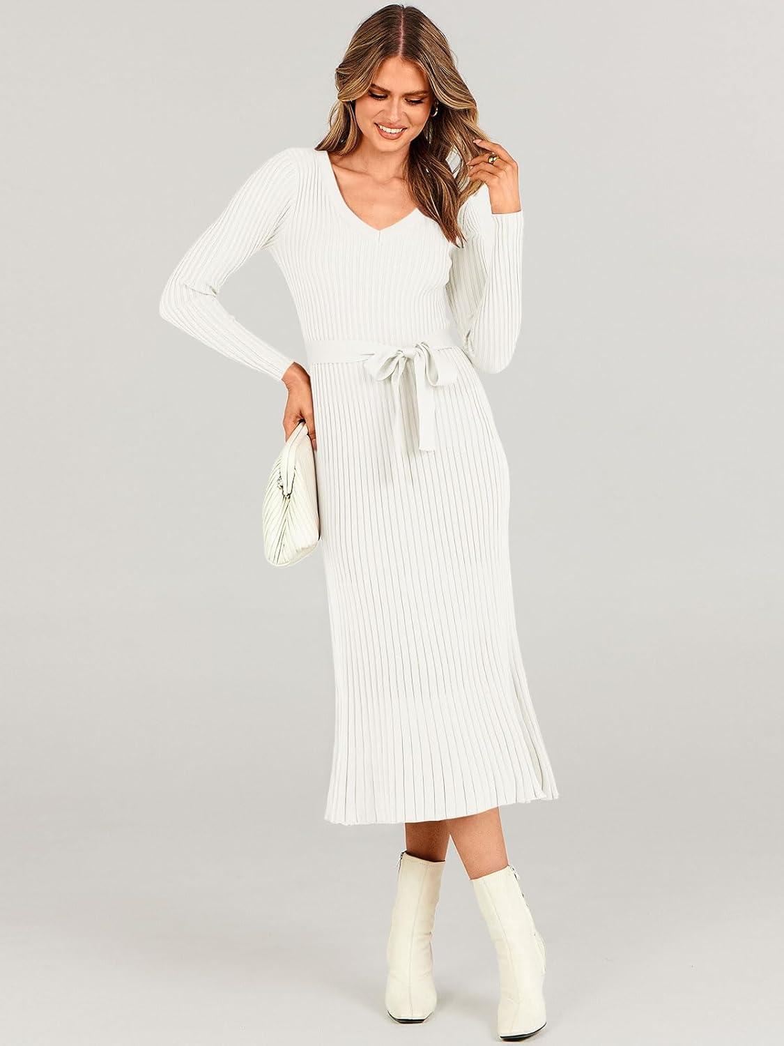 ANRABESS Womens Long Sleeve Fall Dress 2025 V Neck A-line Tie Waist Ribbed Knit Bodycon Midi Sweater Dresses(A-white)