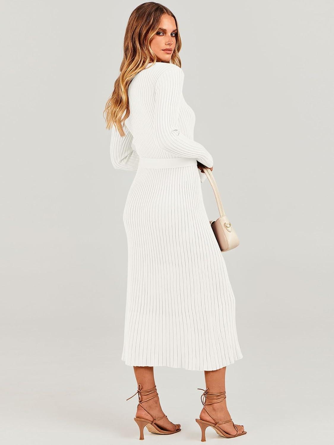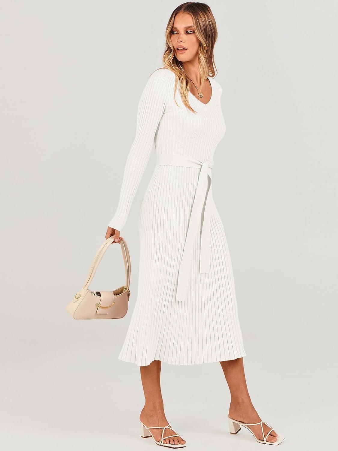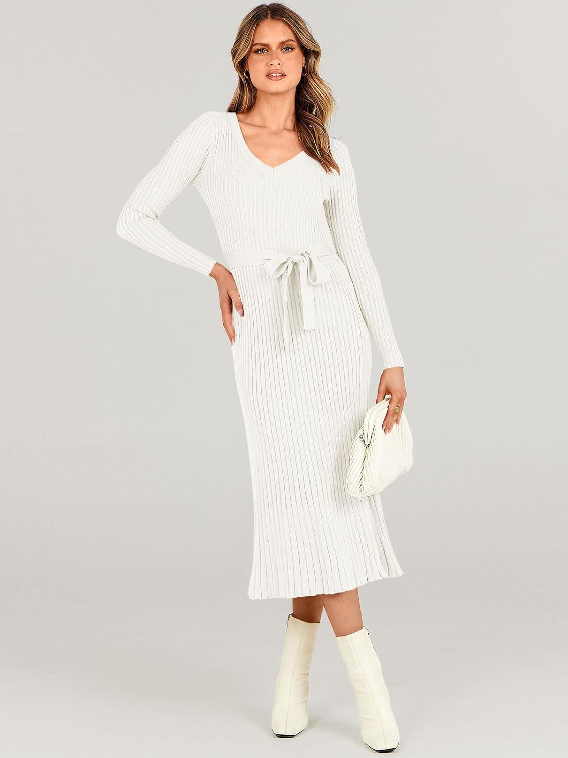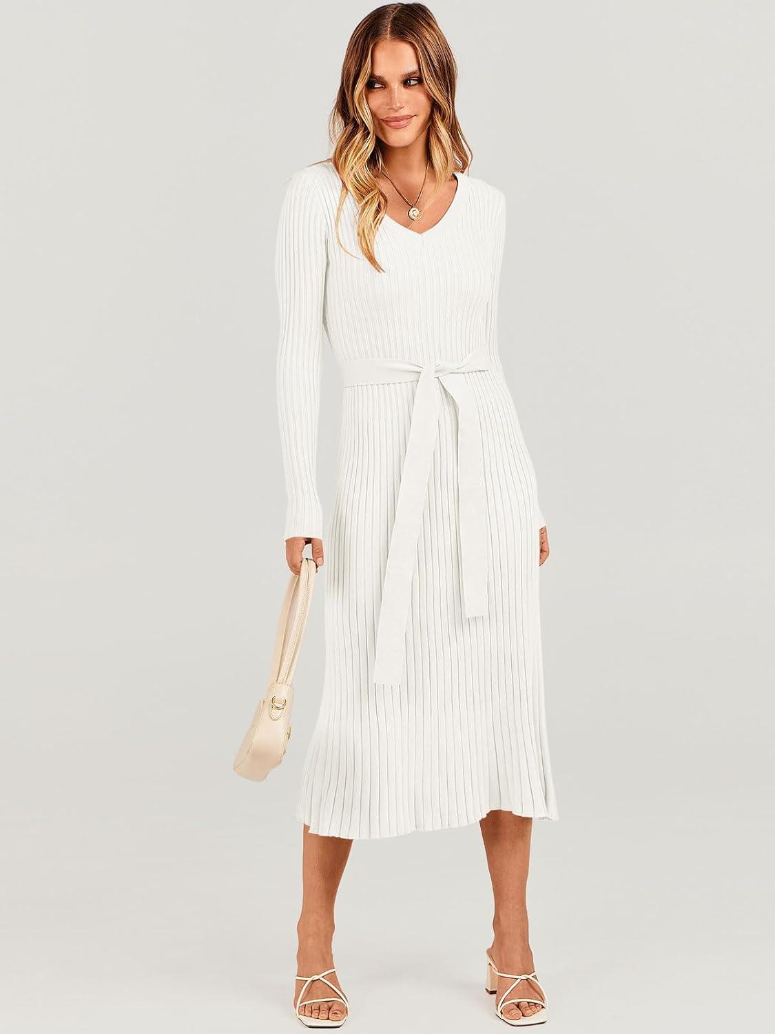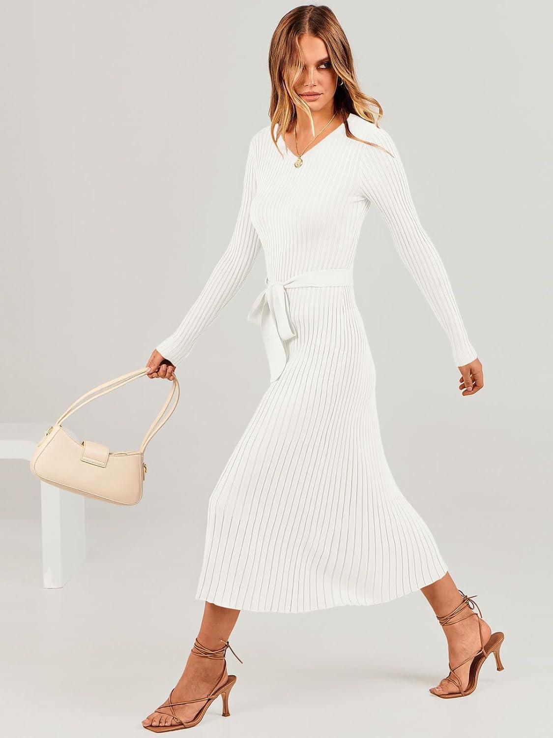 ANRABESS Womens Long Sleeve Fall Dress 2025 V Neck A-line Tie Waist Ribbed Knit Bodycon Midi Sweater Dresses(White)
