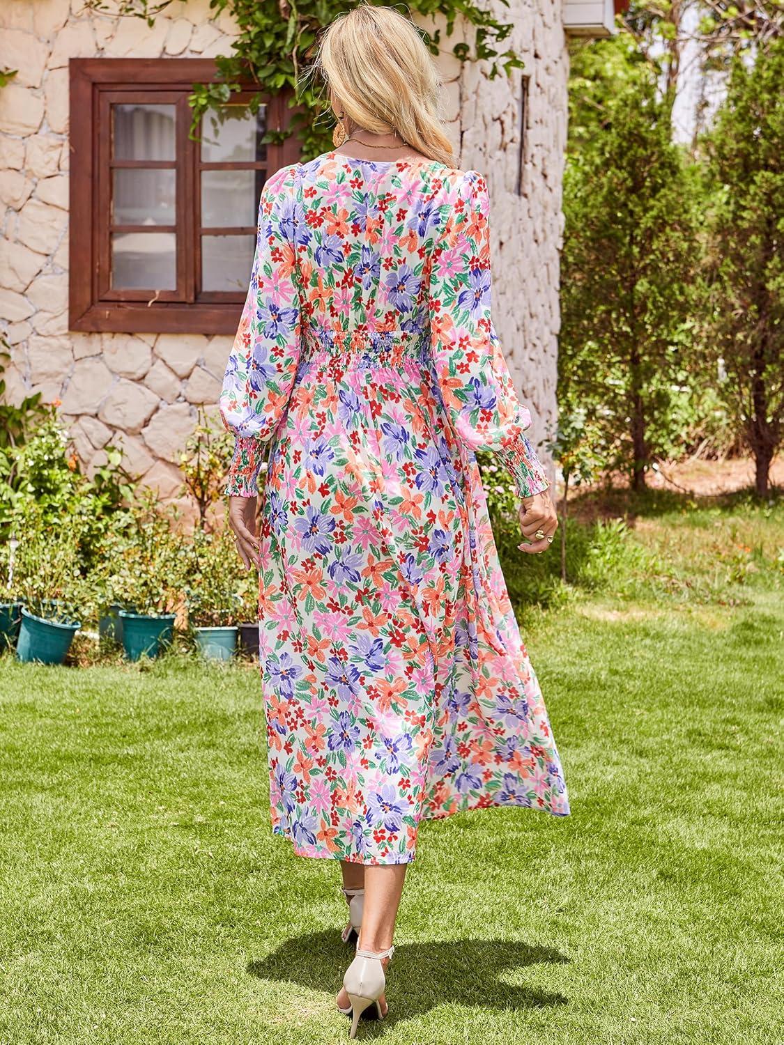 Women’s Boho Flowy Wrap V Neck Long Sleeve Floral Print Slit Beach Wedding Guest Long Maxi Dresses