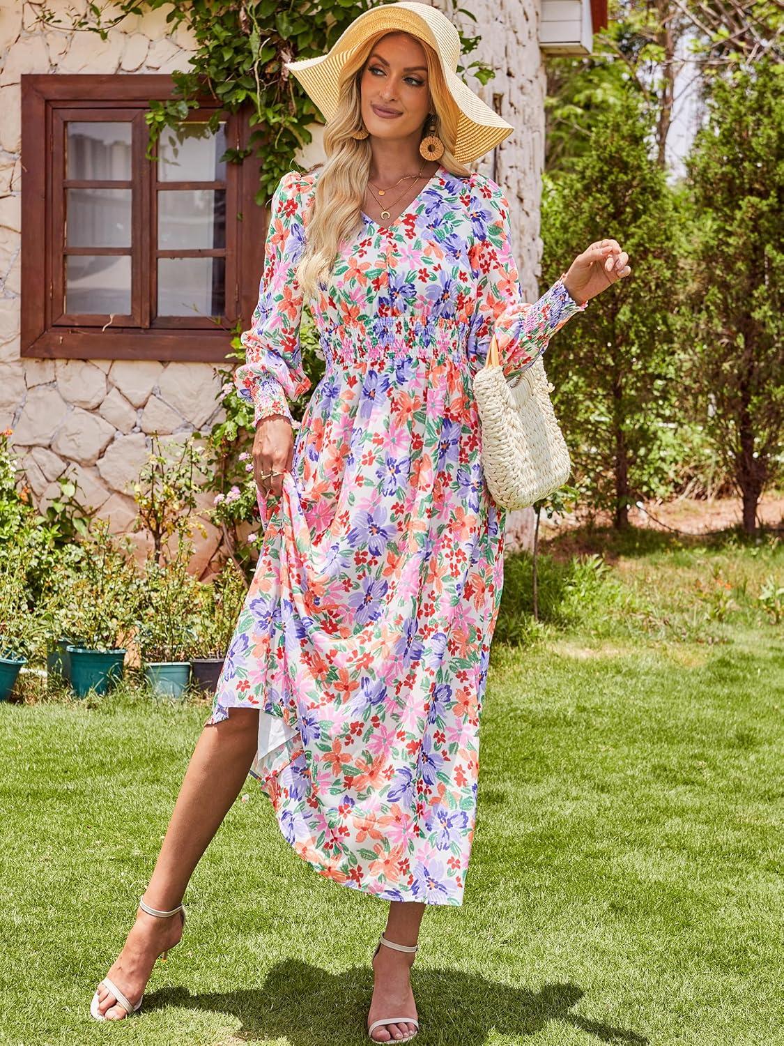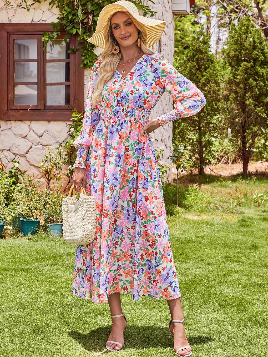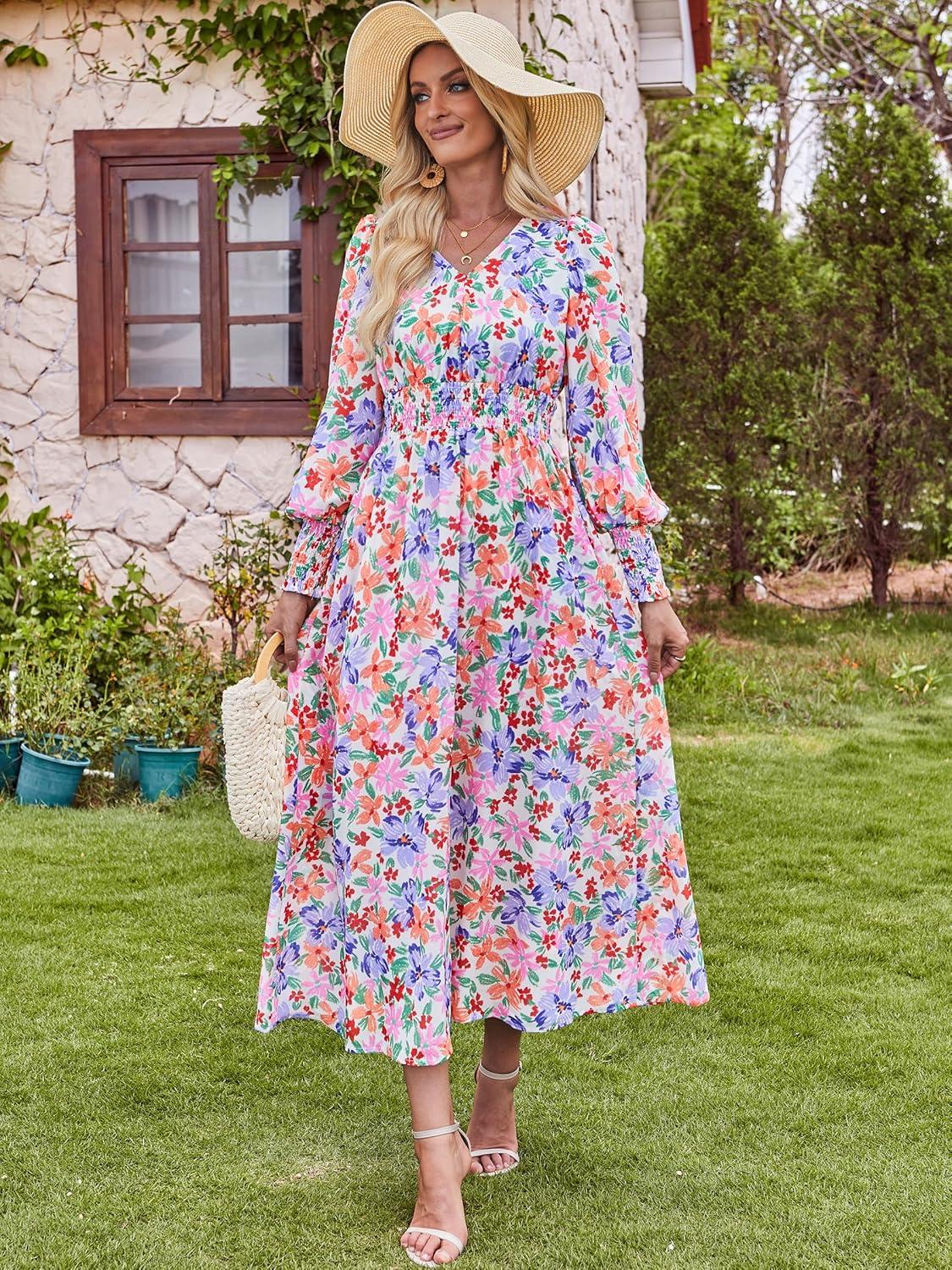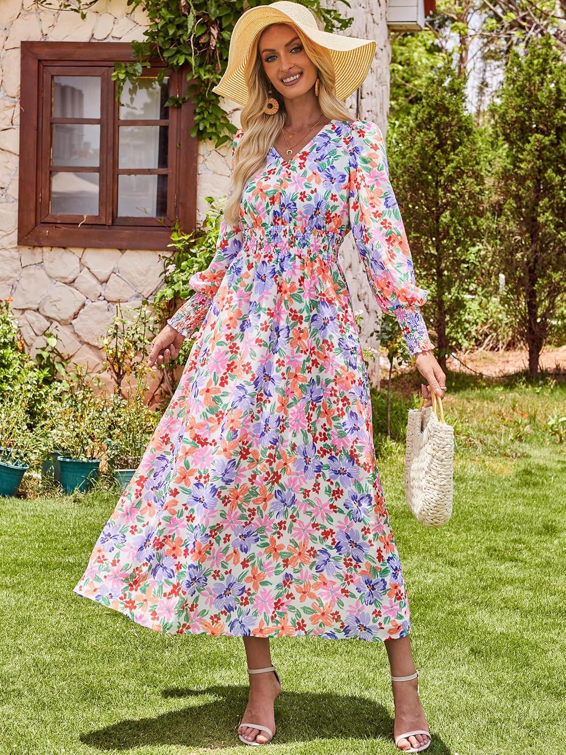 ANRABESS Women’s Long Sleeve Floral Maxi Dress Casual V Neck Chiffon Boho Flowy Beach Fall Wedding Guest Party Long Dresses(Crayon Multicolored Floral)
