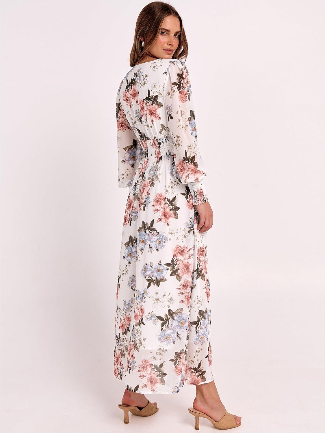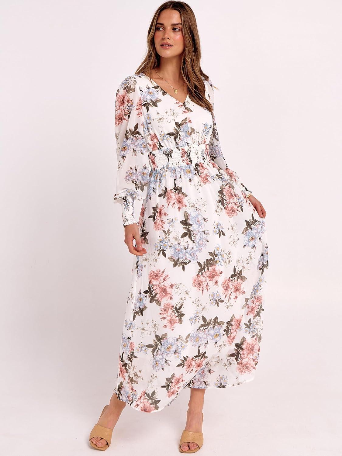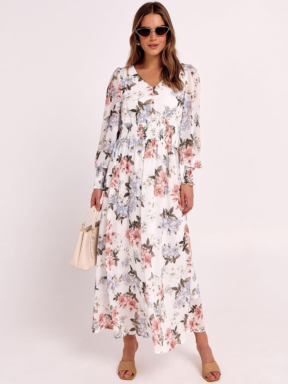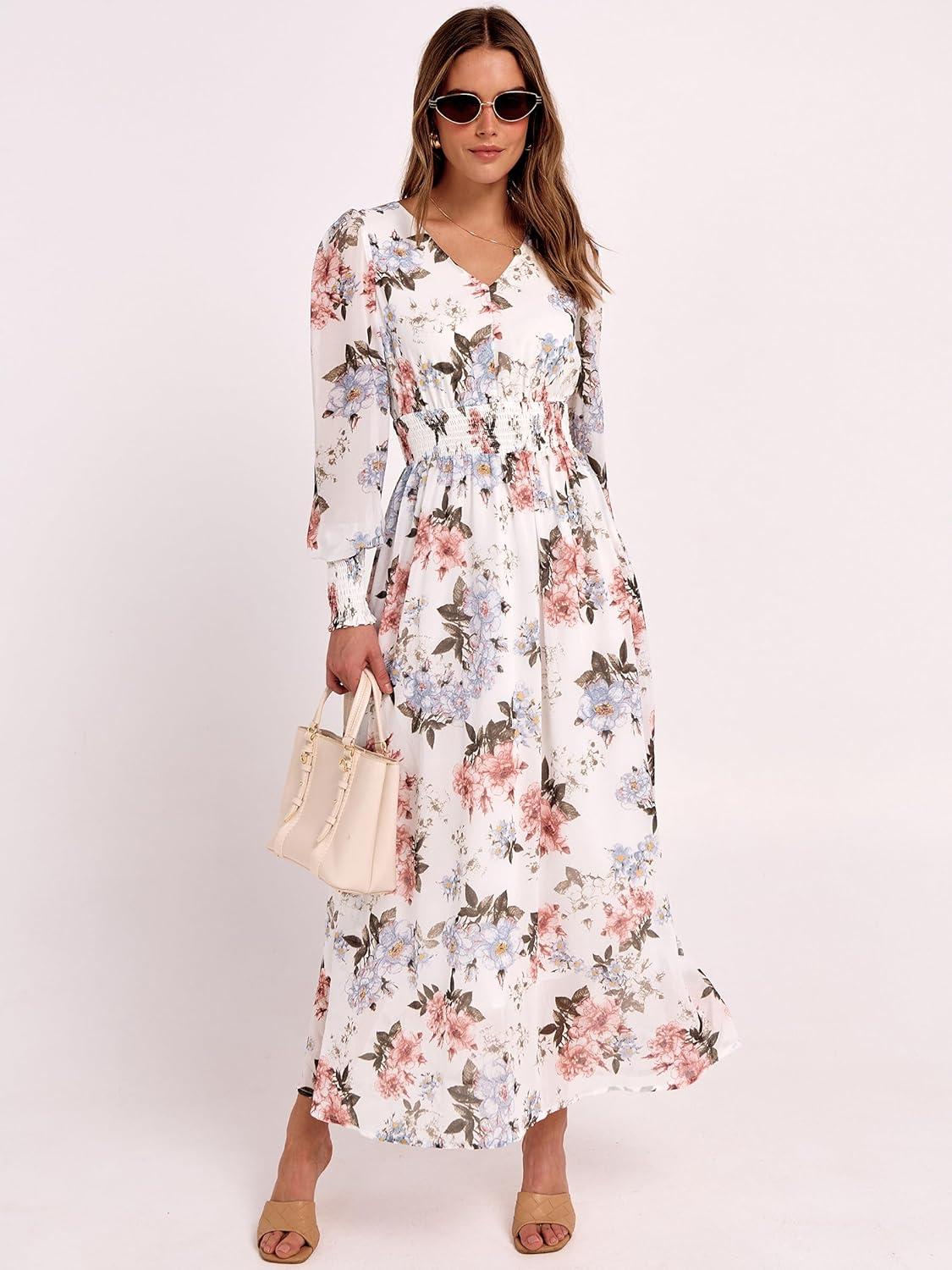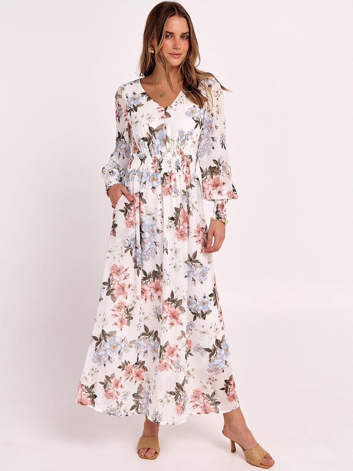 ANRABESS Women’s Long Sleeve Floral Maxi Dress Casual V Neck Chiffon Boho Flowy Beach Fall Wedding Guest Party Long Dresses(White Flor)