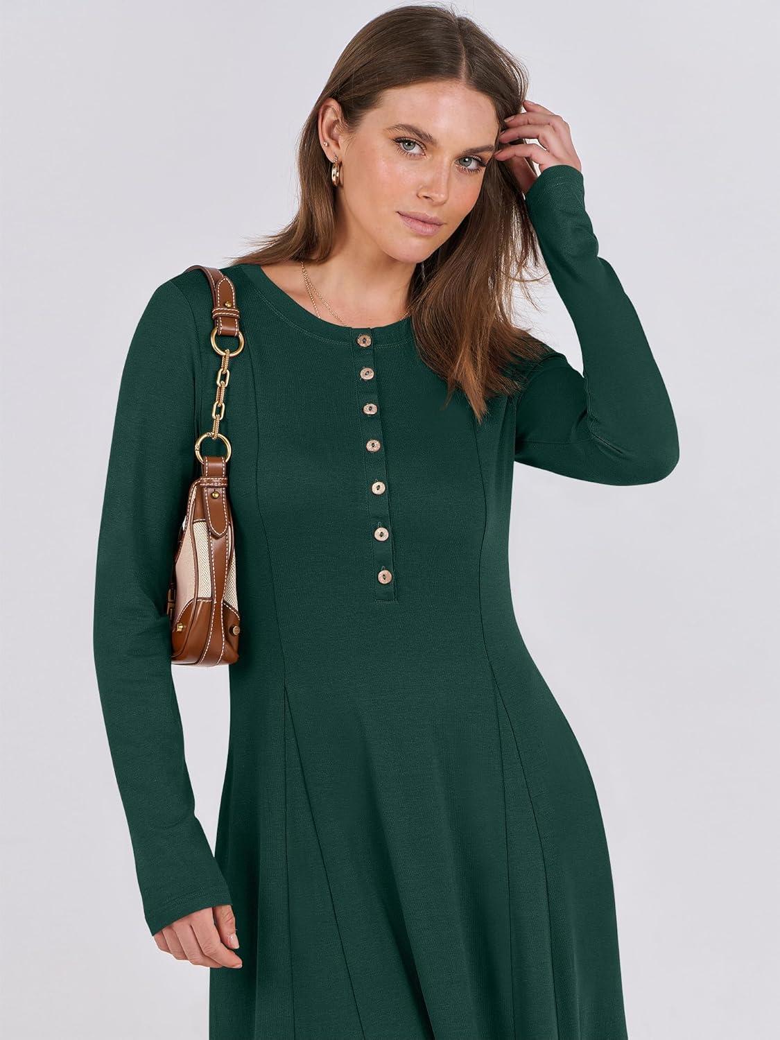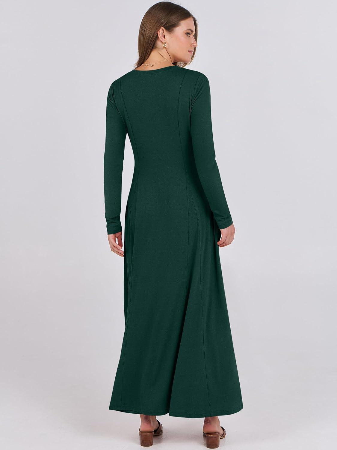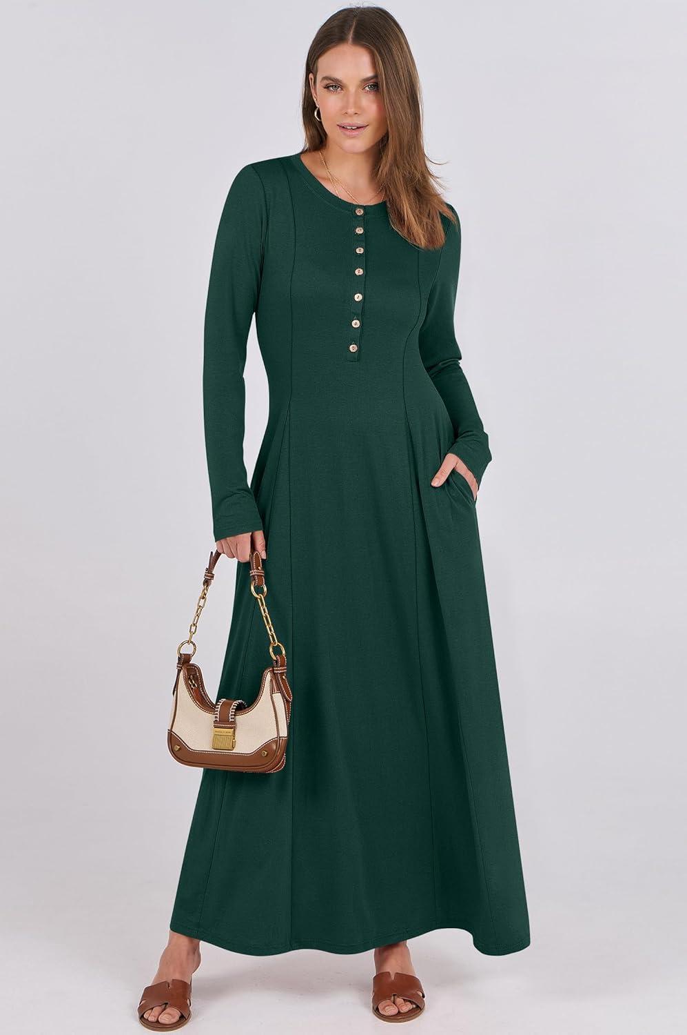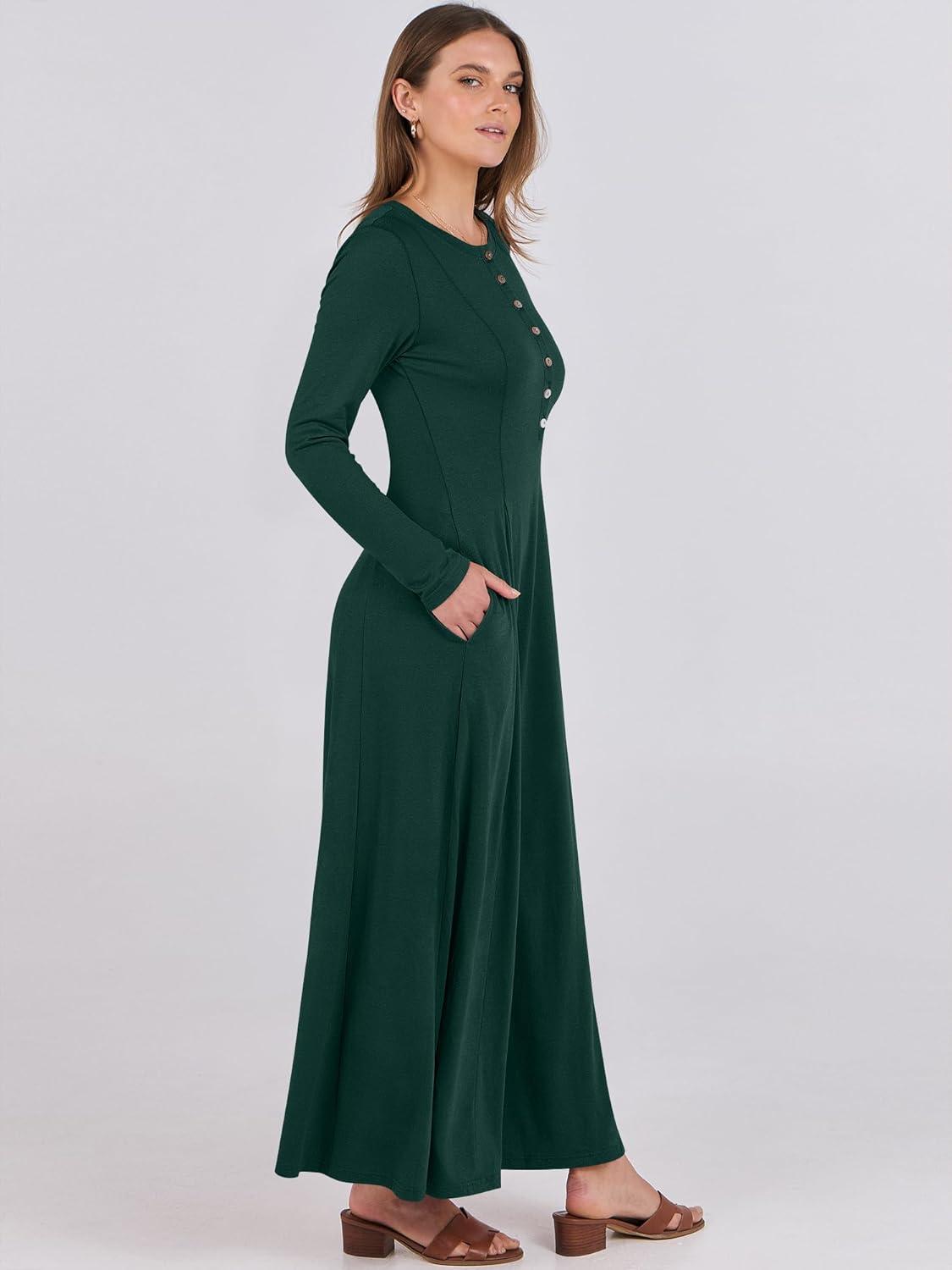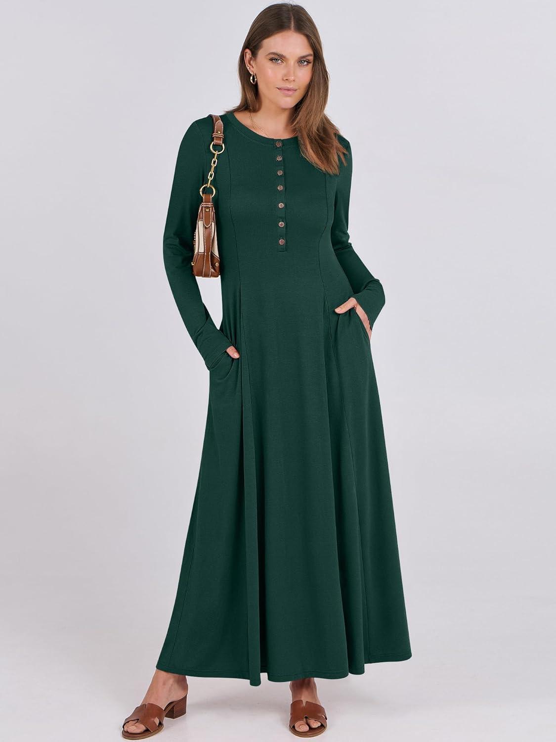 ANRABESS Women’s Long Sleeve Maxi Dress 2025 Fall Casual Button Fit & Flare A-Line Swing Flowy Long Dresses Winter Trendy(Deep Green)