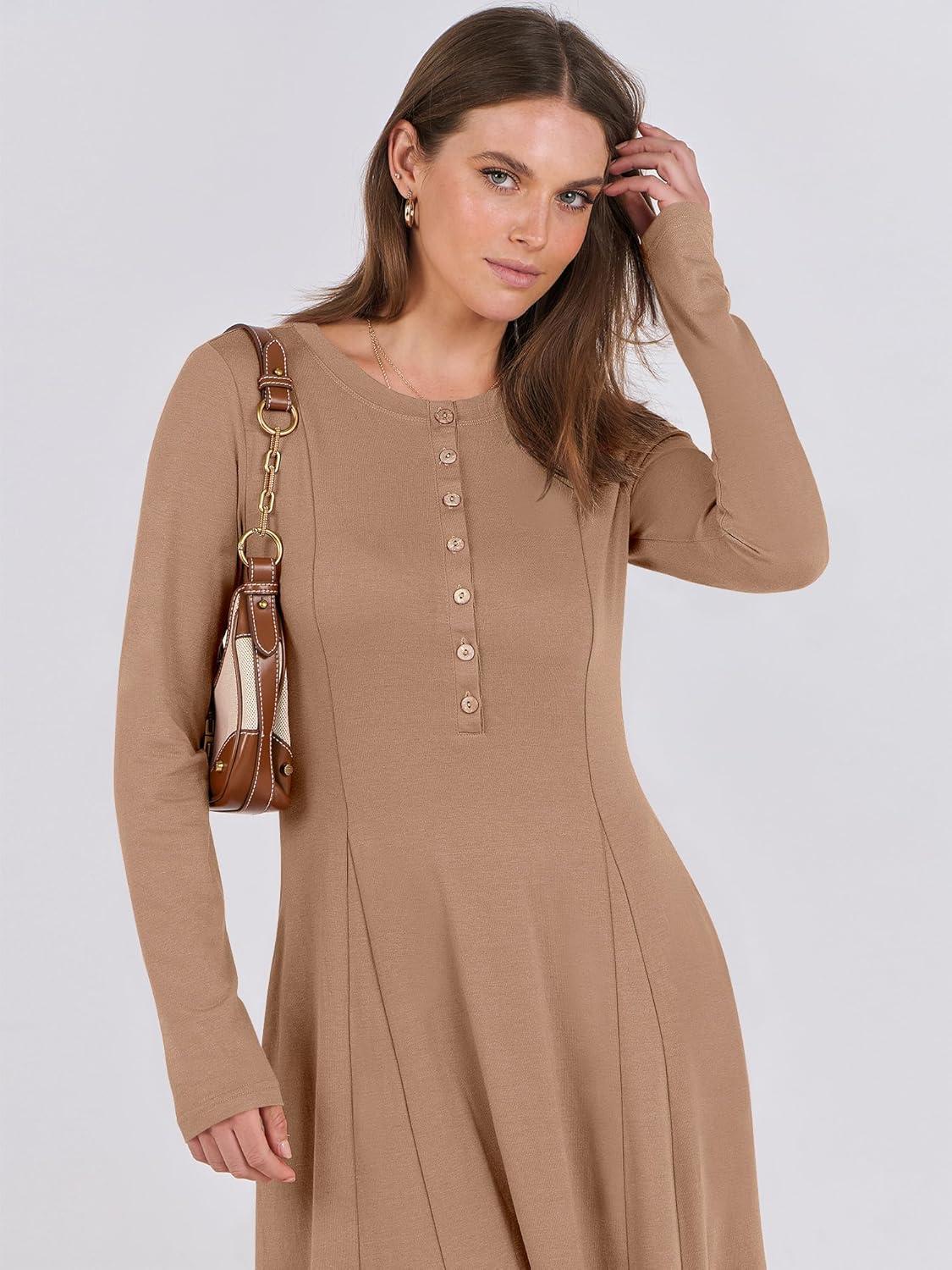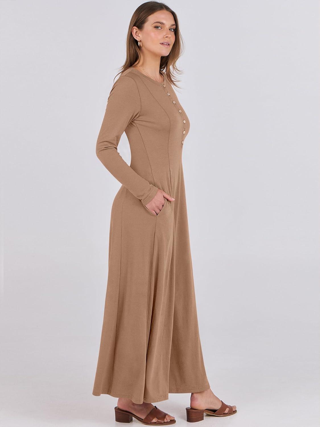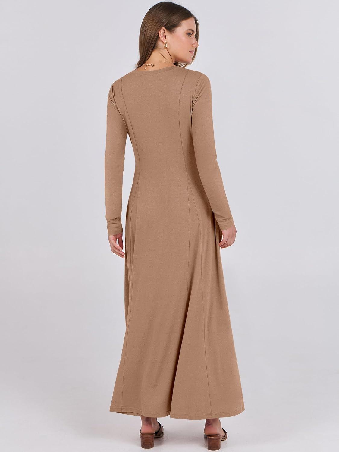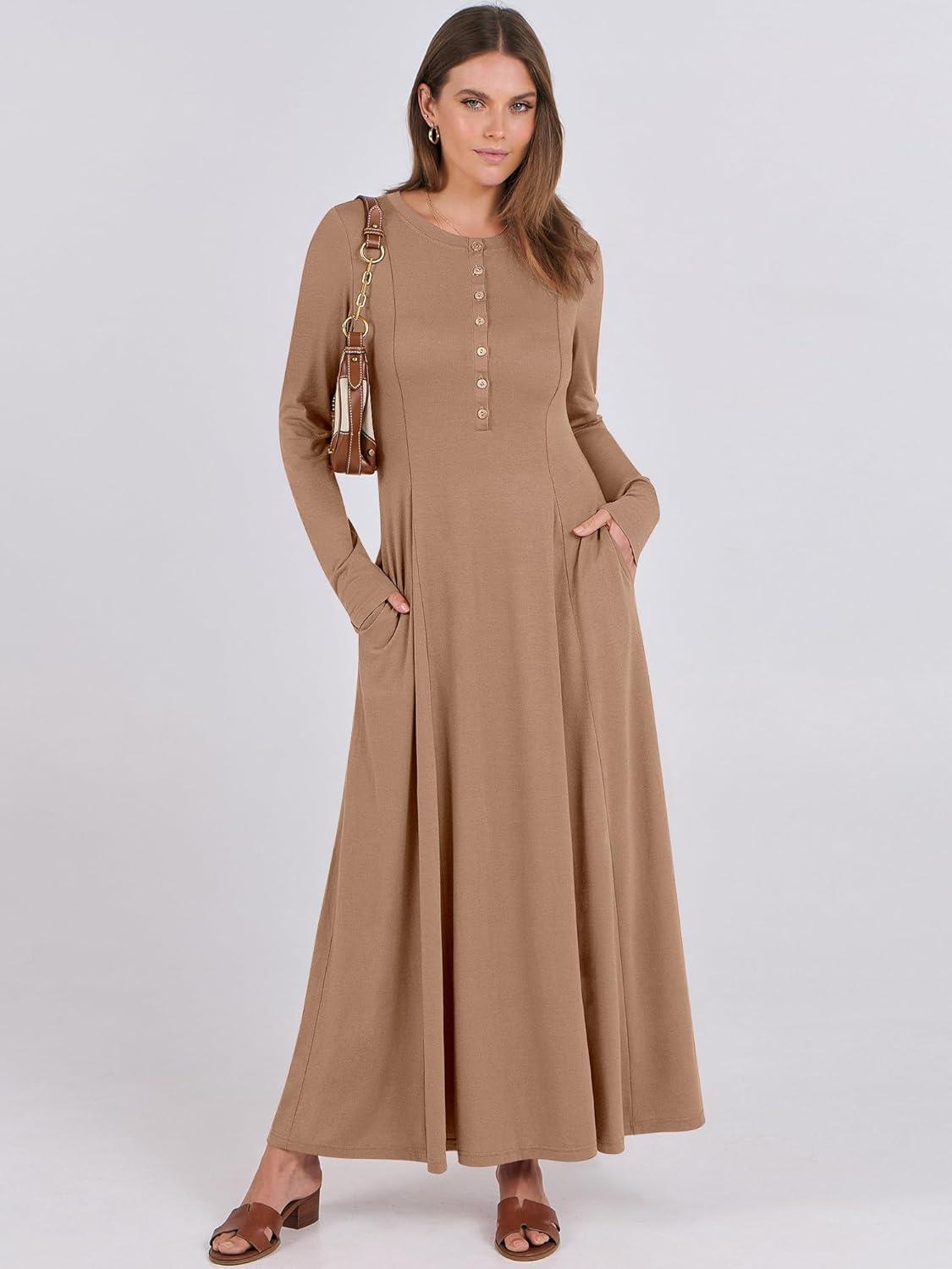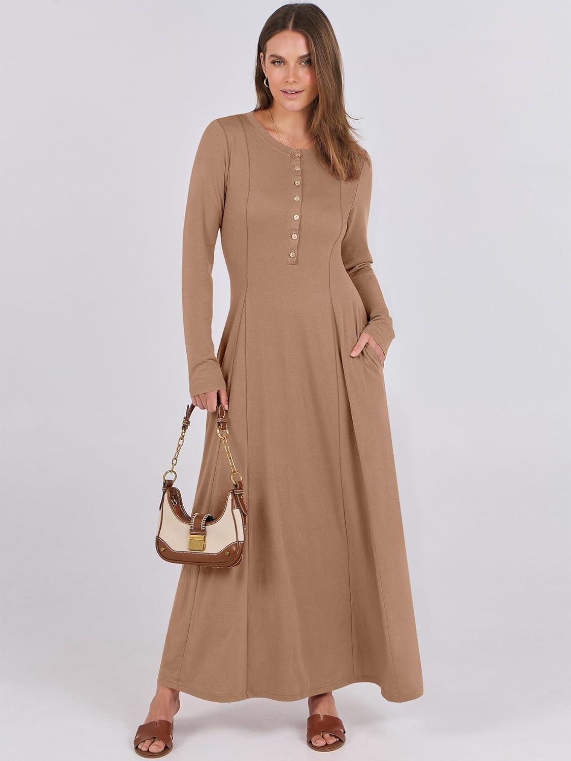 ANRABESS Women’s Long Sleeve Maxi Dress 2025 Fall Casual Button Fit & Flare A-Line Swing Flowy Long Dresses Winter Trendy(Khaki)