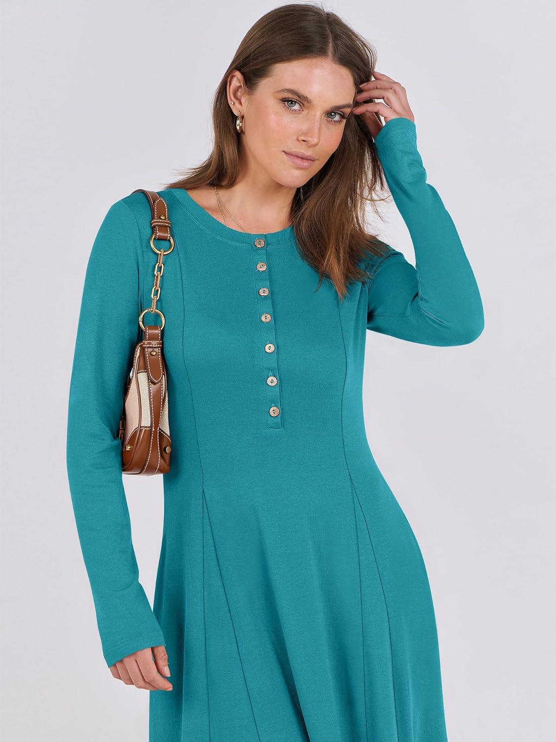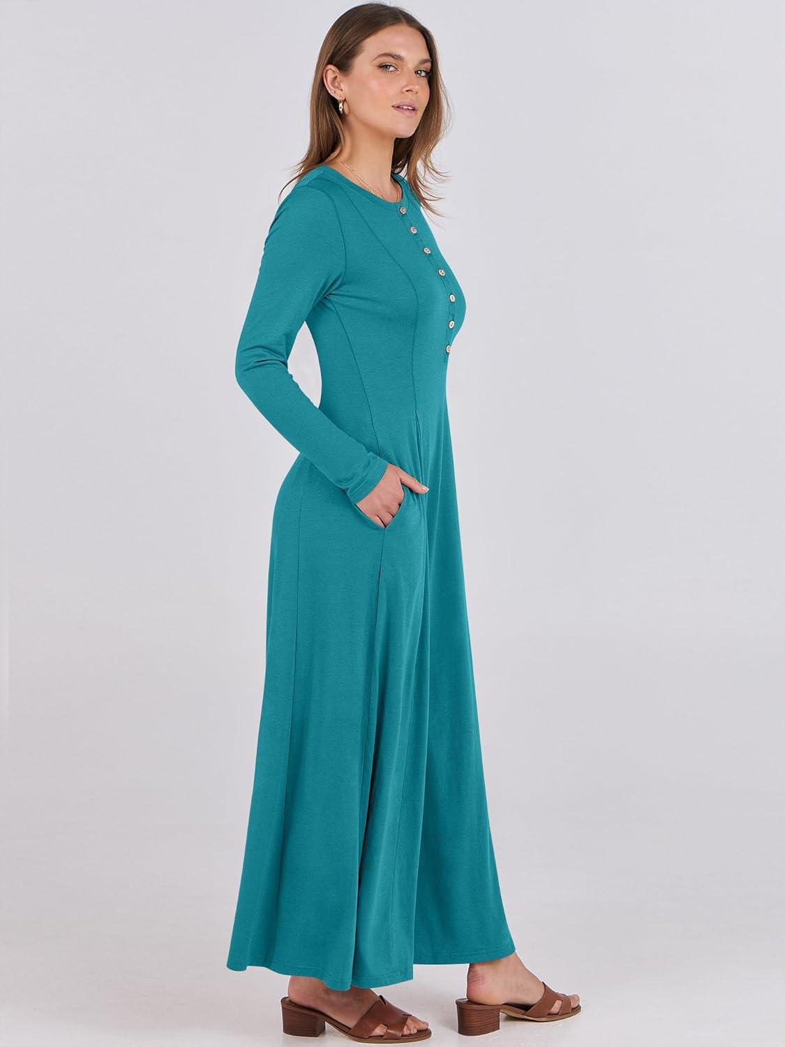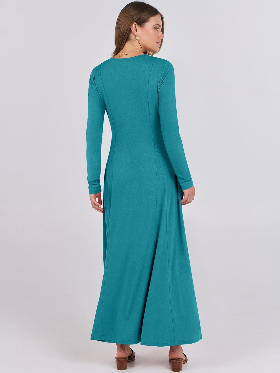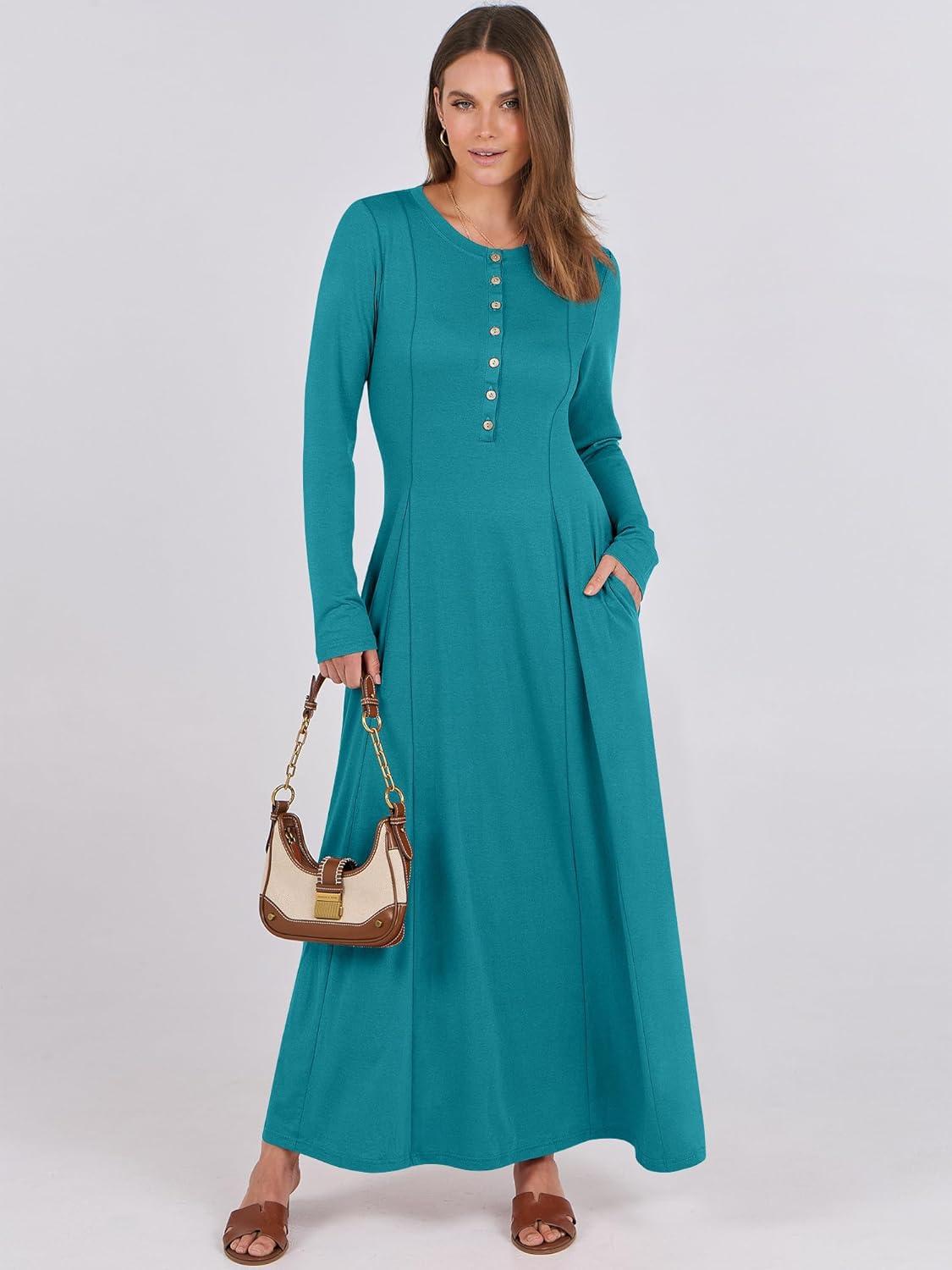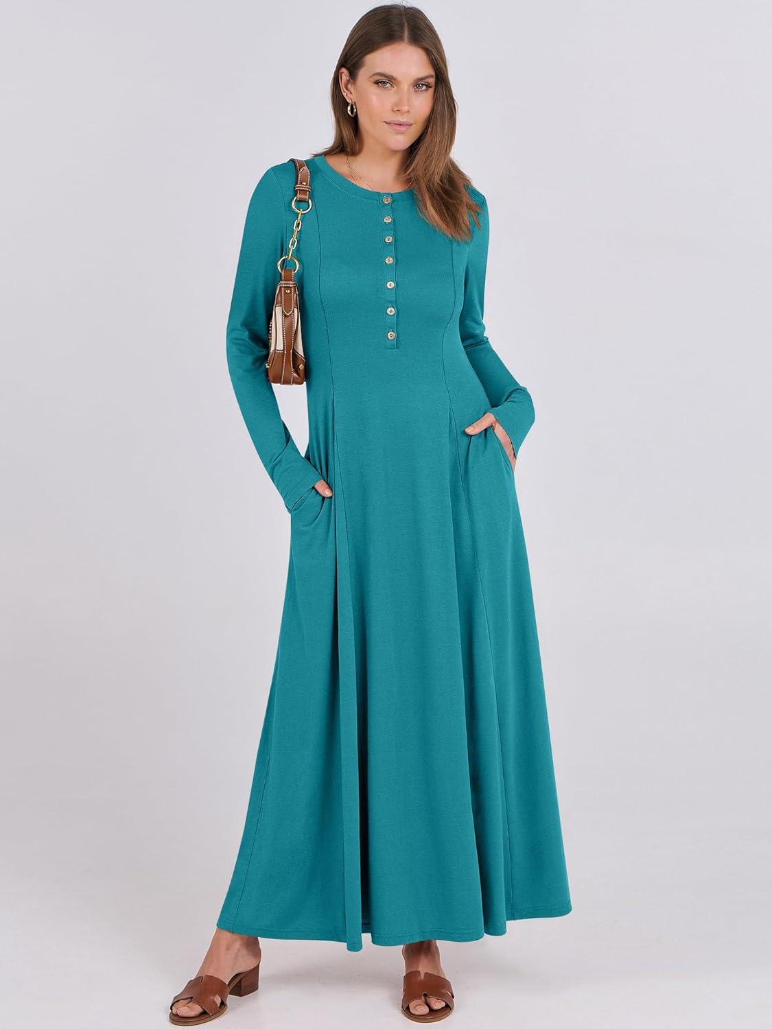ANRABESS Women’s Long Sleeve Maxi Dress 2025 Fall Casual Button Fit & Flare A-Line Swing Flowy Long Dresses Winter Trendy(Lake Green)