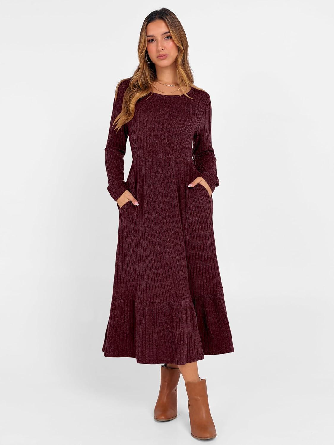 ANRABESS Womens Long Sleeve Midi Dress 2025 Fall Rib Knit Crew Neck A Line Soft Flowy Swing Dresses with Pocket Casual Trendy(Burgundy)