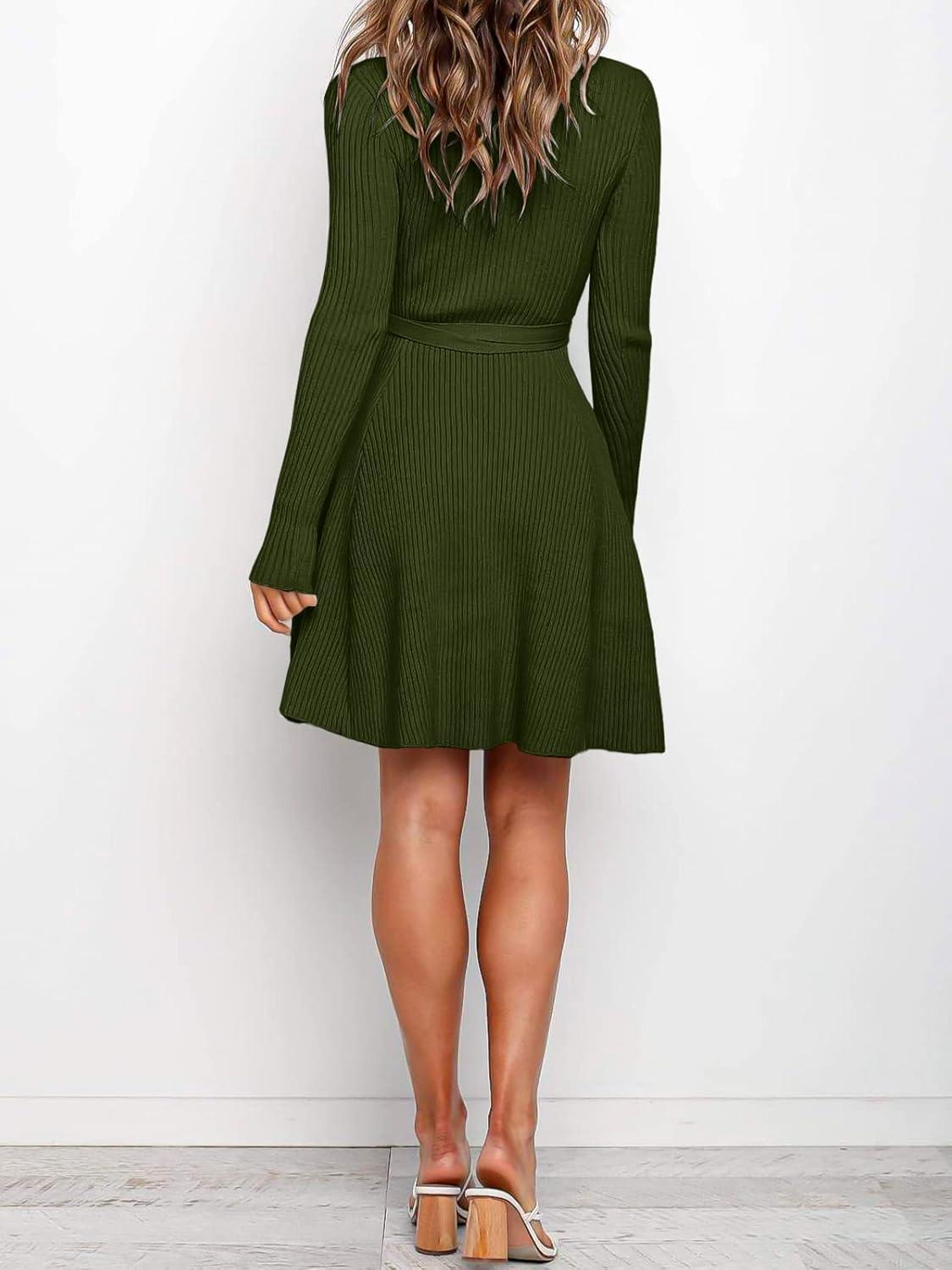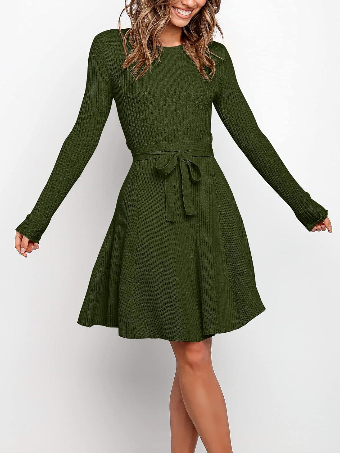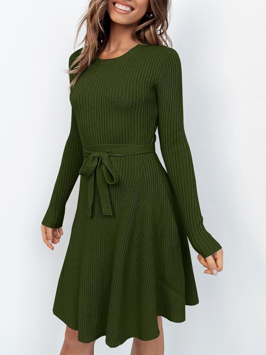 ANRABESS Women’s Long Sleeve Midi Dress Crewneck Tie Waist A-Line Swing Casual Bodycon Ribbed Knit 2025 Fall Sweater Dress(Army Green)
