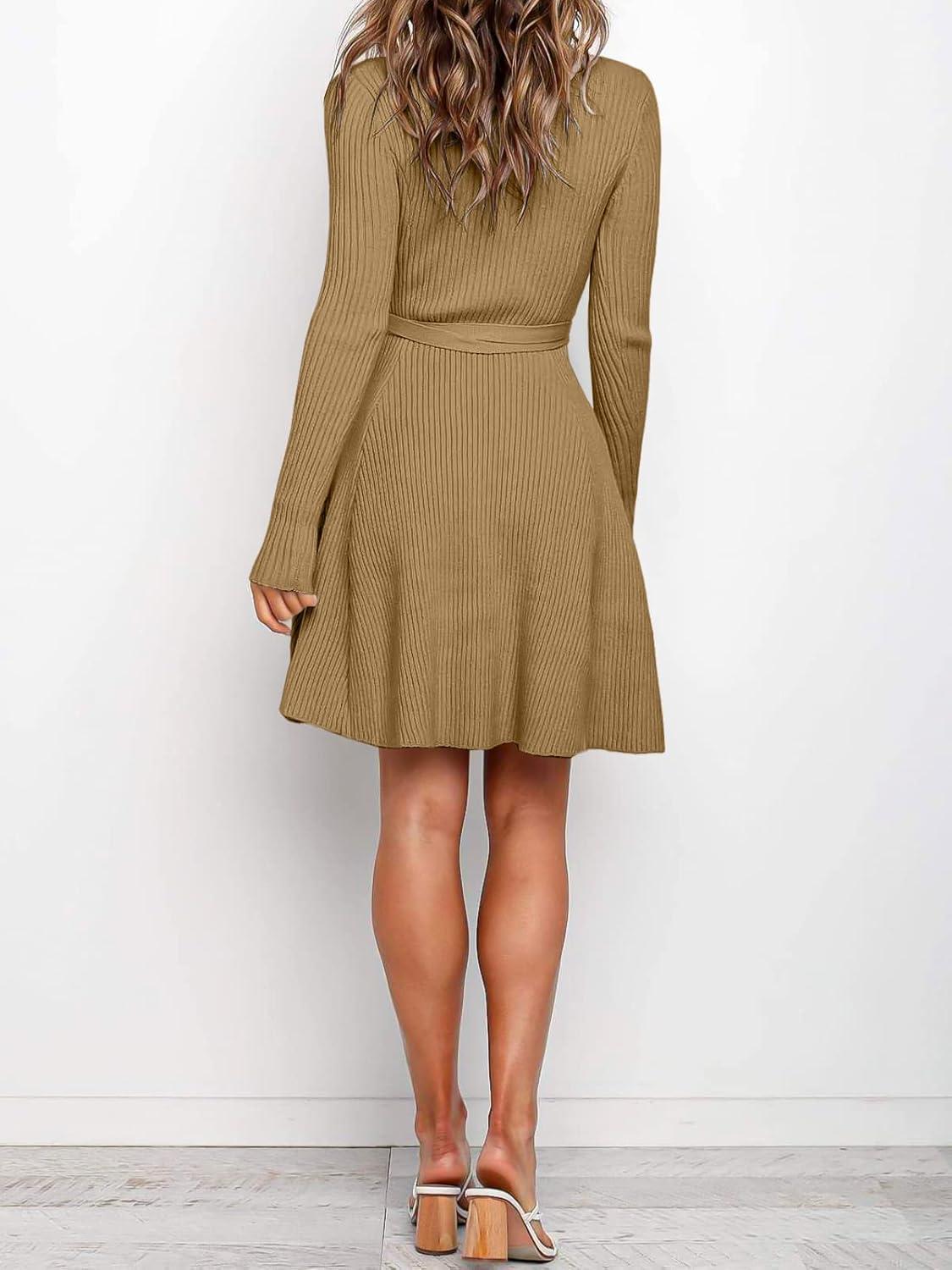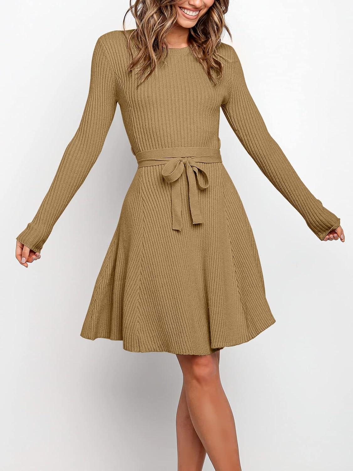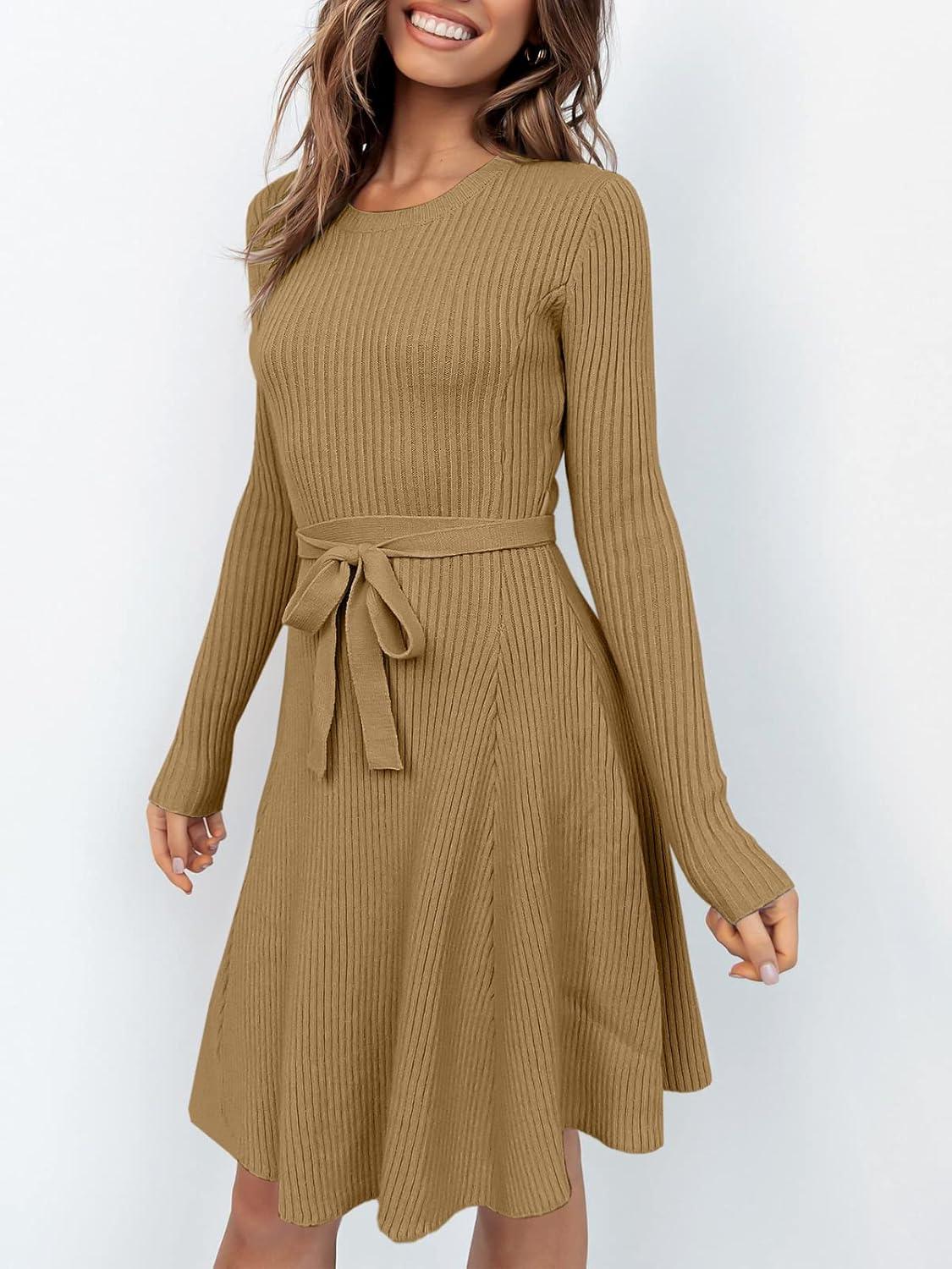 ANRABESS Women's Long Sleeve Midi Dress Crewneck Tie Waist A-Line Swing Casual Bodycon Ribbed Knit 2025 Fall Sweater Dress