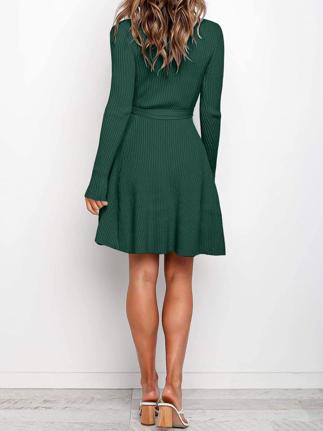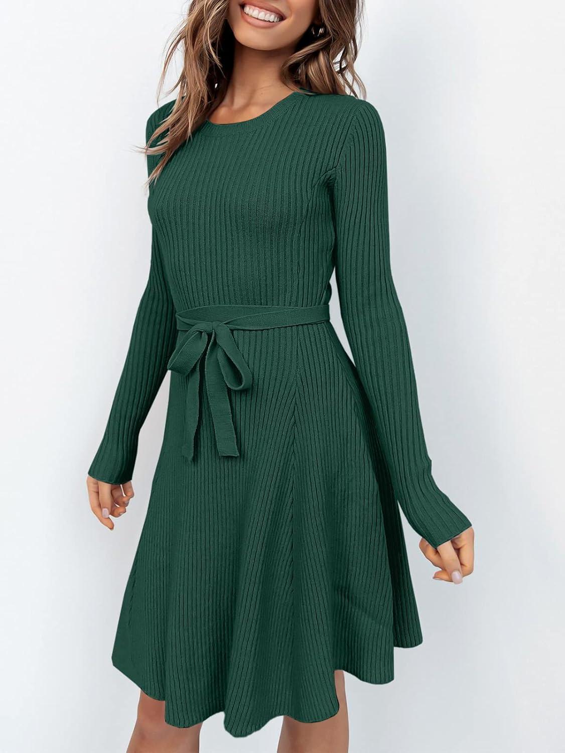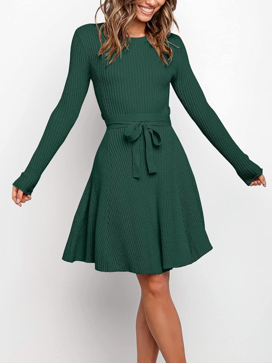 ANRABESS Women’s Long Sleeve Midi Dress Crewneck Tie Waist A-Line Swing Casual Bodycon Ribbed Knit 2025 Fall Sweater Dress(Green)