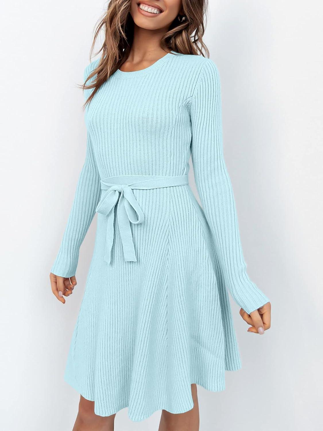 ANRABESS Women’s Long Sleeve Midi Dress Crewneck Tie Waist A-Line Swing Casual Bodycon Ribbed Knit 2025 Fall Sweater Dress(Light Blue)