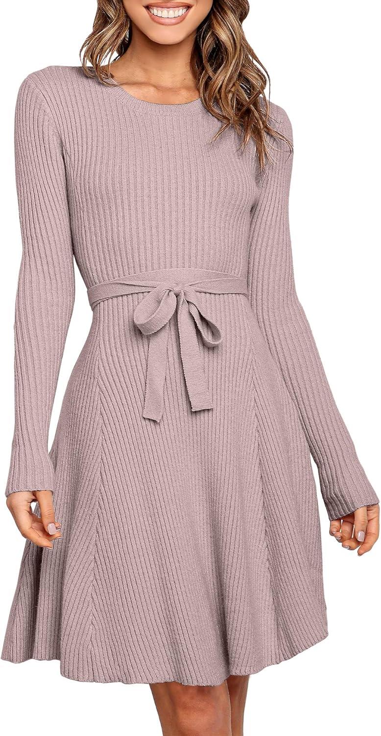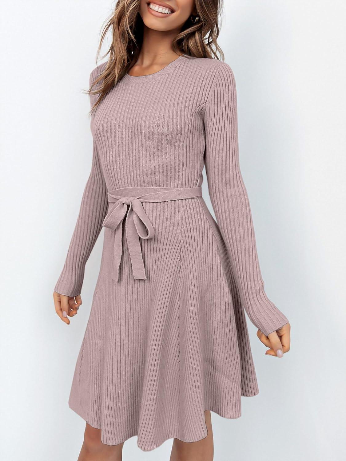 ANRABESS Women's Long Sleeve Midi Dress Crewneck Tie Waist A-Line Swing Casual Bodycon Ribbed Knit 2025 Fall Sweater Dress