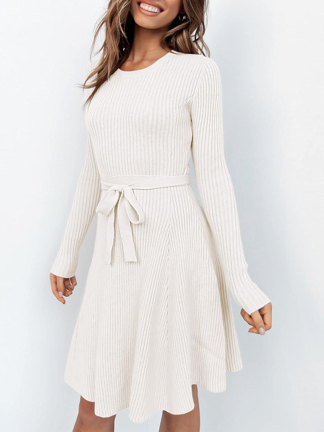 ANRABESS Women’s Long Sleeve Midi Dress Crewneck Tie Waist A-Line Swing Casual Bodycon Ribbed Knit 2025 Fall Sweater Dress(White)