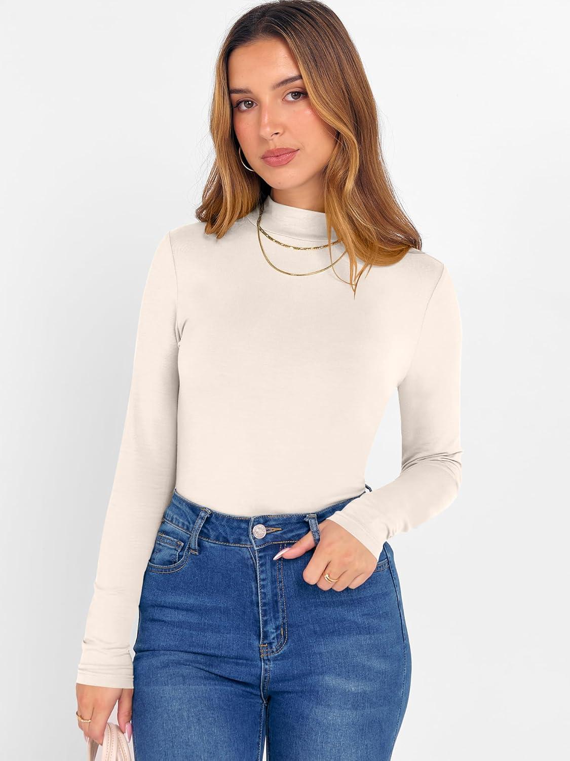 ANRABESS Womens Long Sleeve Mock Neck Tops Slim Fitted Basic Layer Office Work Shirts 2025 Fall Outfits Y2K Clothes(Beige)