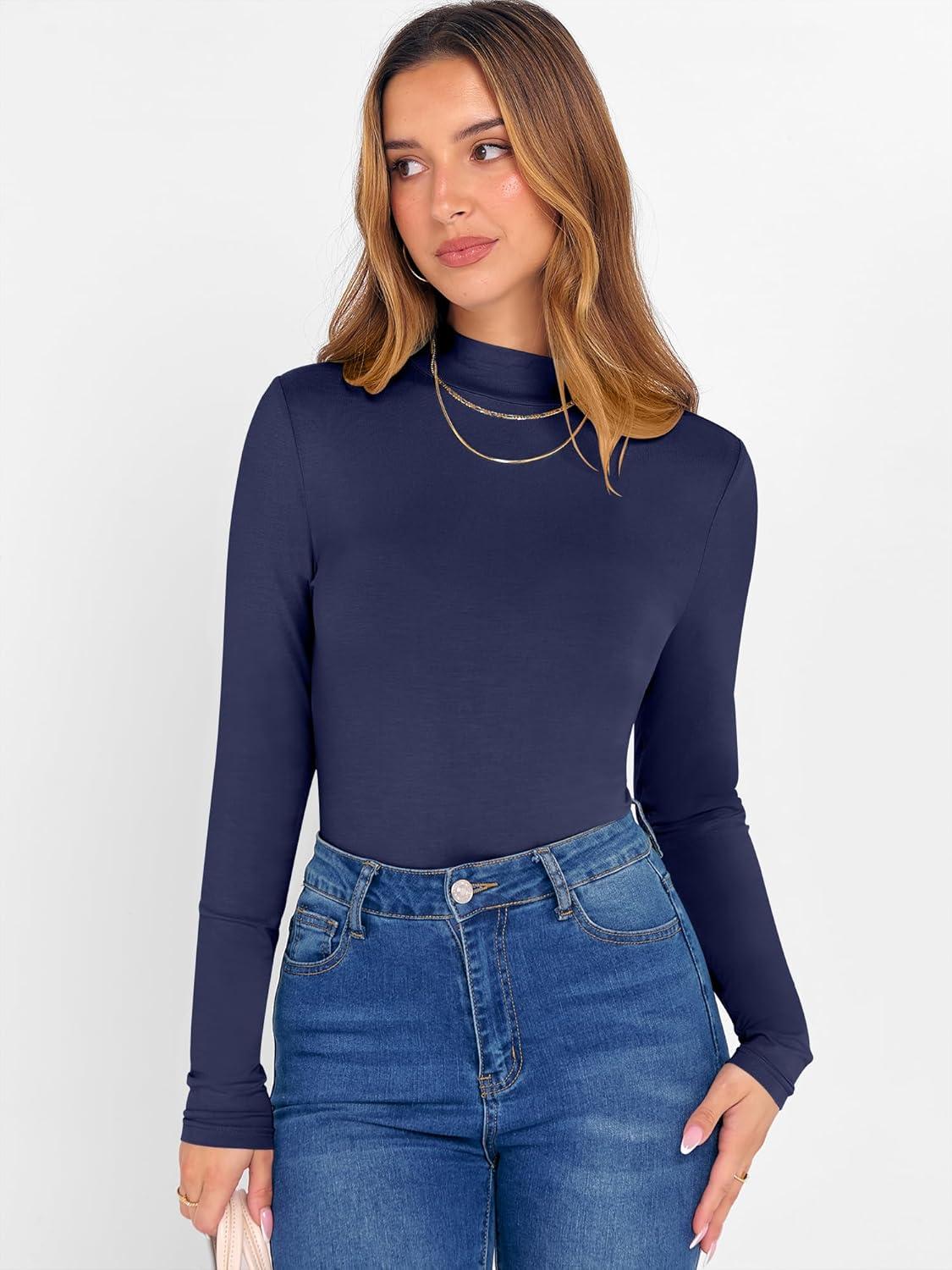 ANRABESS Womens Long Sleeve Mock Neck Tops Slim Fitted Basic Layer Office Work Shirts 2025 Fall Outfits Y2K Clothes(Navy Blue)