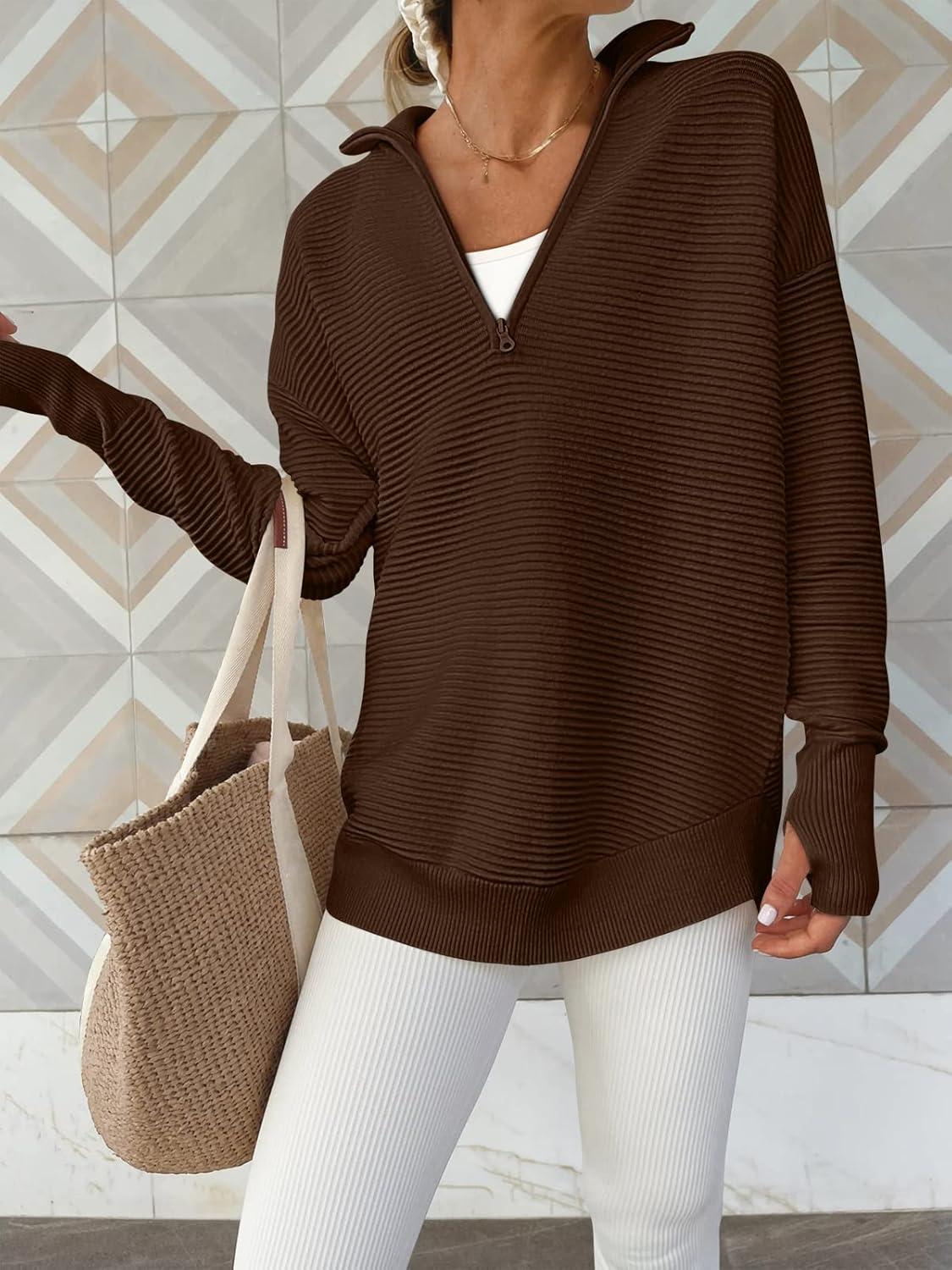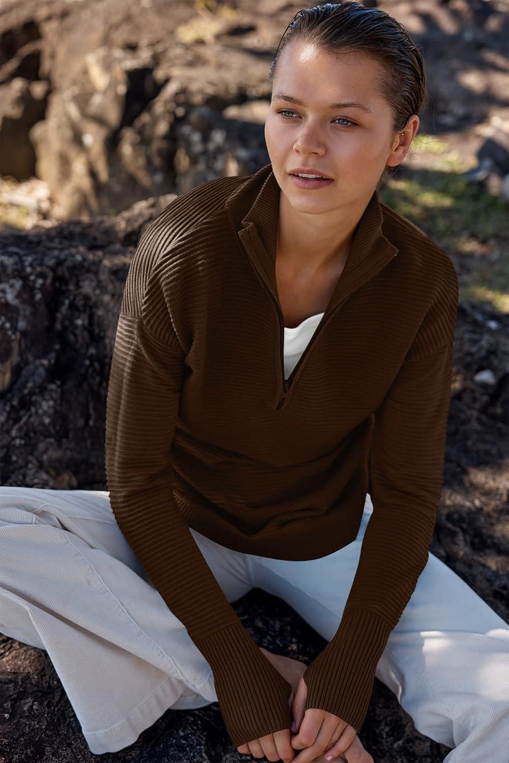 ANRABESS Womens Long Sleeve Quarter Zip Pullover Sweater Casual Loose V Neck Collared Ribbed Knit Jumper Tops Thumb Hole(Coffee)