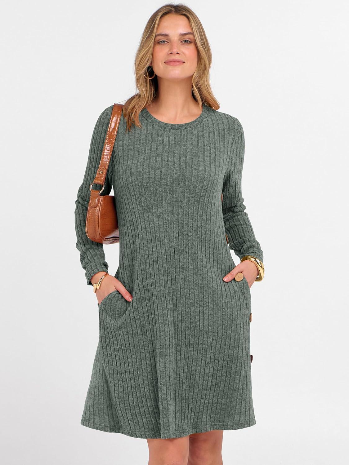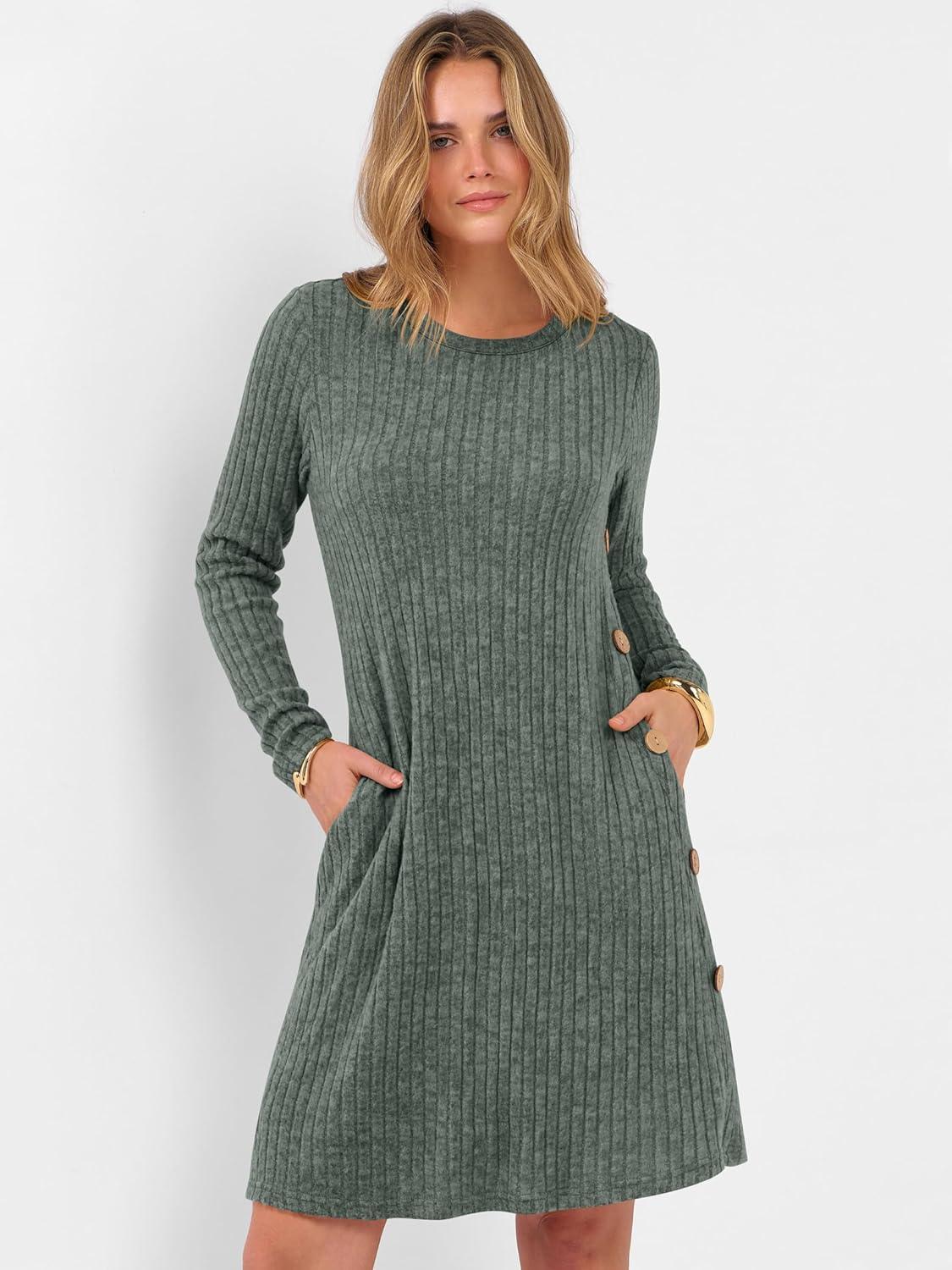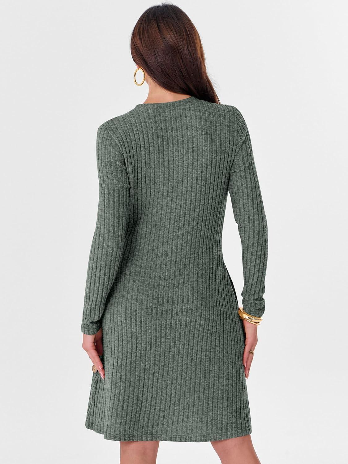 ANRABESS Womens Long Sleeve Ribbed Knit Sweater Dresses 2025 Fall Winter Casual Lounge Short Tunic Dress with Pockets Buttons(Green Grey)