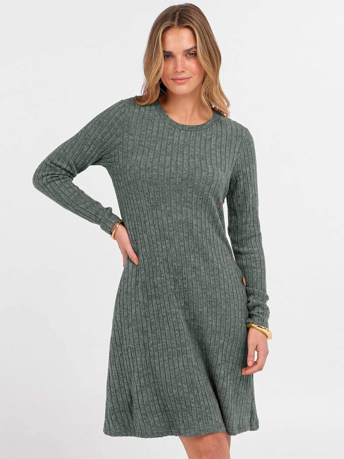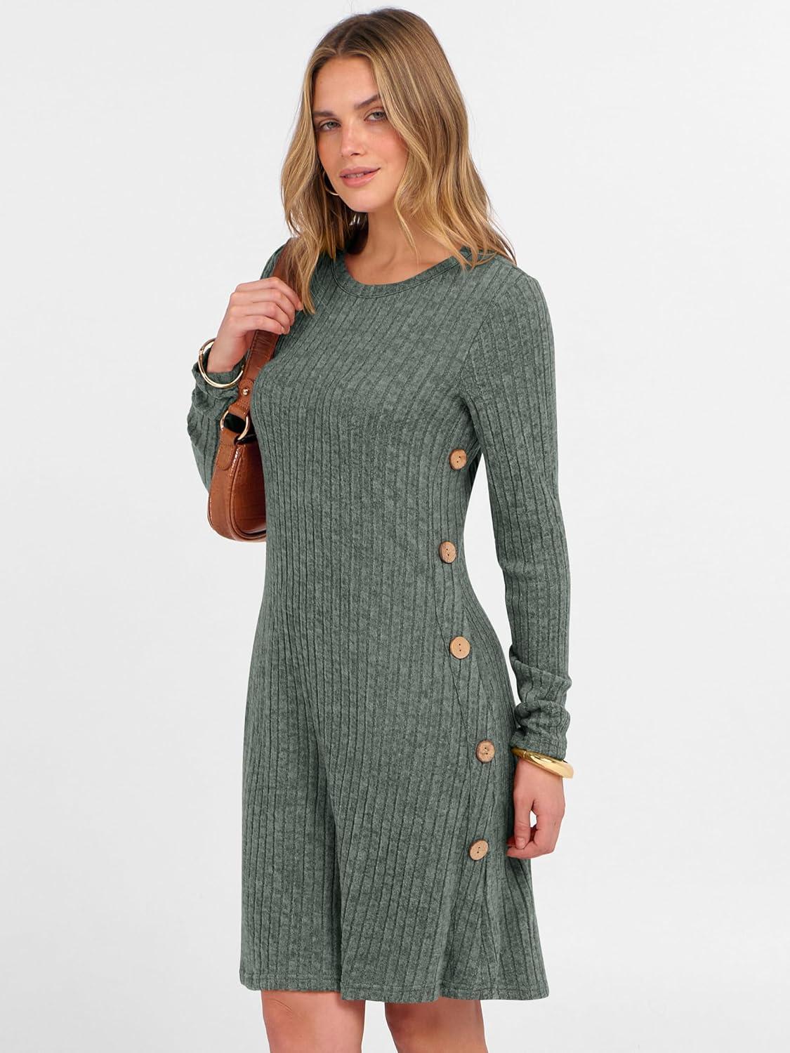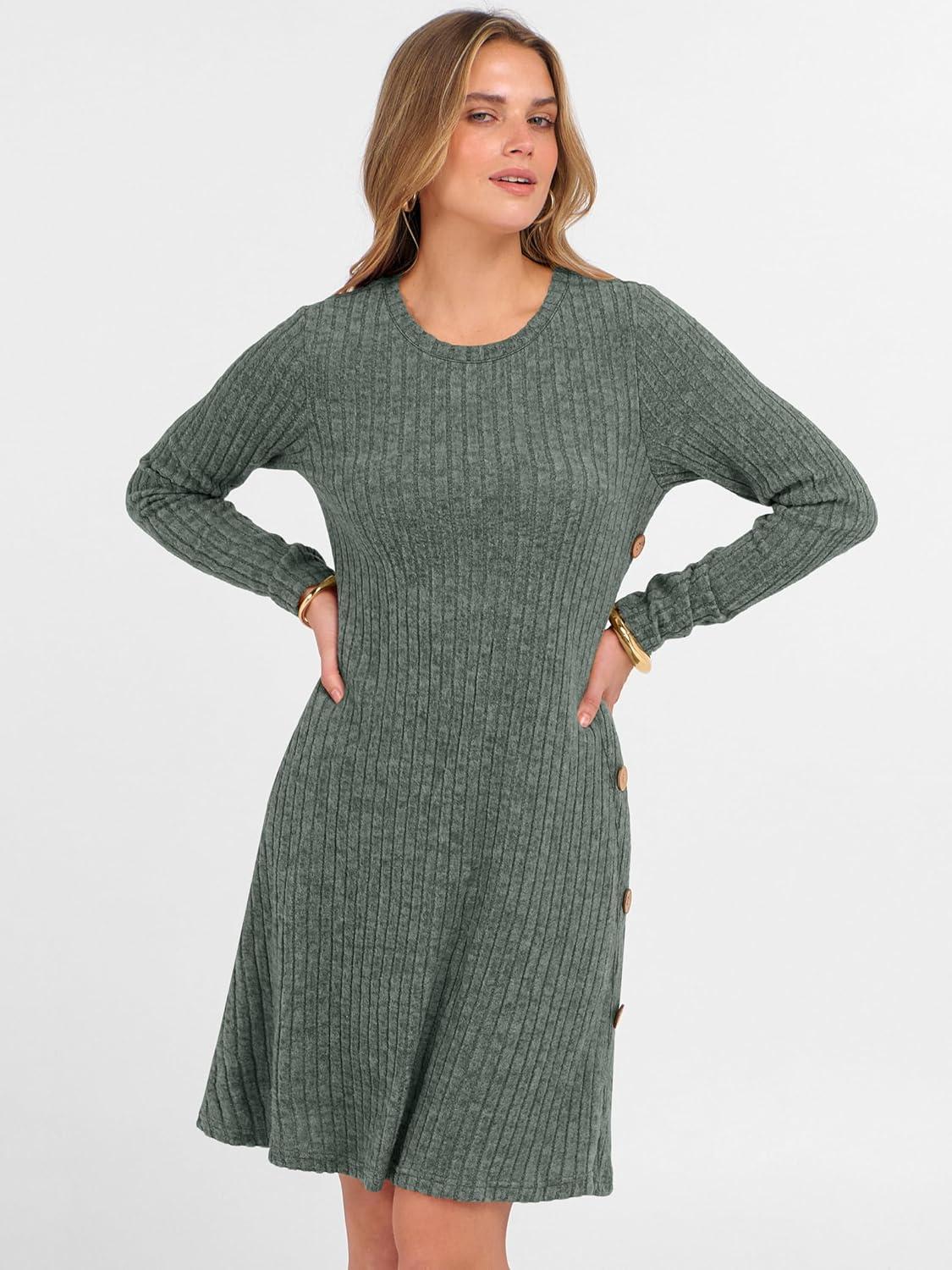 ANRABESS Womens Long Sleeve Ribbed Knit Sweater Dresses 2025 Fall Winter Casual Lounge Short Tunic Dress with Pockets Buttons(Green Grey)
