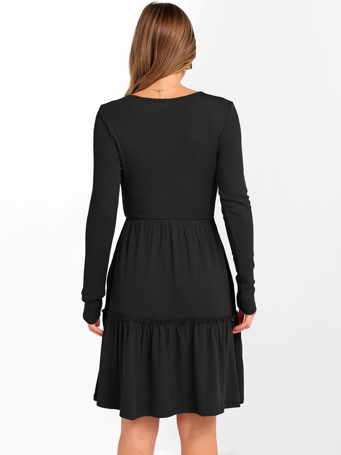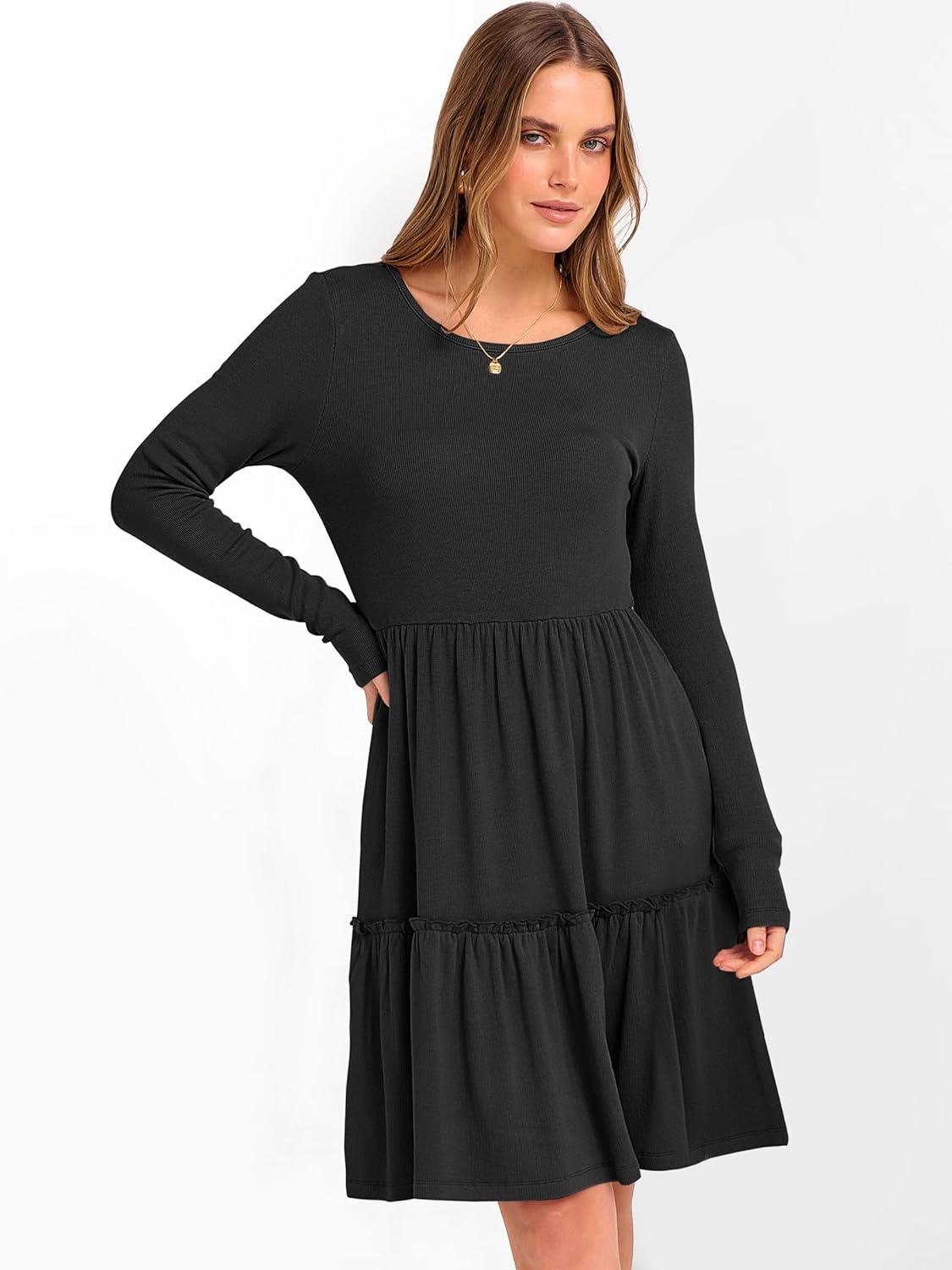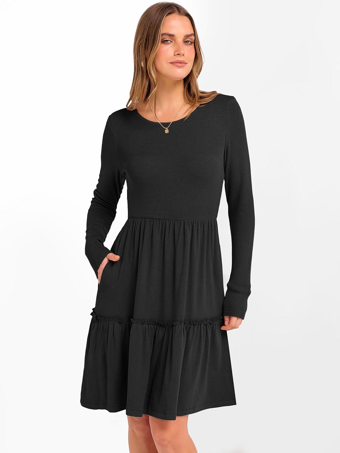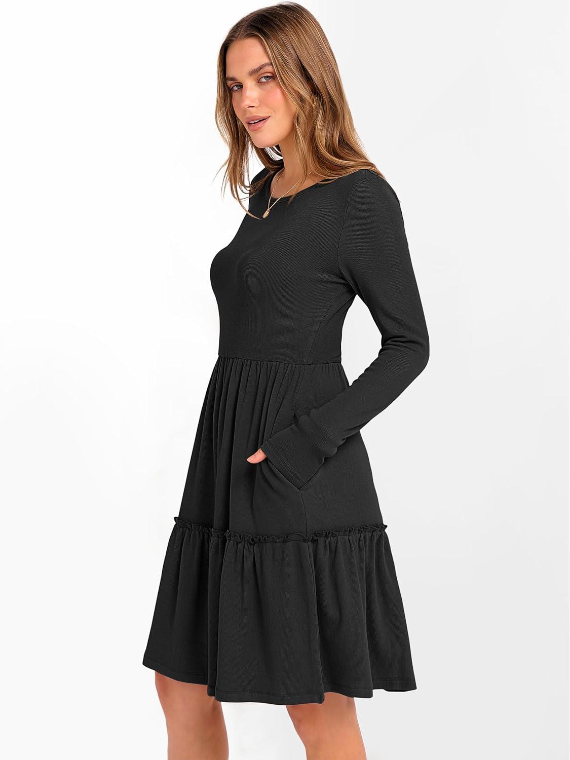 ANRABESS Womens Long Sleeve Ribbed Short Dresses 2025 Fall Knit A Line Flowy Tiered Casual Mini Sweater Dress with Pockets(Black)