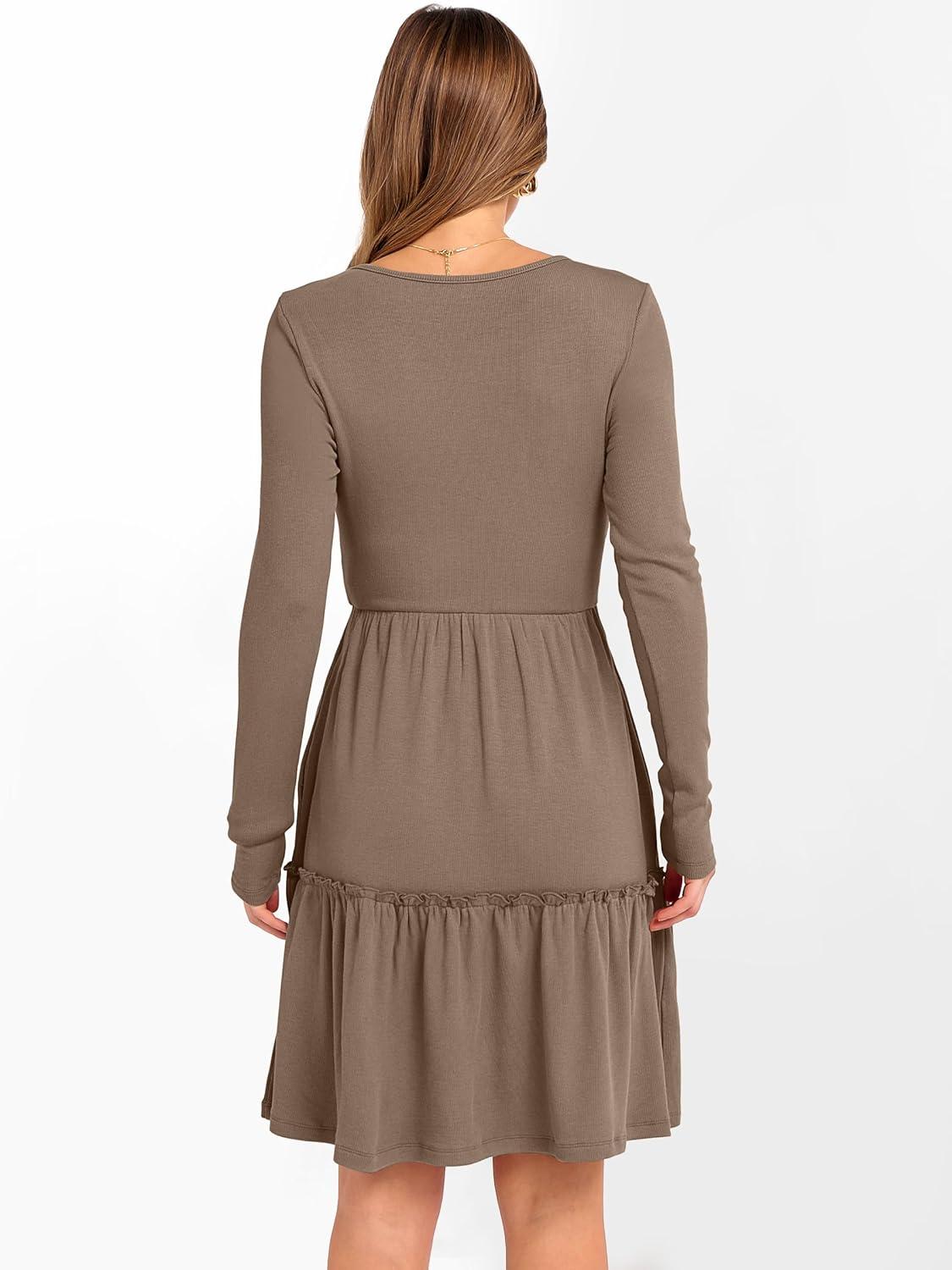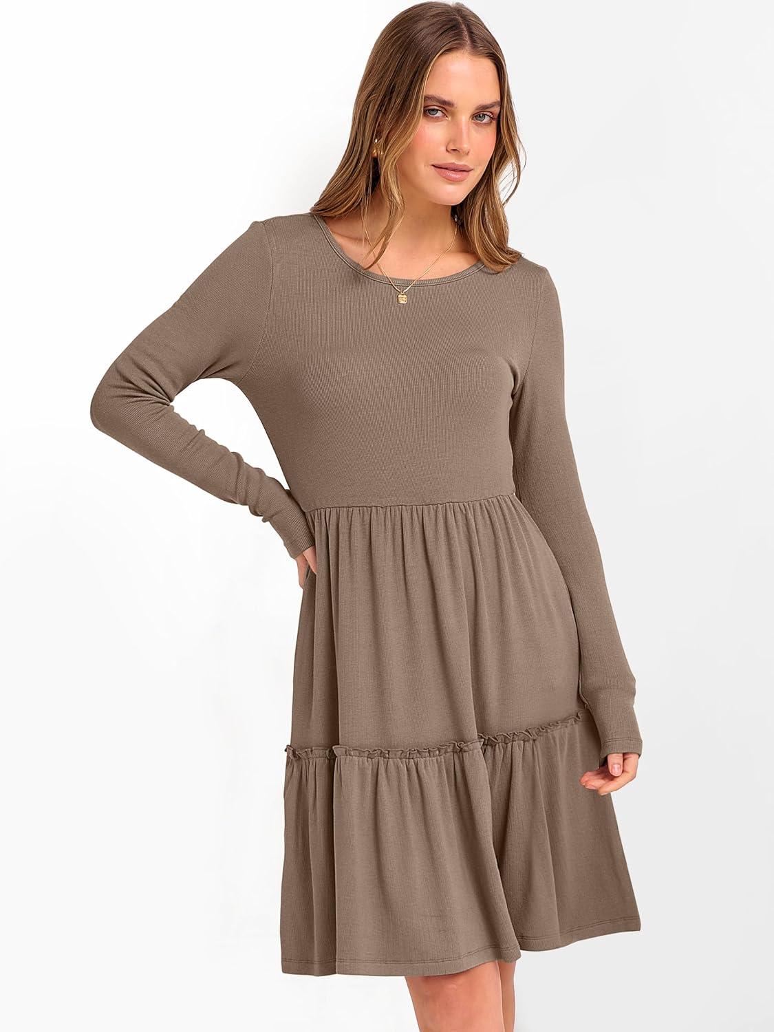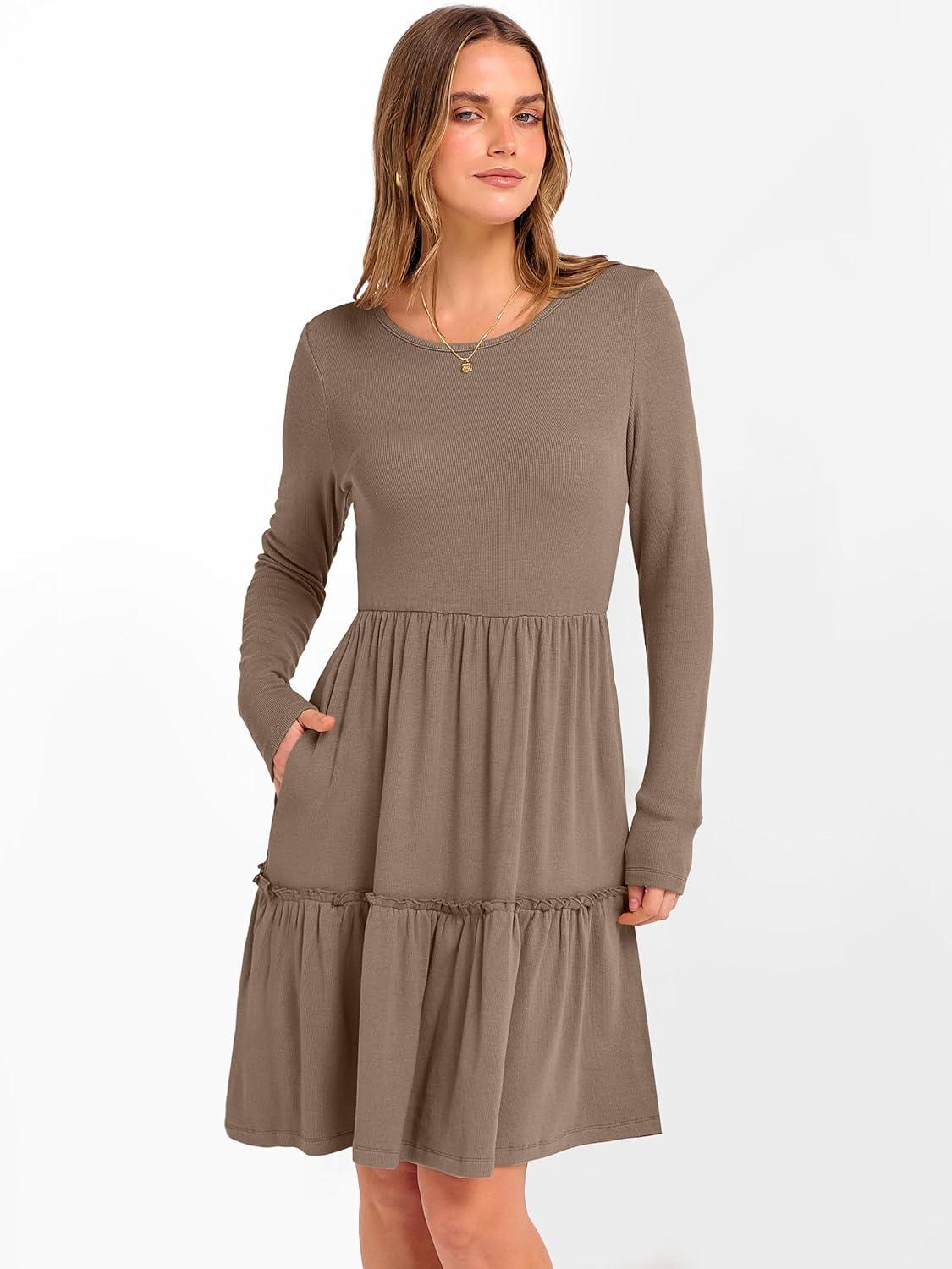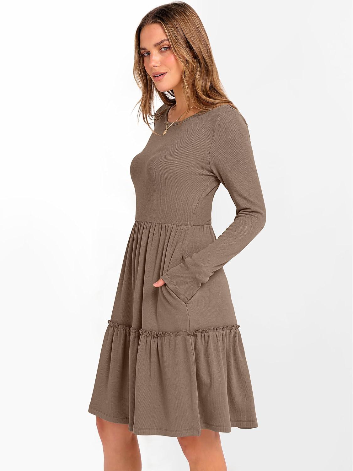 ANRABESS Womens Long Sleeve Ribbed Short Dresses 2025 Fall Knit A Line Flowy Tiered Casual Mini Sweater Dress with Pockets(Light Brown)