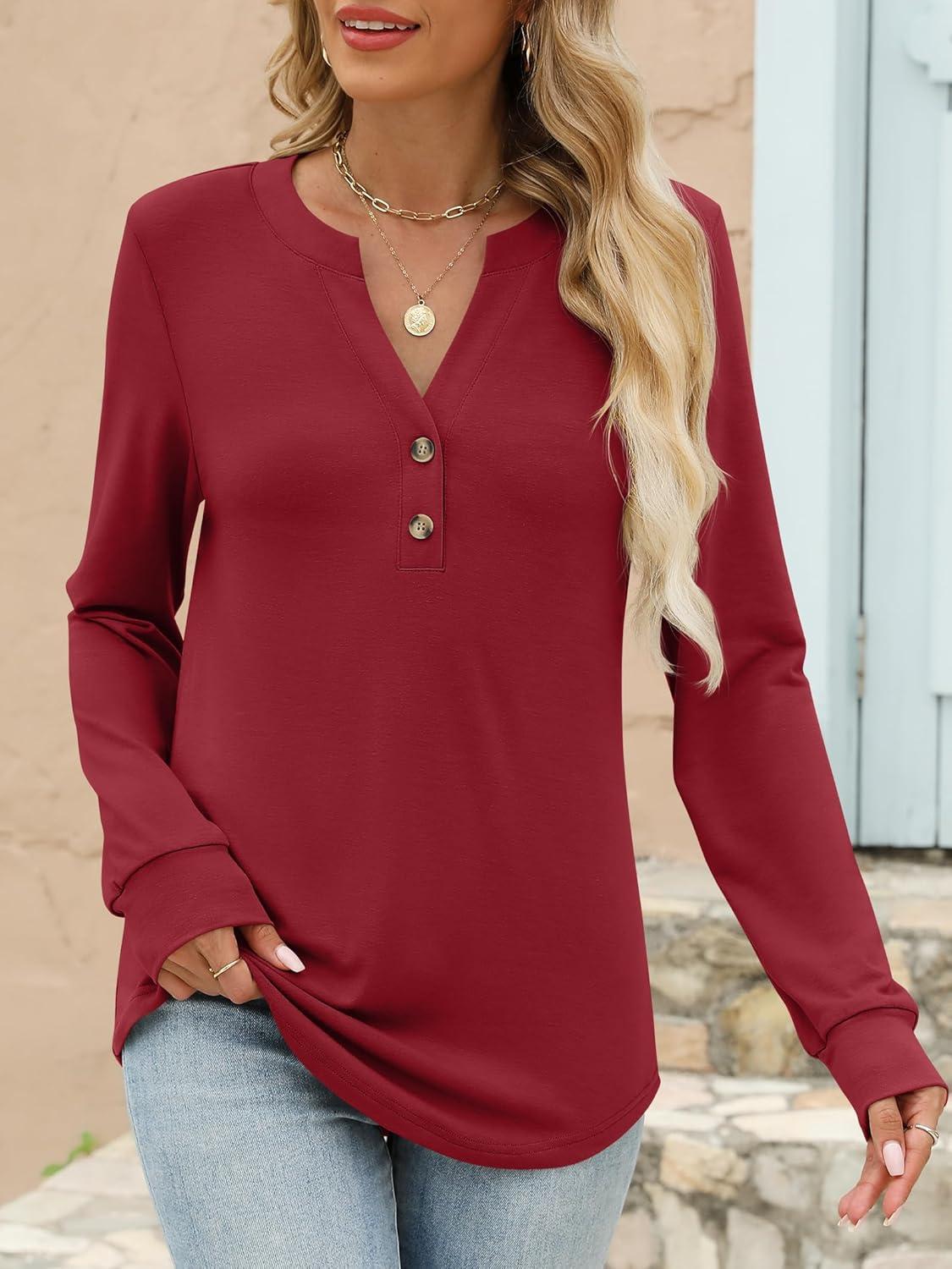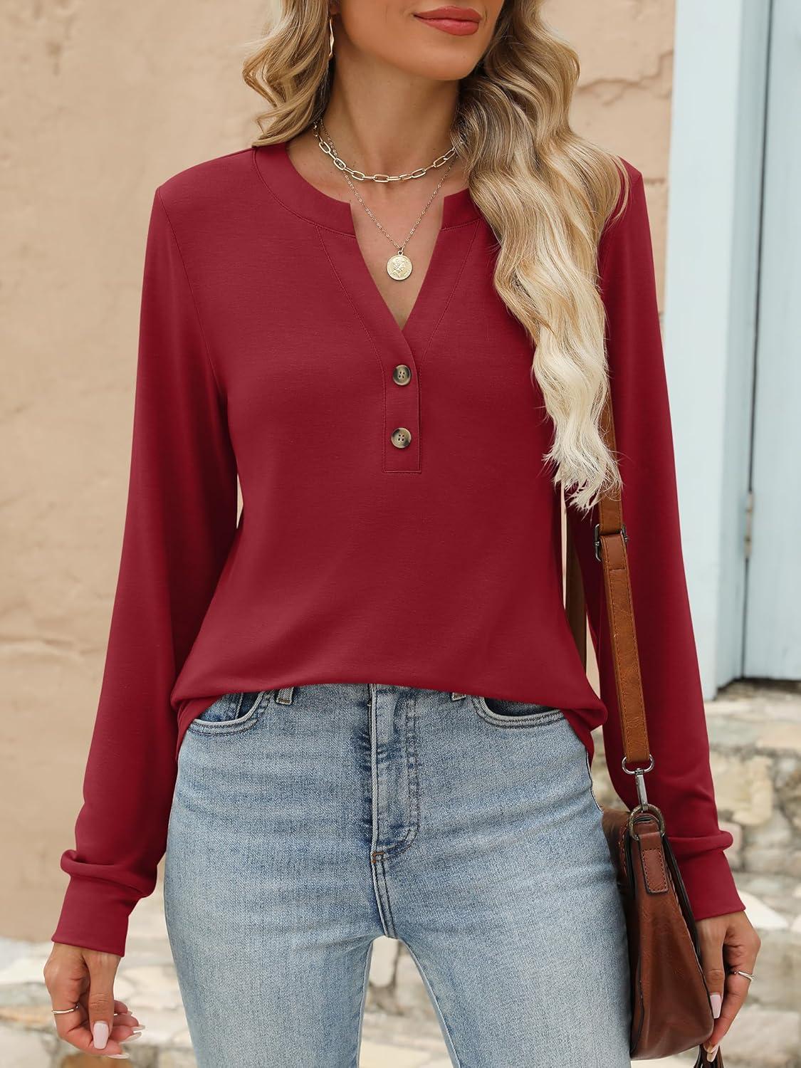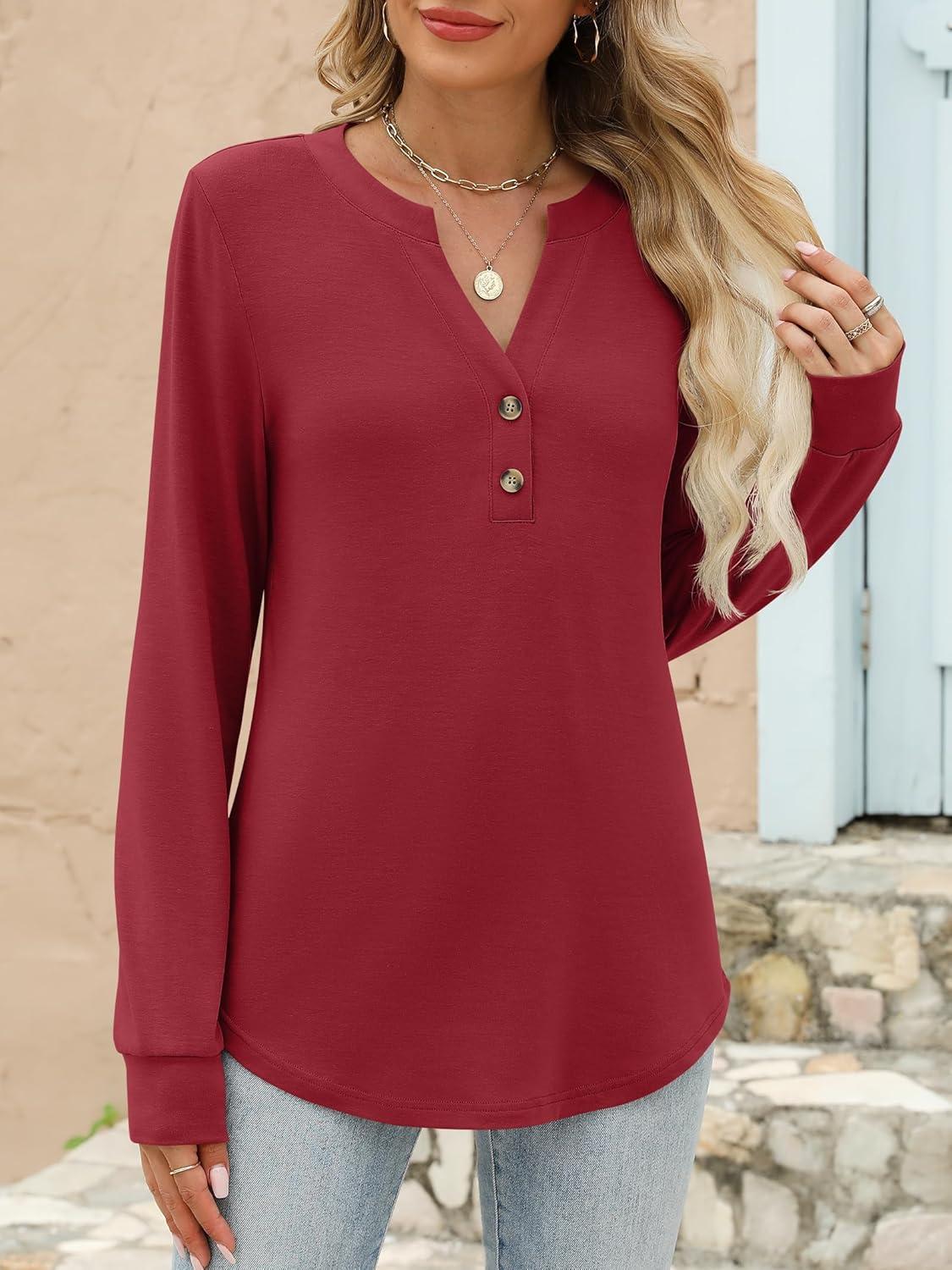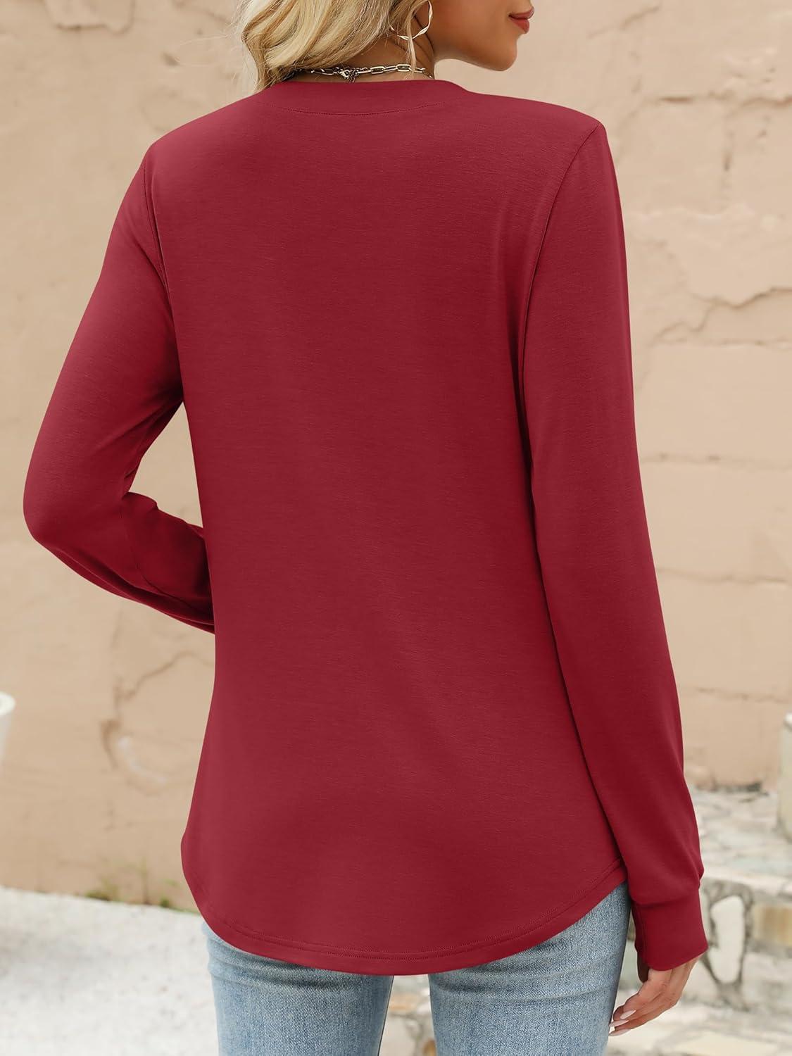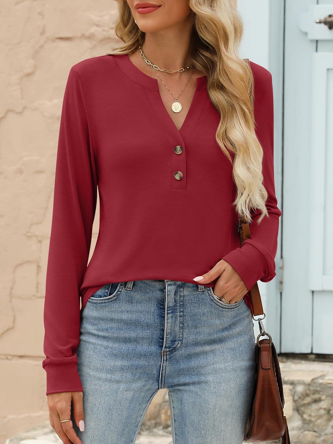 ANRABESS Women’s Long Sleeve Shirts 2025 Fall Henley Business Casual Tops Cute T-Shirts Work Blouses Outfits Vacation Clothes(Red)