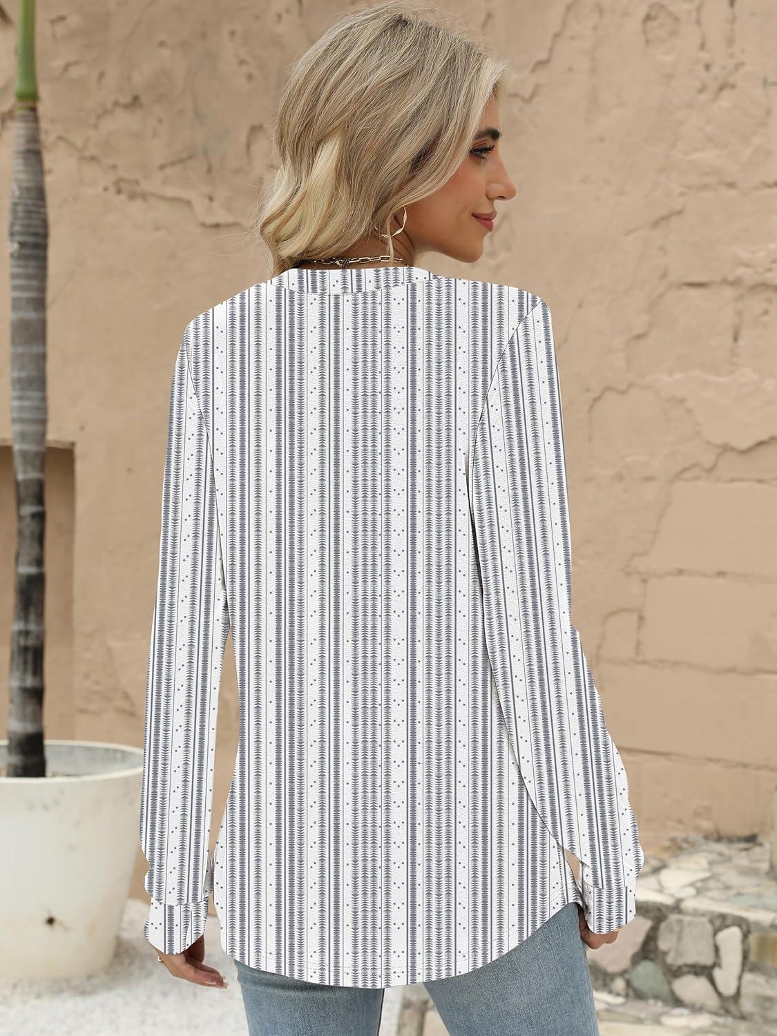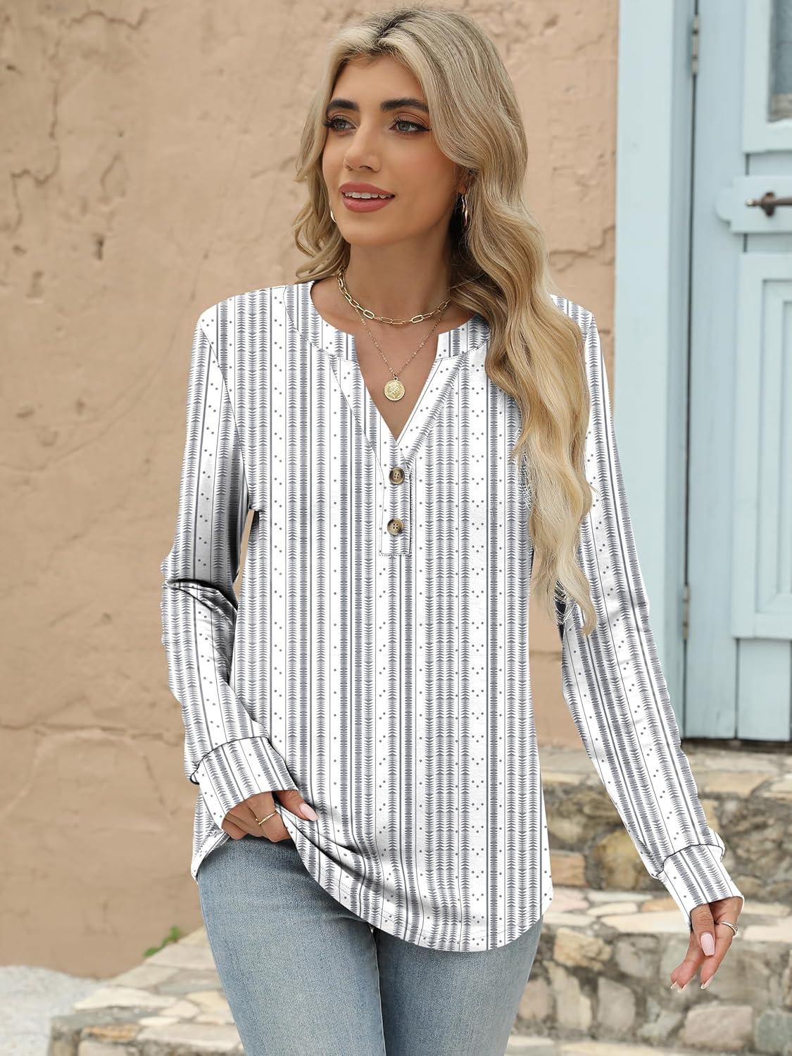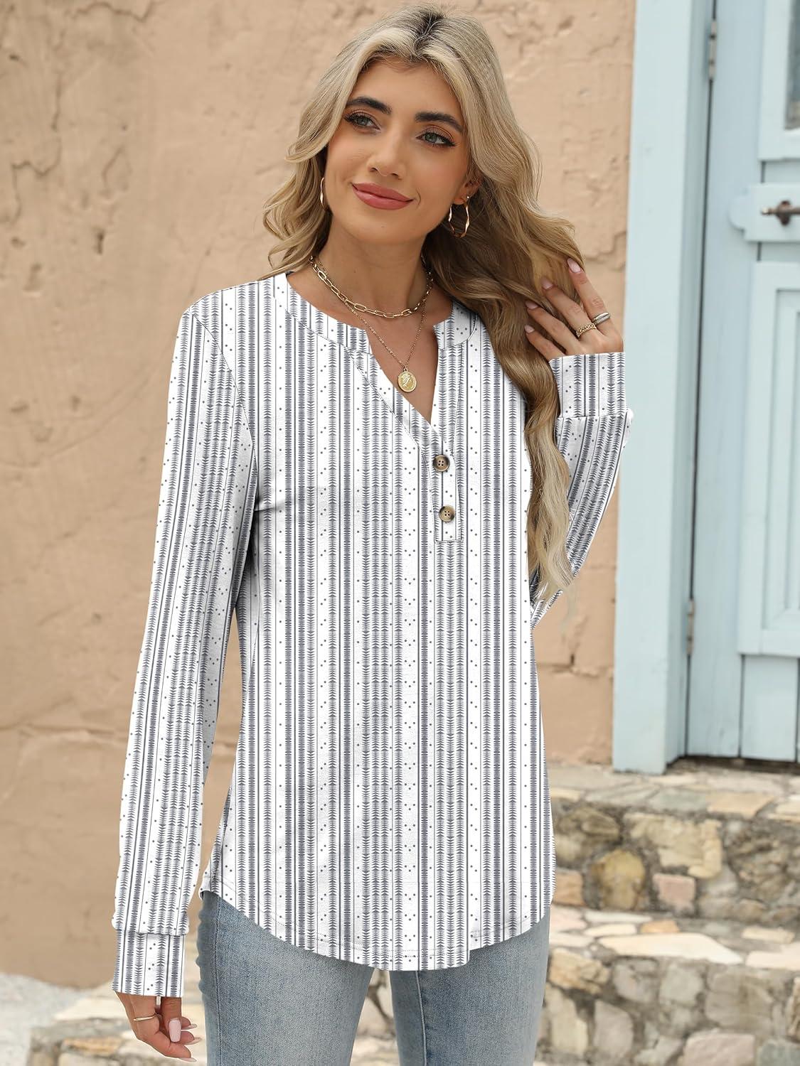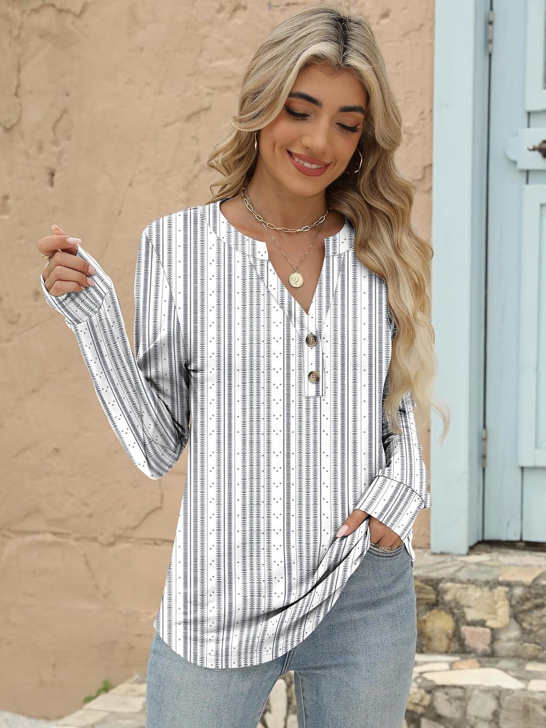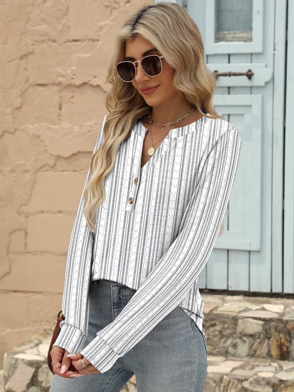 ANRABESS Women’s Long Sleeve Shirts 2025 Fall Henley Business Casual Tops Cute T-Shirts Work Blouses Outfits Vacation Clothes(White Grey Strip)