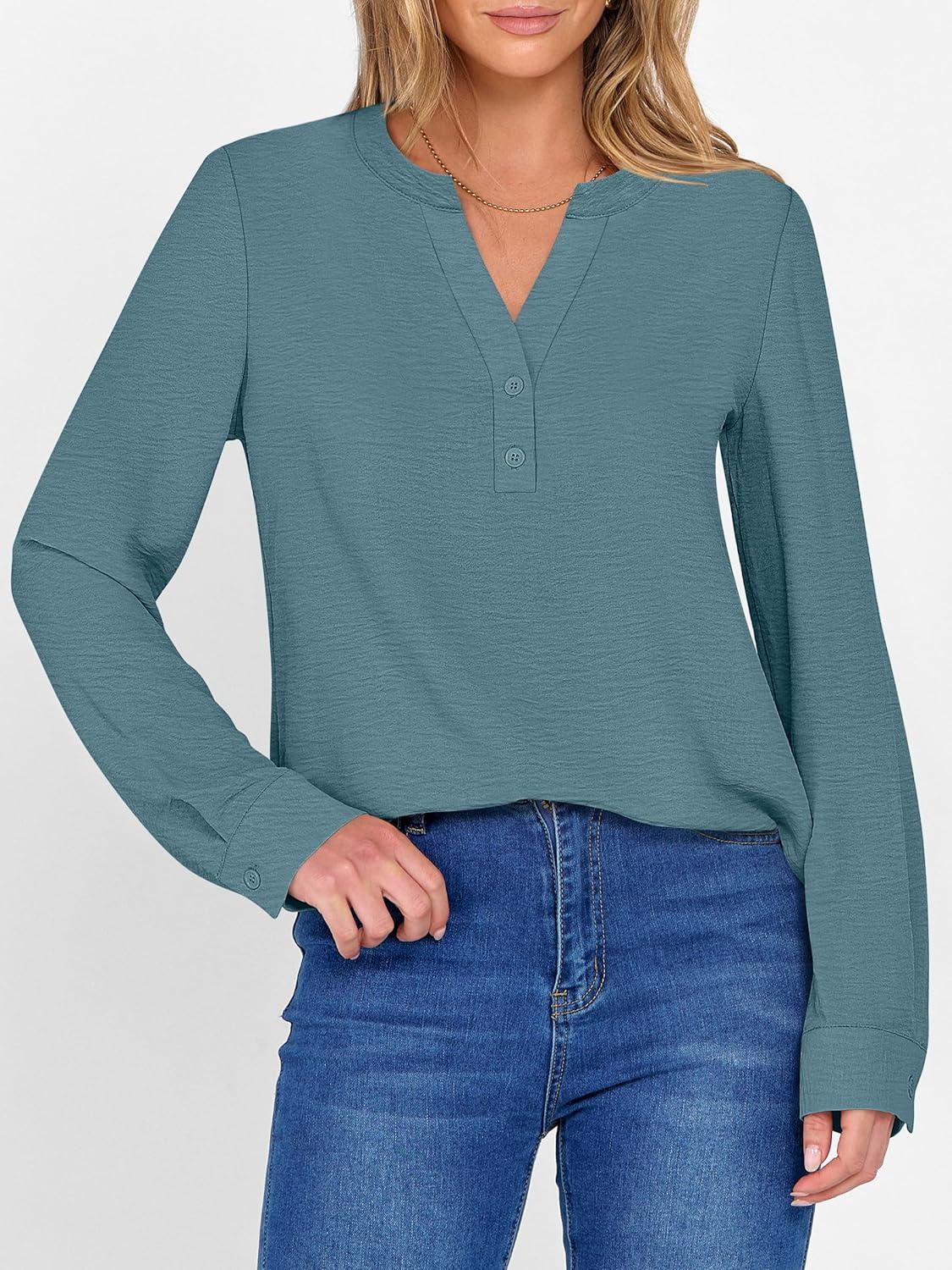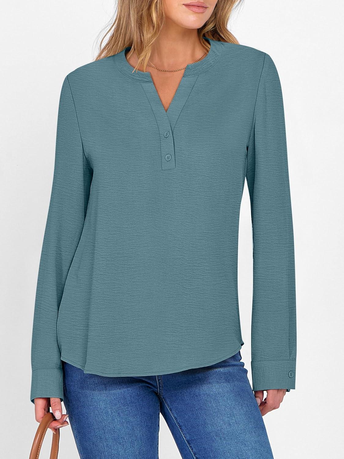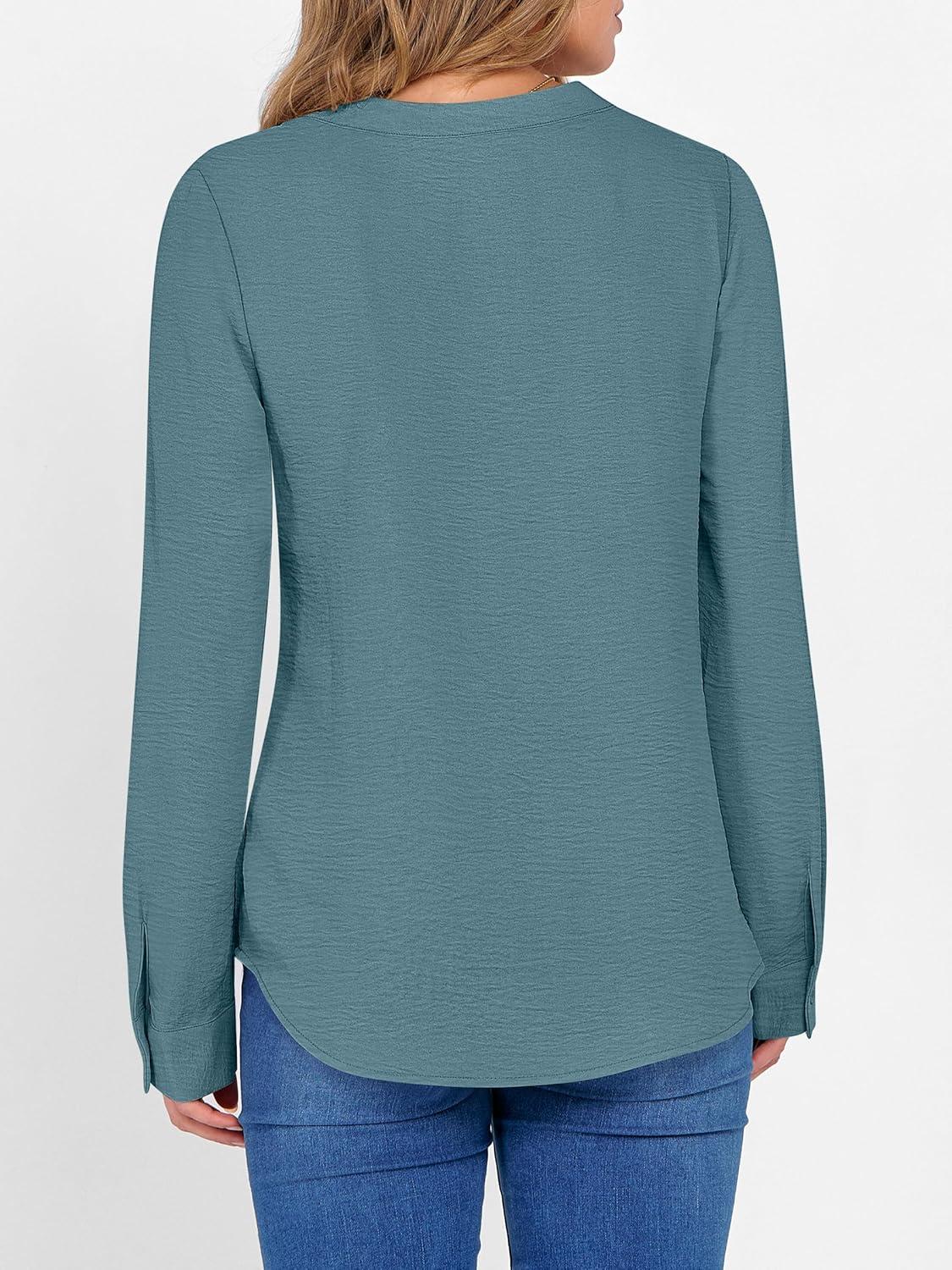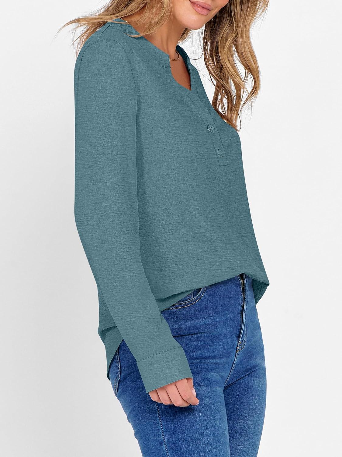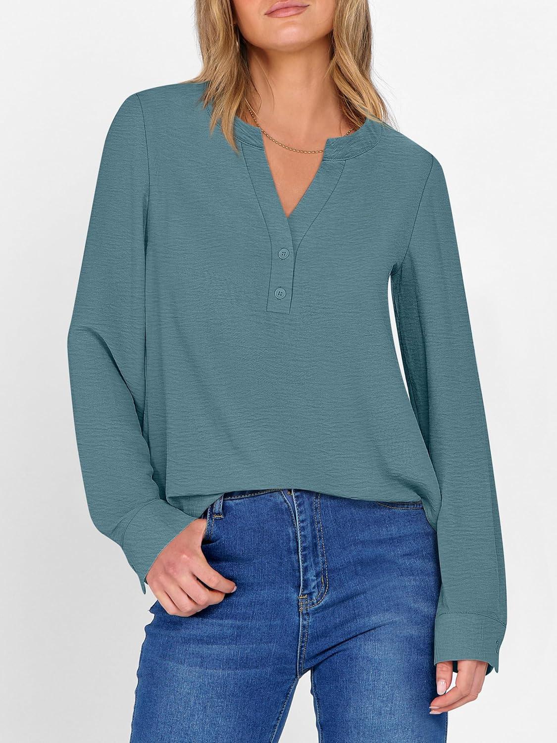 ANRABESS Women’s Long Sleeve Shirts 2025 Fall Henley Business Dressy Casual Tops V Neck Button Down T-Shirts Work Blouses(Lake)