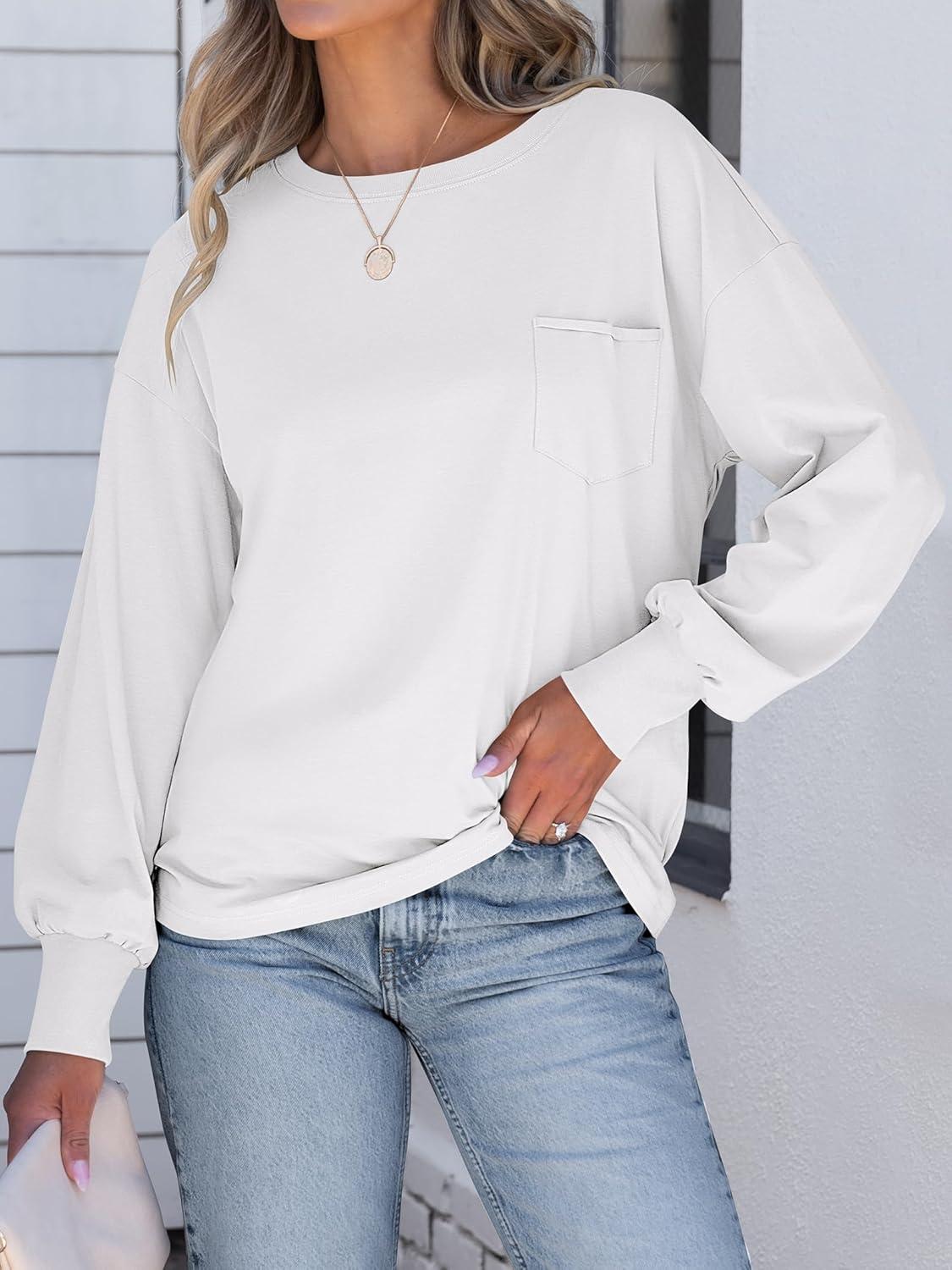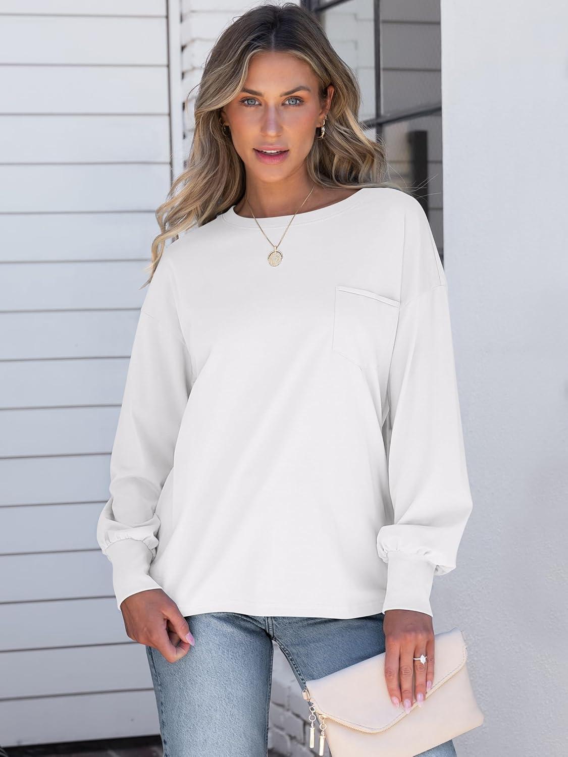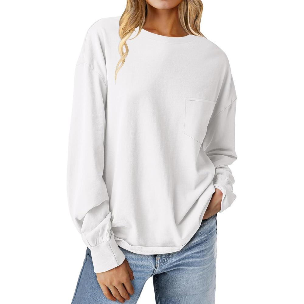 ANRABESS Womens Long Sleeve Shirts Crewneck Oversized Tops Casual 2025 Fall Trendy T-Shirts Tee Blouse with Pockets Clothes(White)