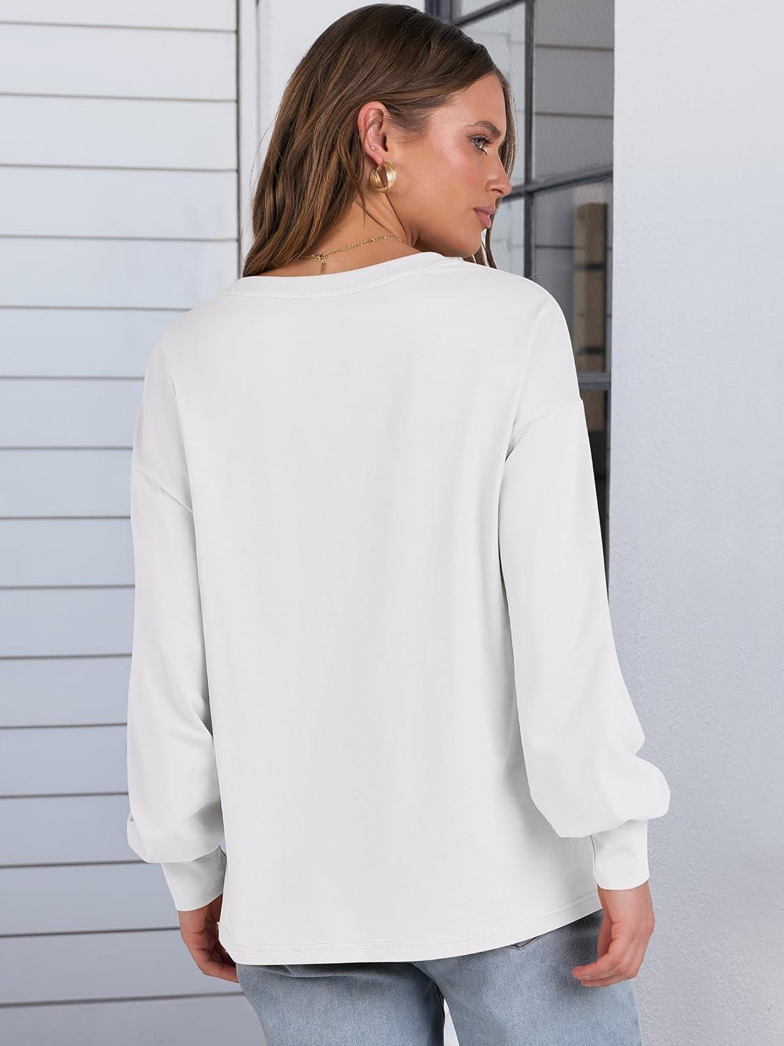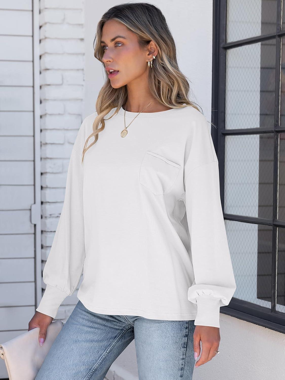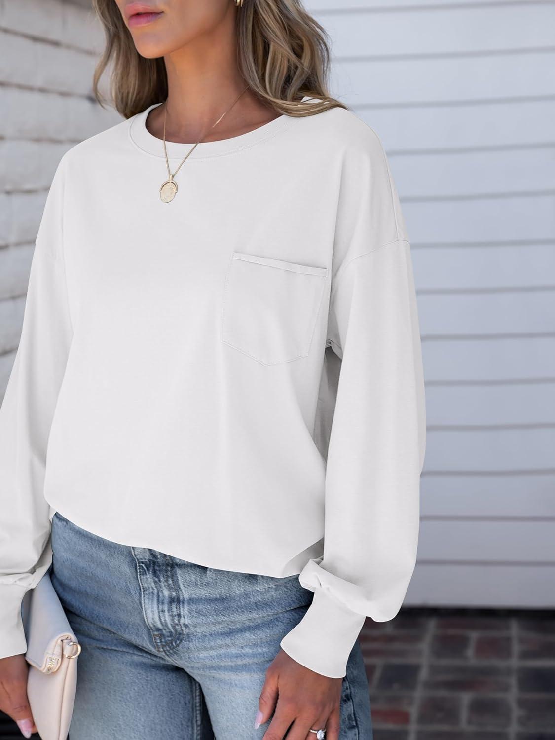ANRABESS Womens Long Sleeve Shirts Crewneck Oversized Tops Casual 2025 Fall Trendy T-Shirts Tee Blouse with Pockets Clothes(White)