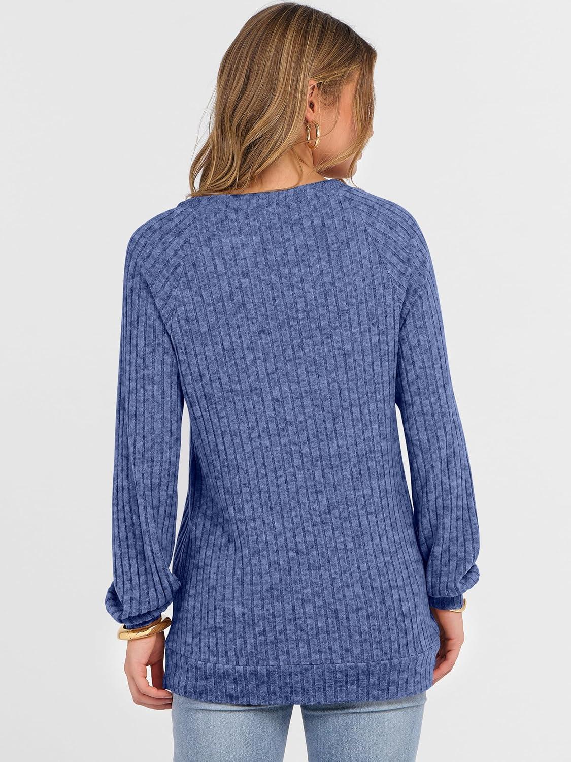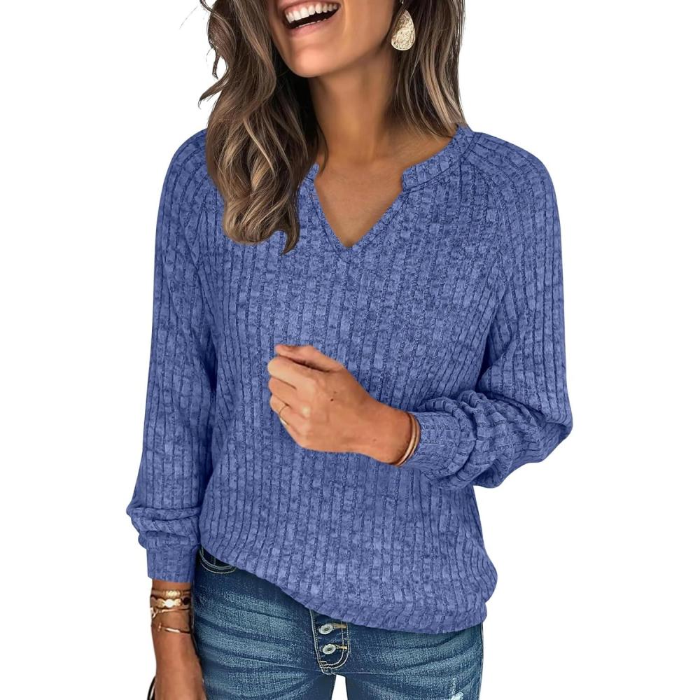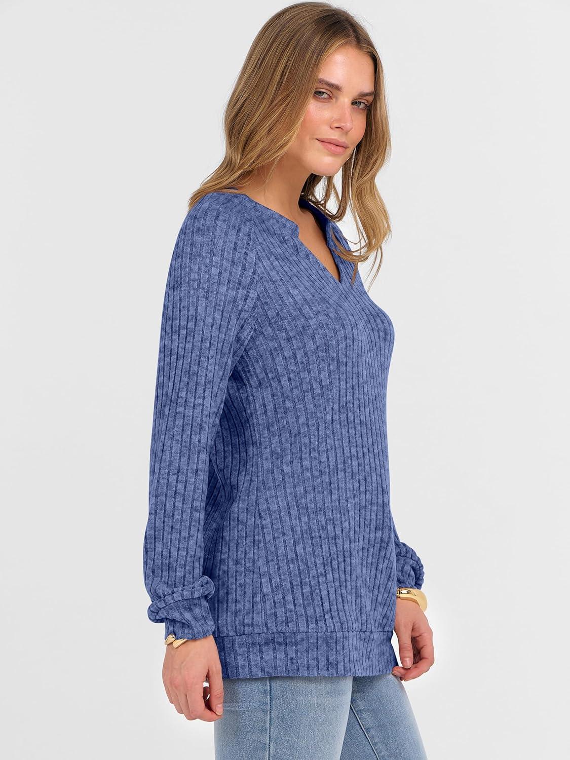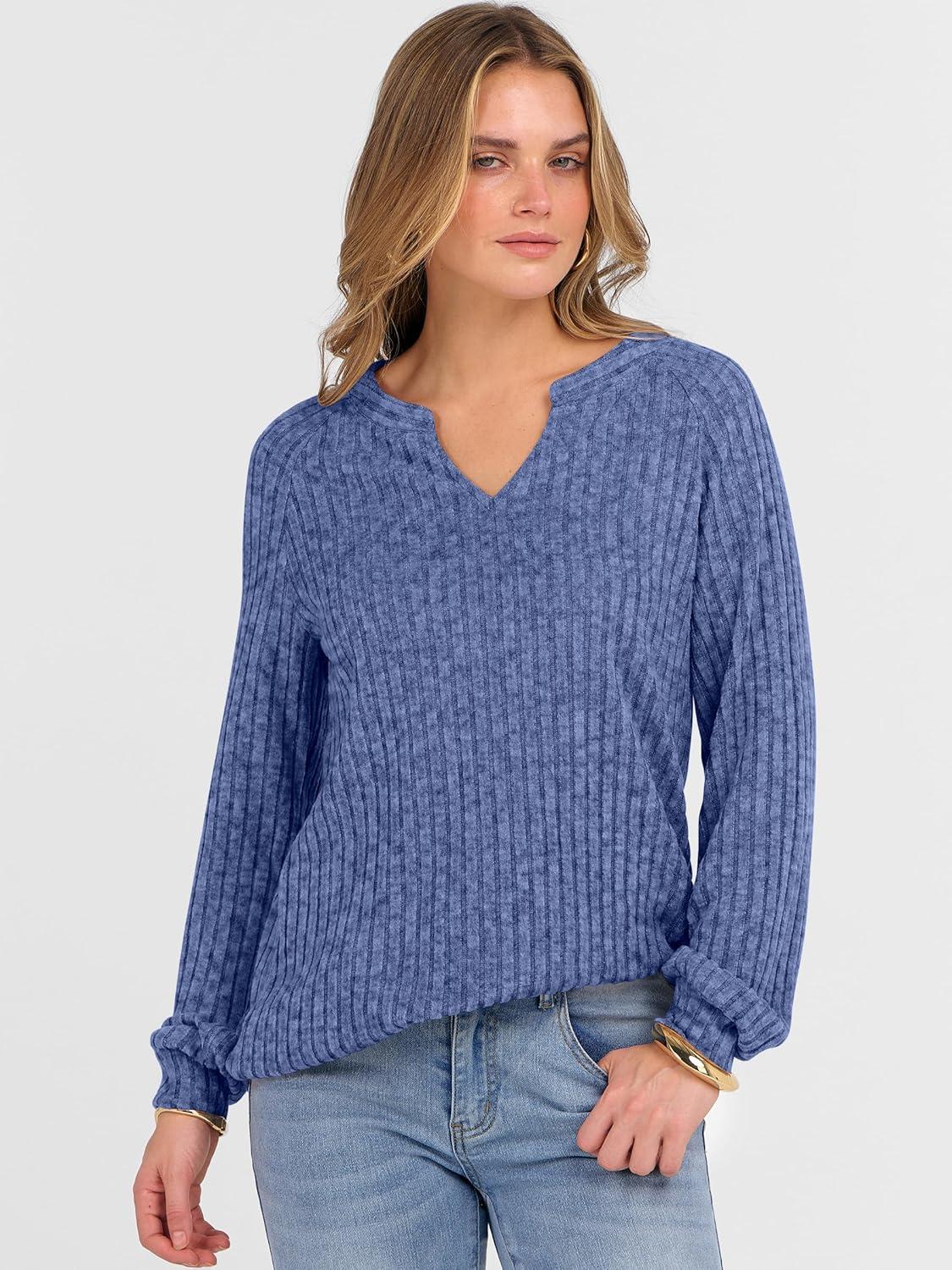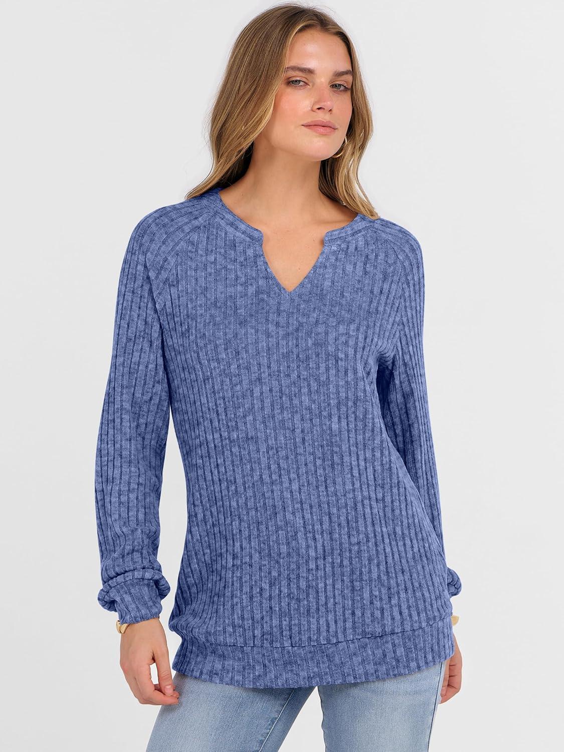 ANRABESS Womens Long Sleeve Shirts Fall Lightweight V Neck Sweater Tops Dressy Casual Loose Fit Tunic 2025 Fashion Clothes(Blue)