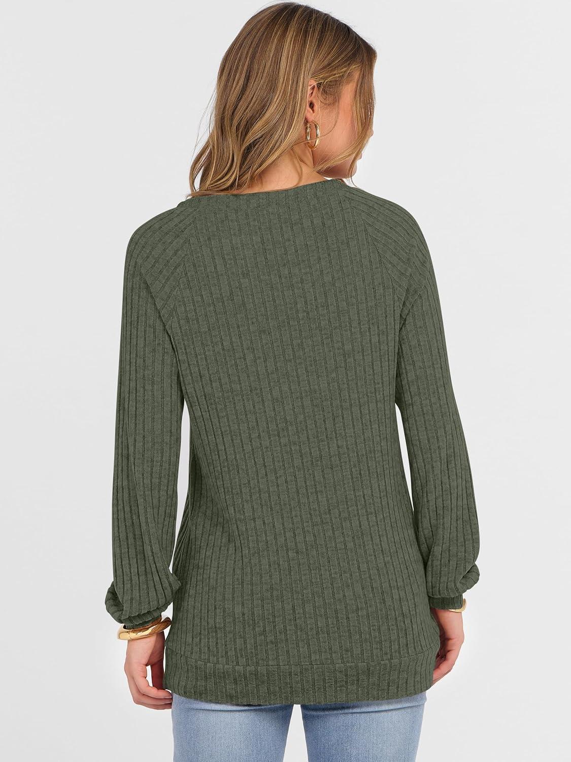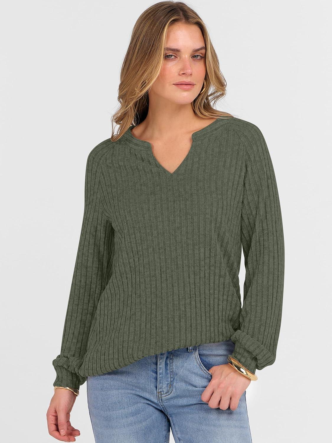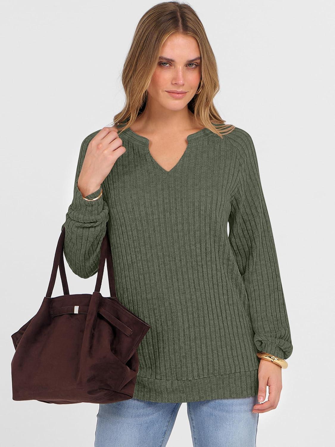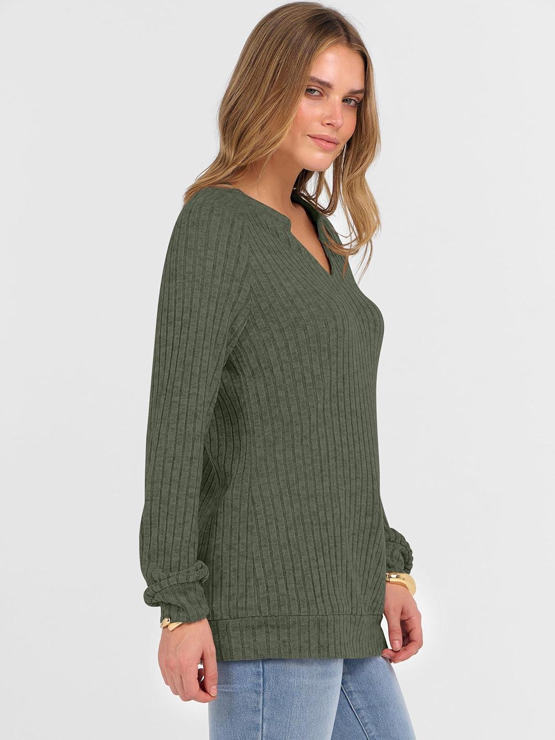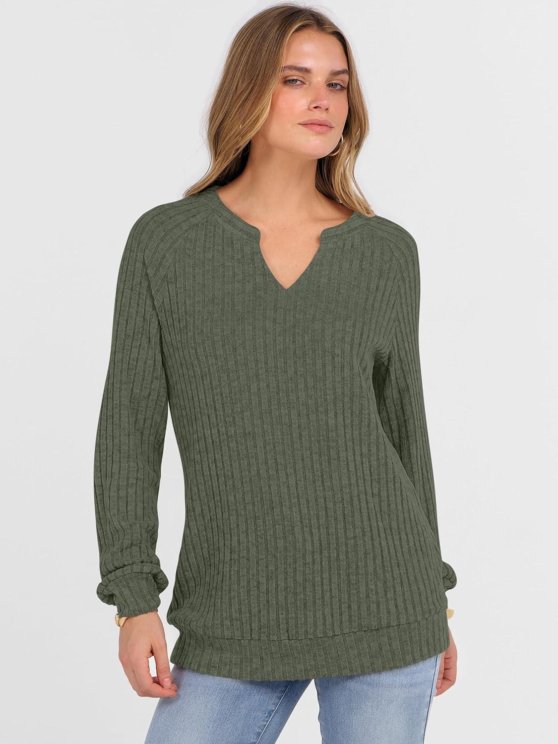 ANRABESS Womens Long Sleeve Shirts Fall Lightweight V Neck Sweater Tops Dressy Casual Loose Fit Tunic 2025 Fashion Clothes(Deep Green)