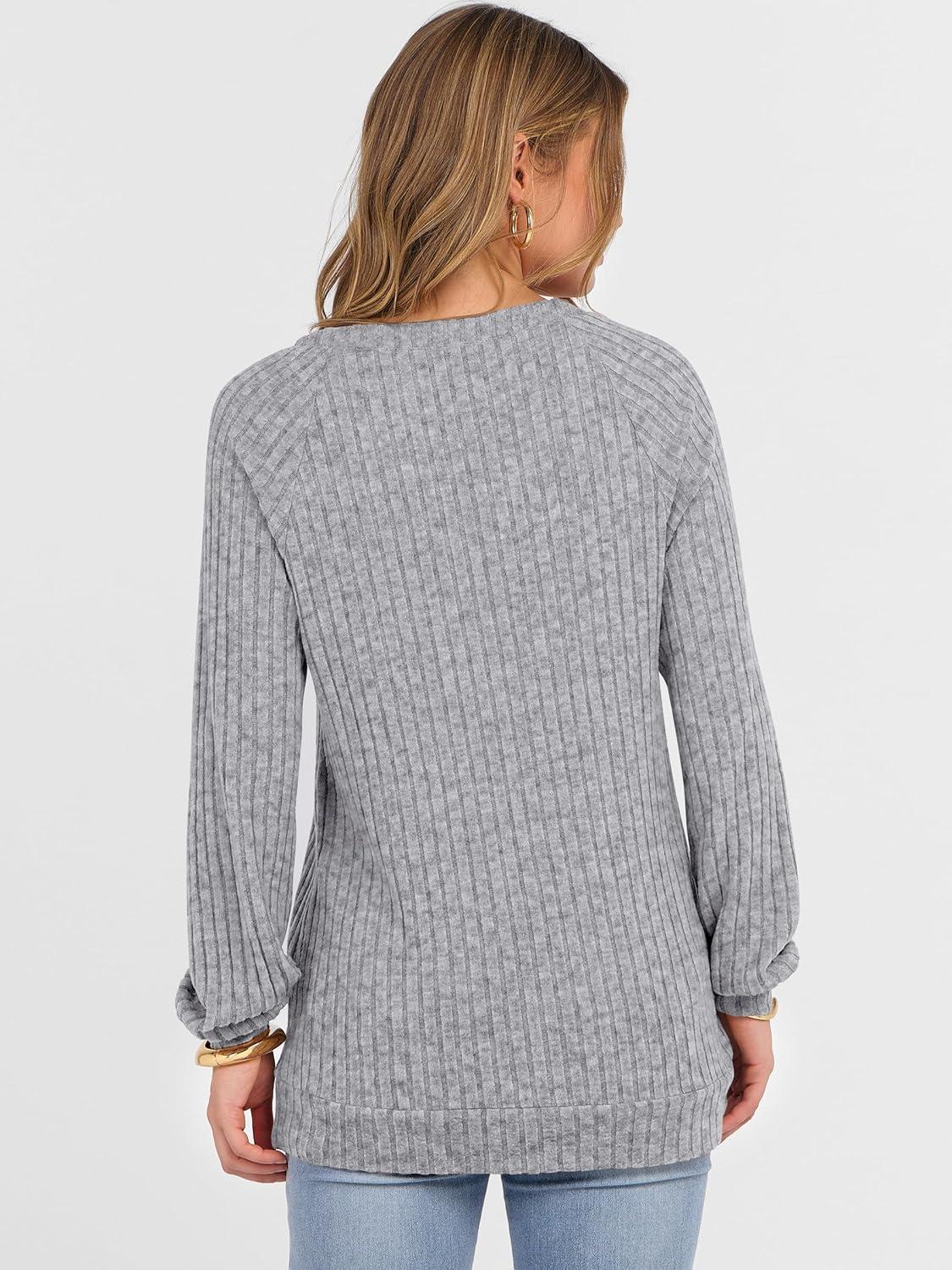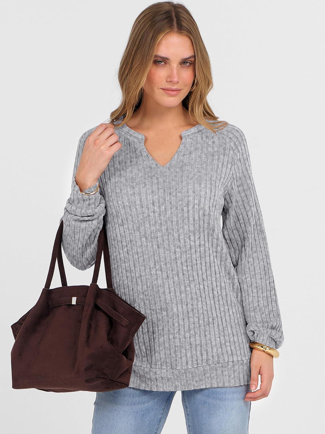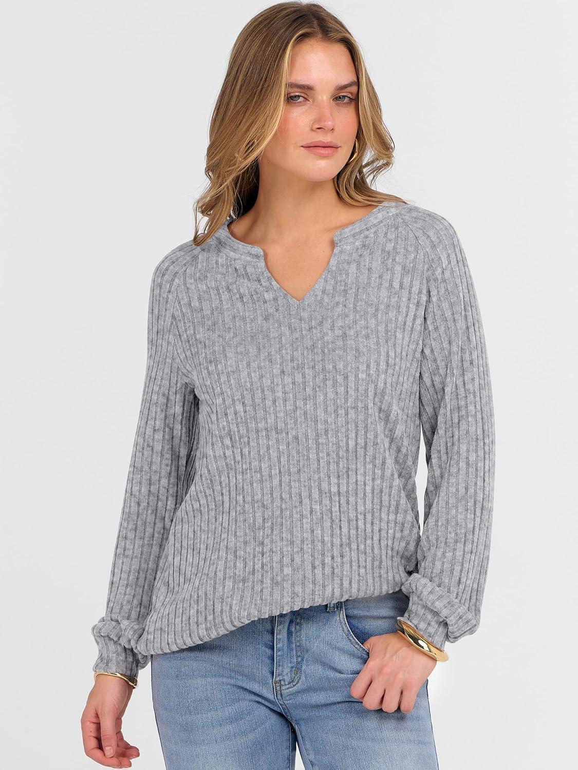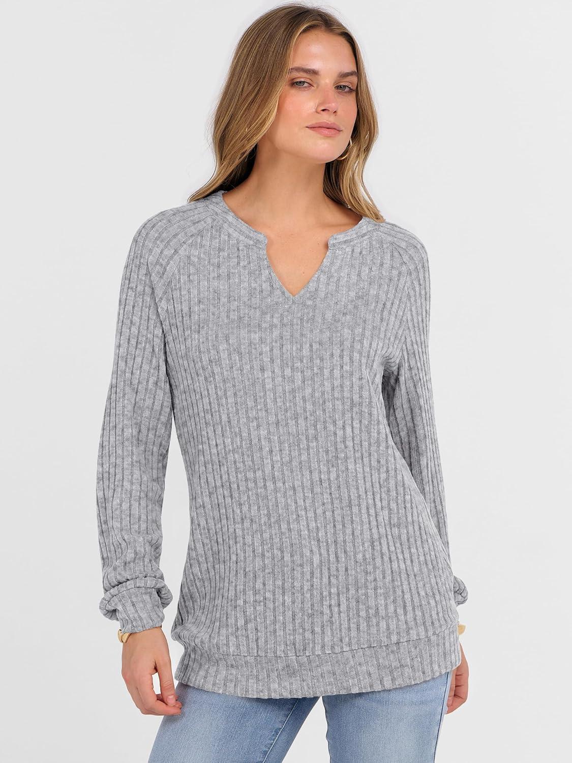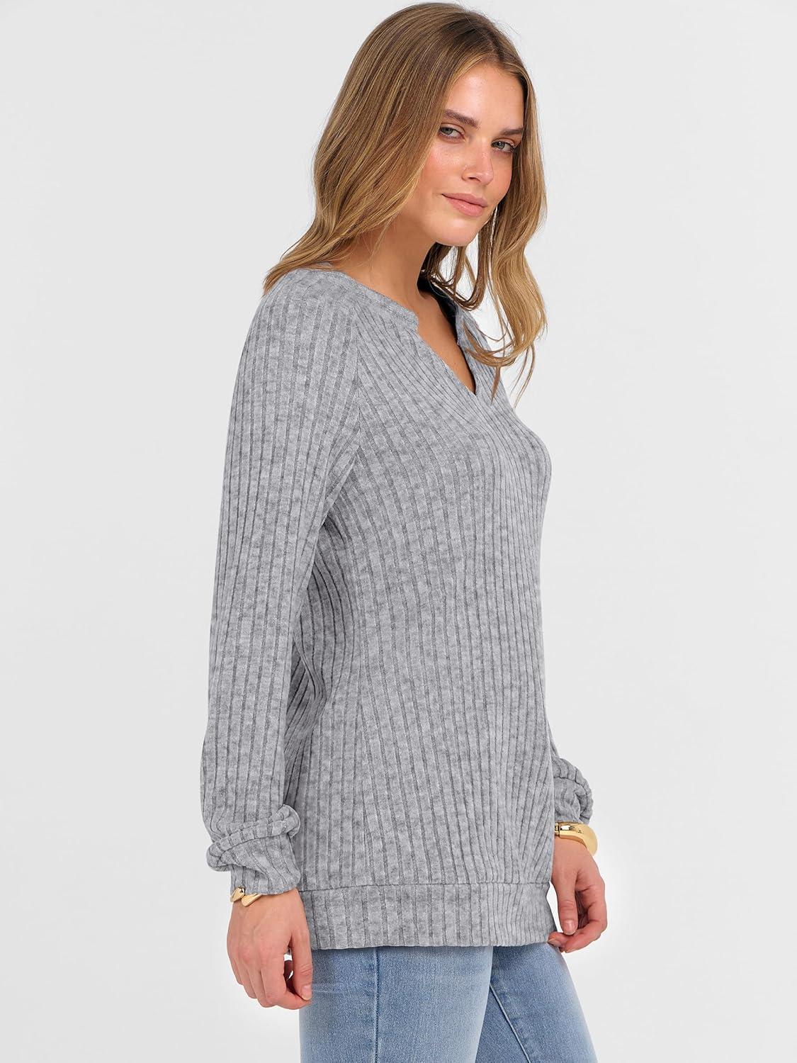 ANRABESS Womens Long Sleeve Shirts Fall Lightweight V Neck Sweater Tops Dressy Casual Loose Fit Tunic 2025 Fashion Clothes(Grey)