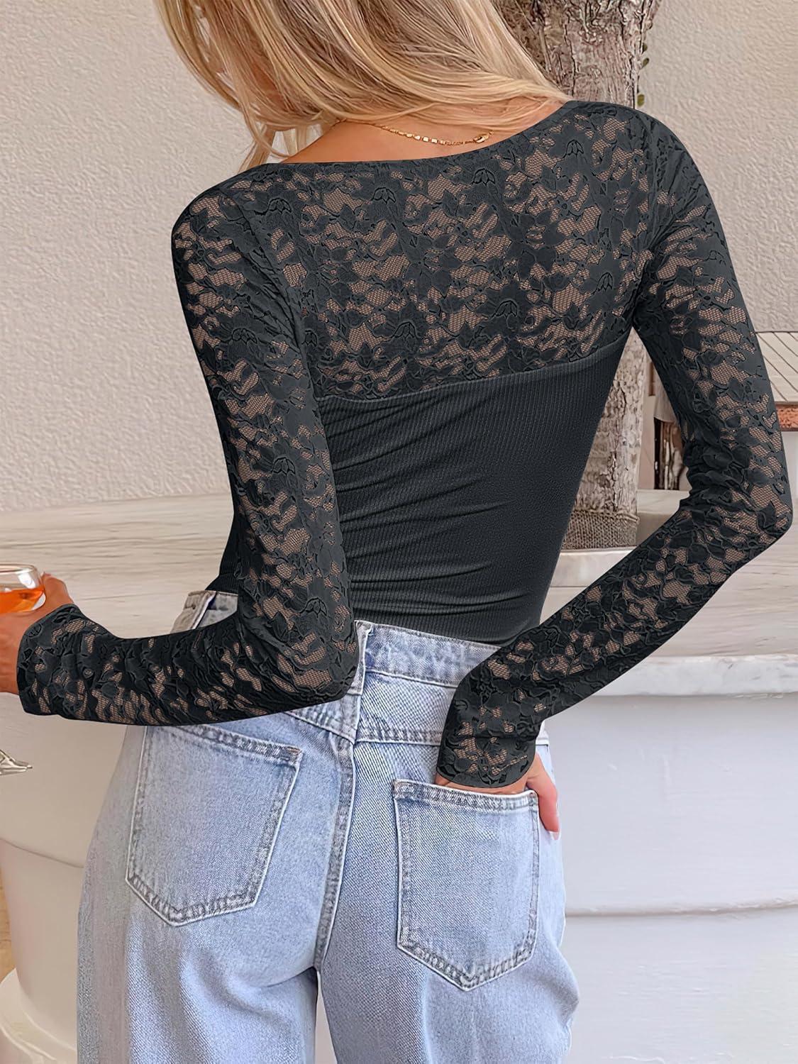 ANRABESS Womens Long Sleeve Shirts Scoop Neck Lace Going Out Tops Slim Fit Rib Knit Casual Blouses 2025 Fall Fashion Outfits(Deep Grey)