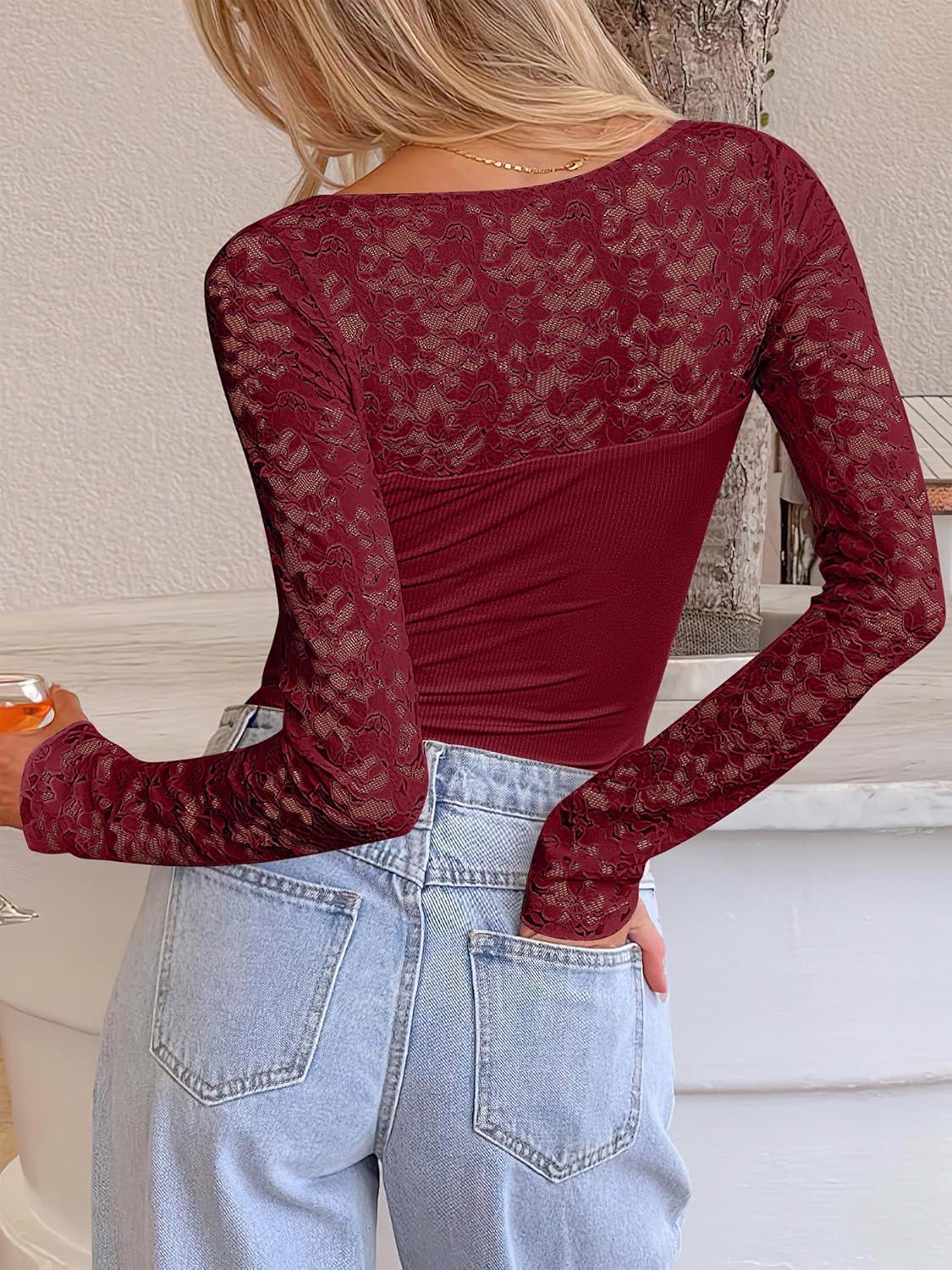 ANRABESS Womens Long Sleeve Shirts Scoop Neck Lace Going Out Tops Slim Fit Rib Knit Casual Blouses 2025 Fall Fashion Outfits(Deep Red)