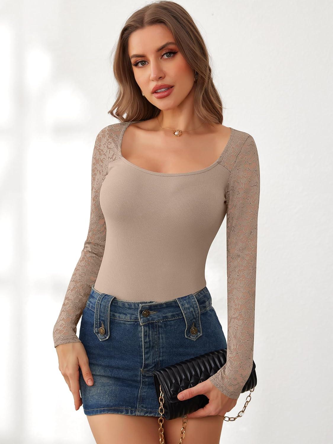 ANRABESS Womens Long Sleeve Shirts Scoop Neck Lace Going Out Tops Slim Fit Rib Knit Casual Blouses 2025 Fall Fashion Outfits(Light Camel)