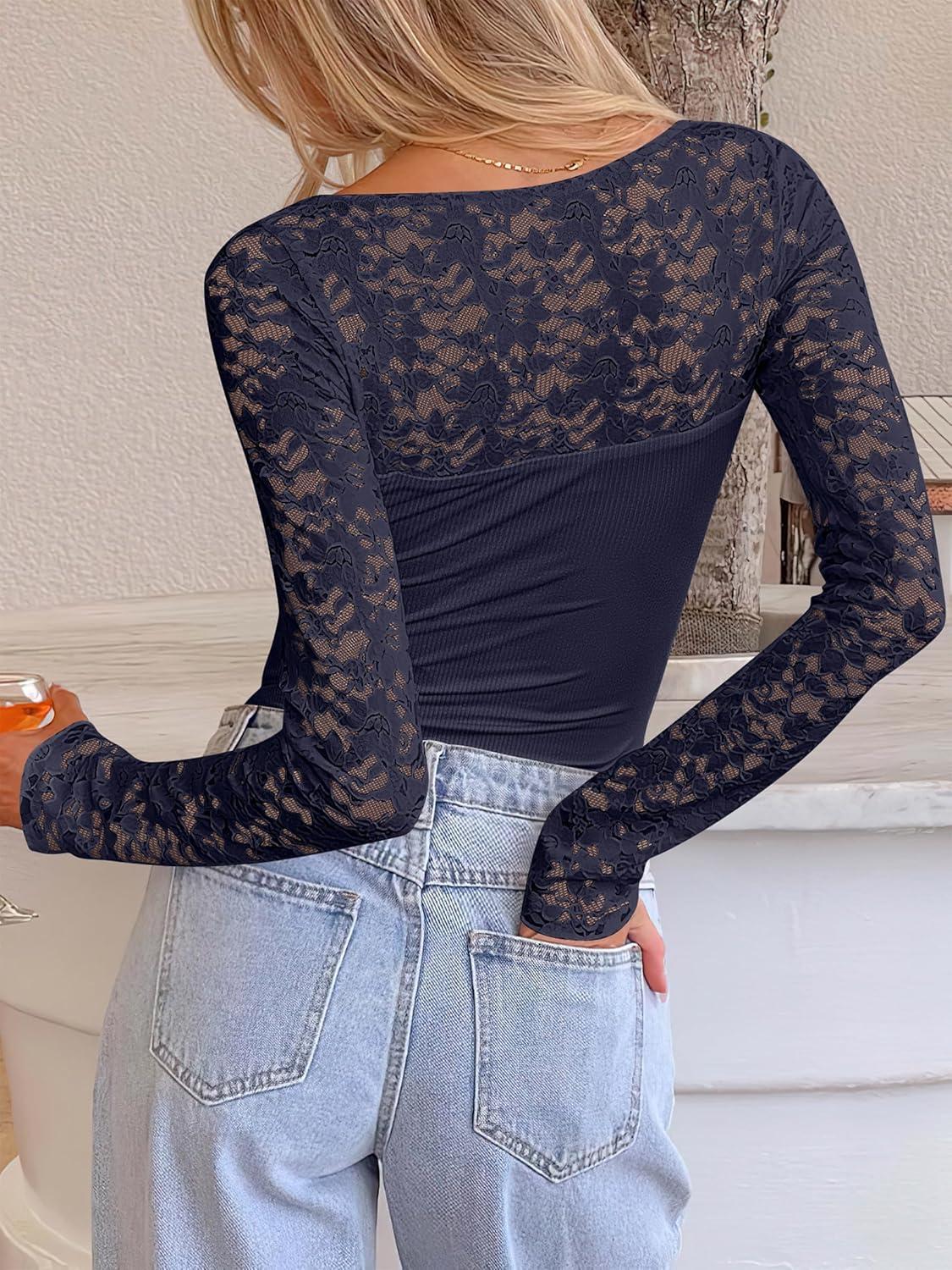 ANRABESS Womens Long Sleeve Shirts Scoop Neck Lace Going Out Tops Slim Fit Rib Knit Casual Blouses 2025 Fall Fashion Outfits(Navy Blue)