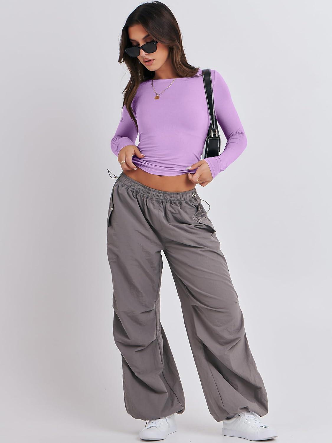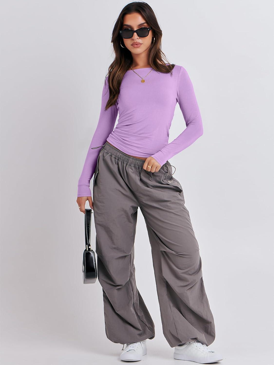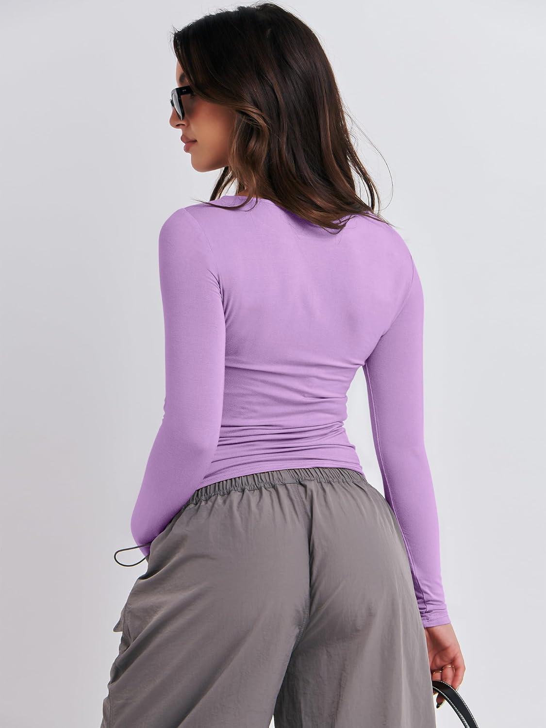 ANRABESS Women’s Long Sleeve Shirts Tight Fitted Going Out Crop Tops Crewneck Basic Tee Y2k Fall Outfits Teens Girls Clothes(Bright Purple)