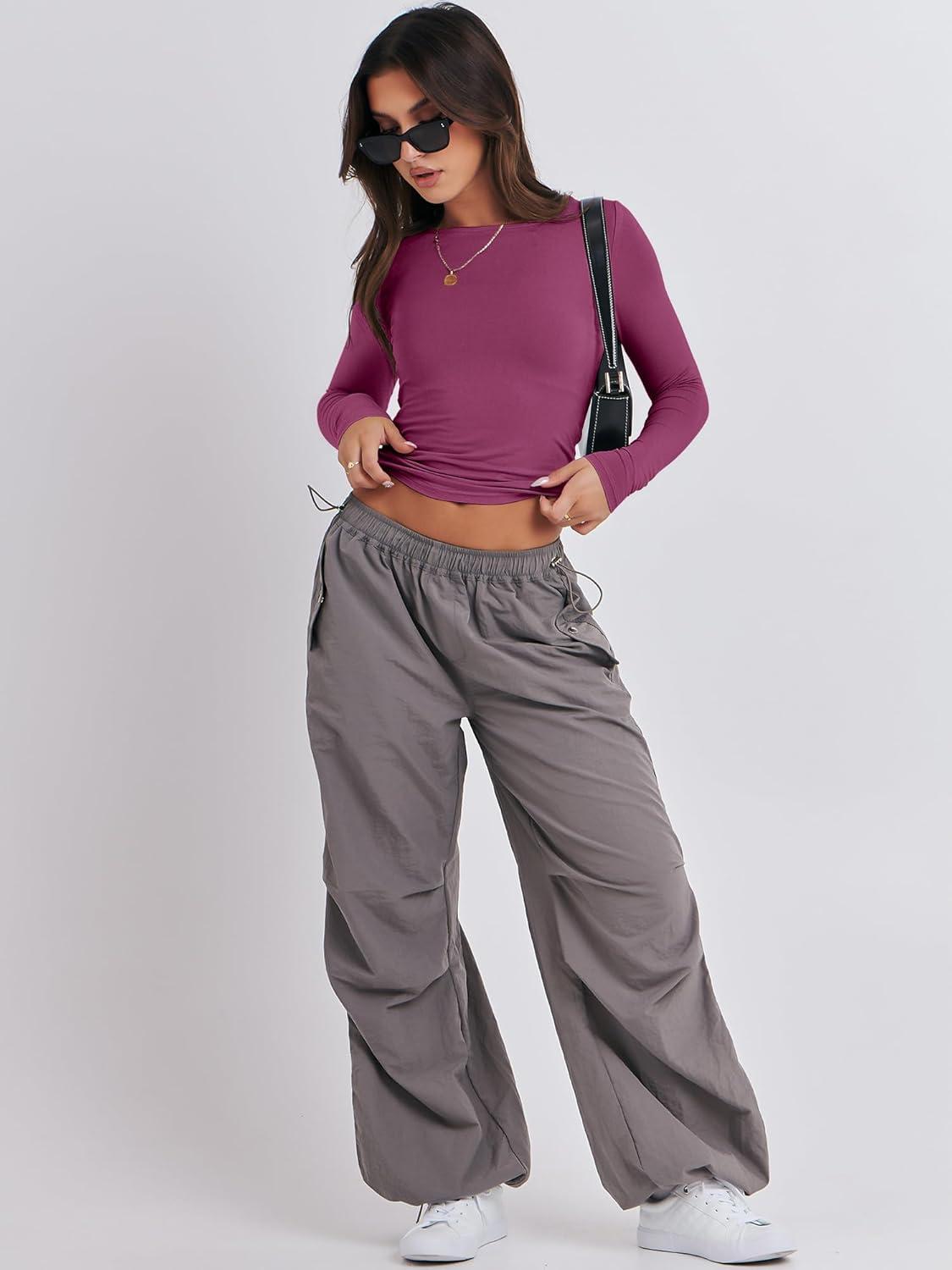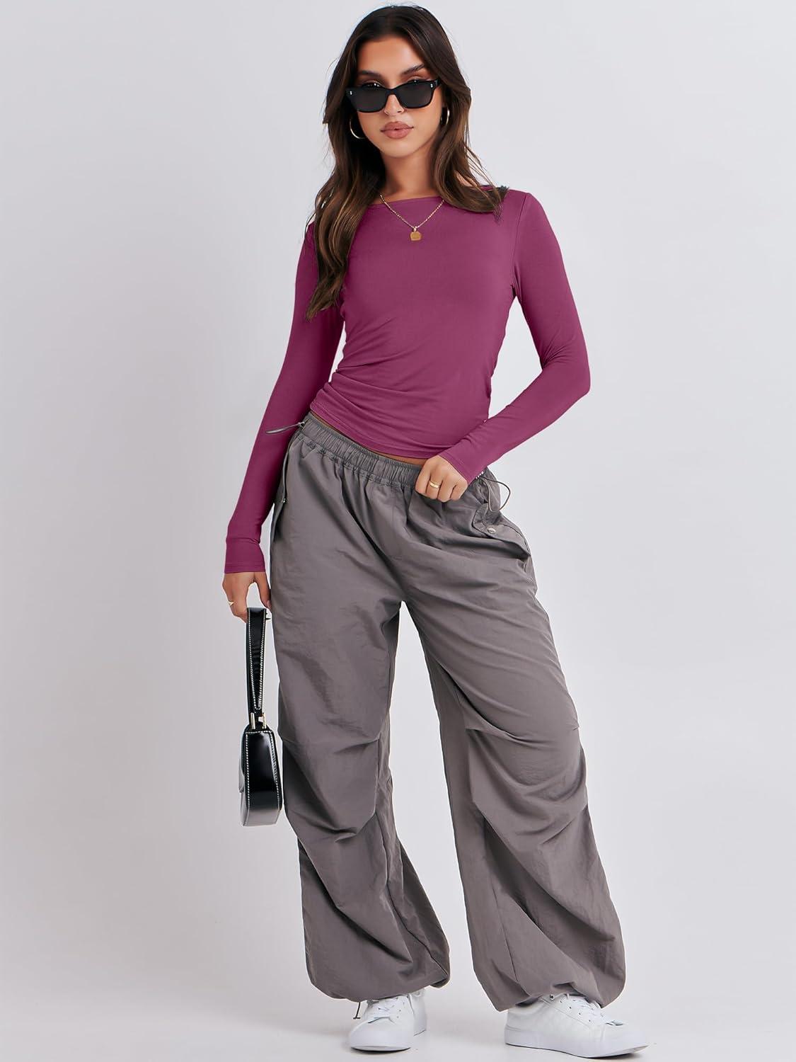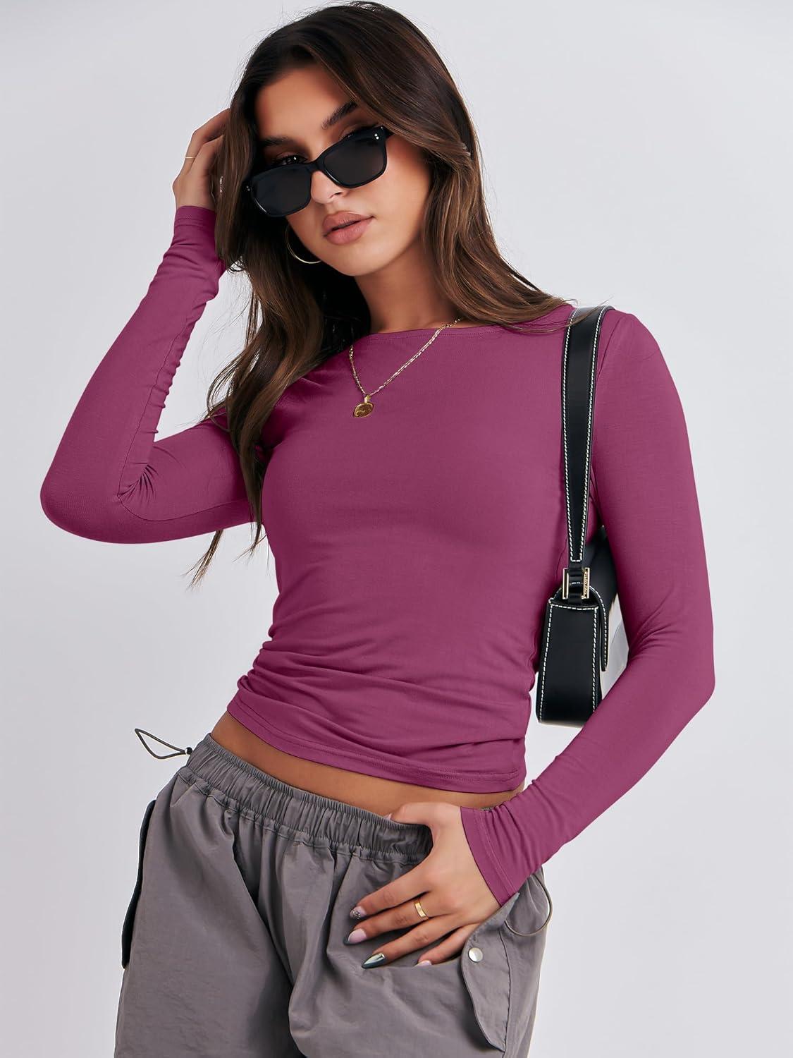 ANRABESS Women’s Long Sleeve Shirts Tight Fitted Going Out Crop Tops Crewneck Basic Tee Y2k Fall Outfits Teens Girls Clothes(Dark Purple)
