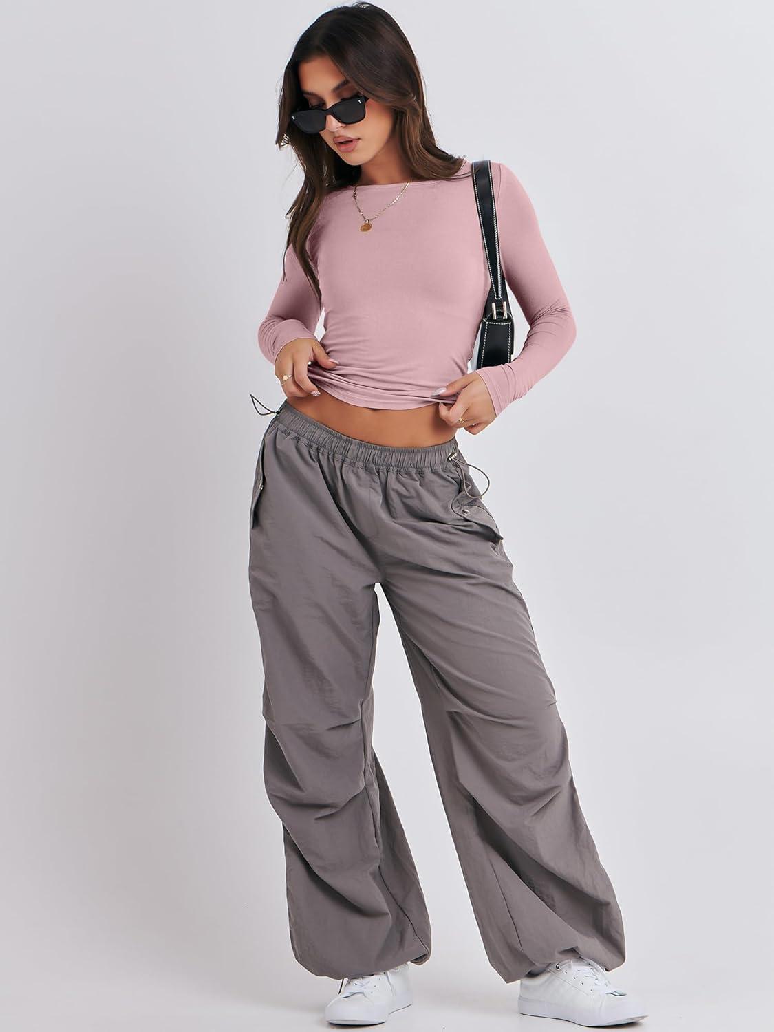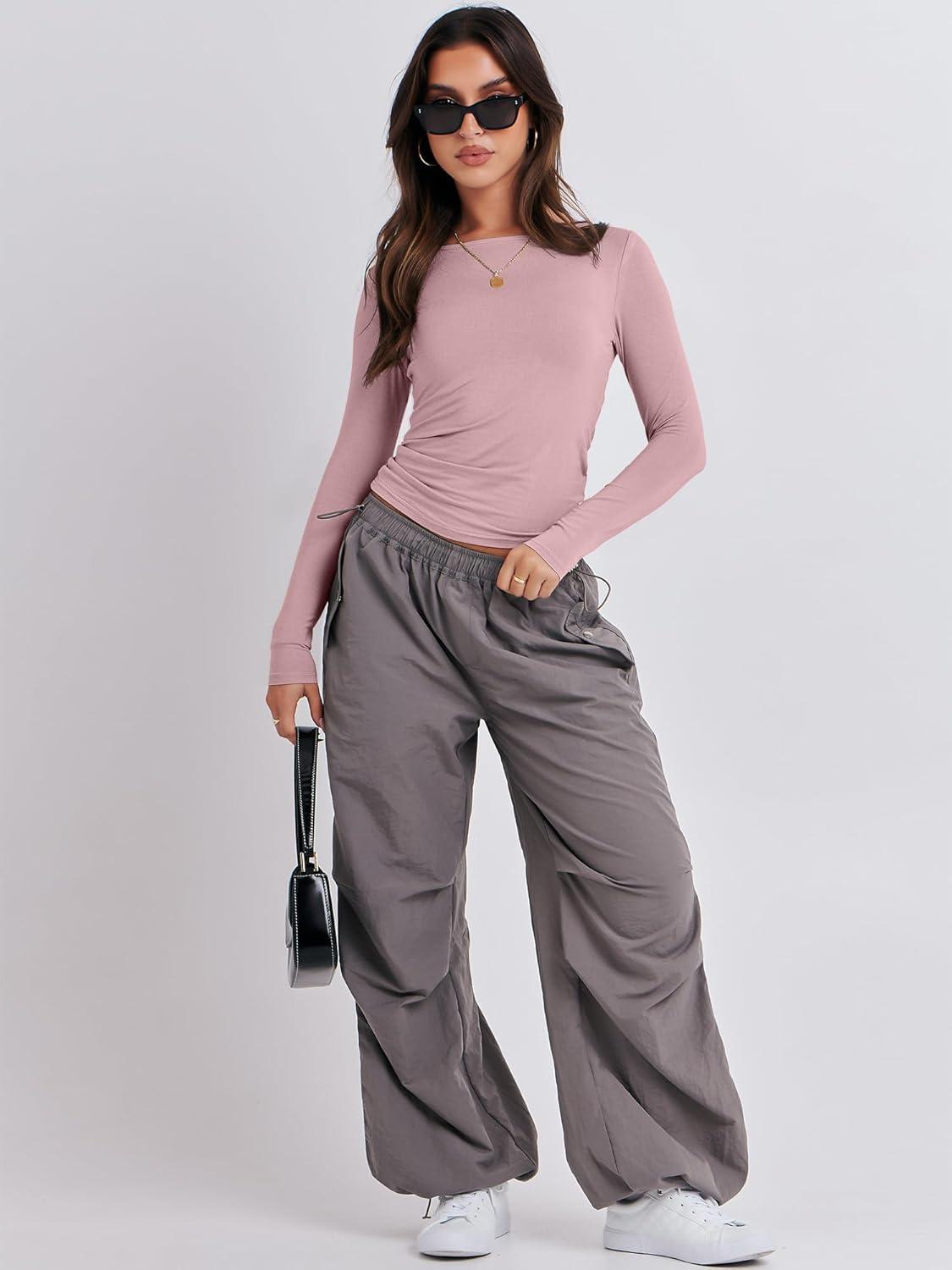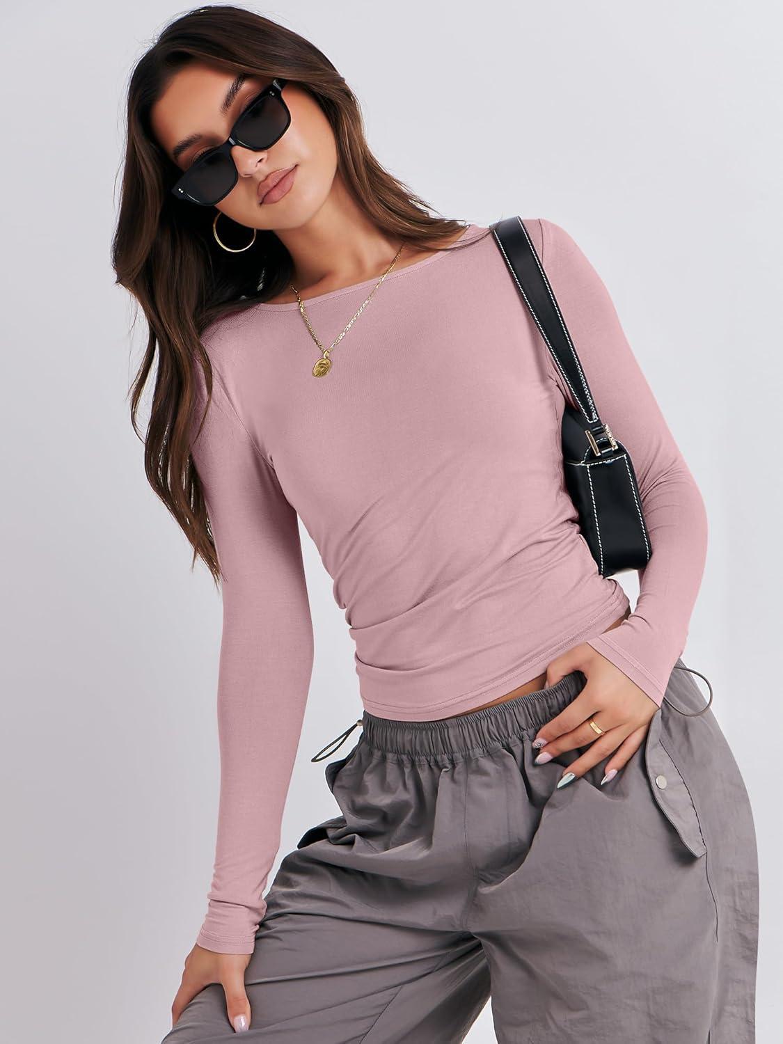 ANRABESS Women’s Long Sleeve Shirts Tight Fitted Going Out Crop Tops Crewneck Basic Tee Y2k Fall Outfits Teens Girls Clothes(Grey Pink)