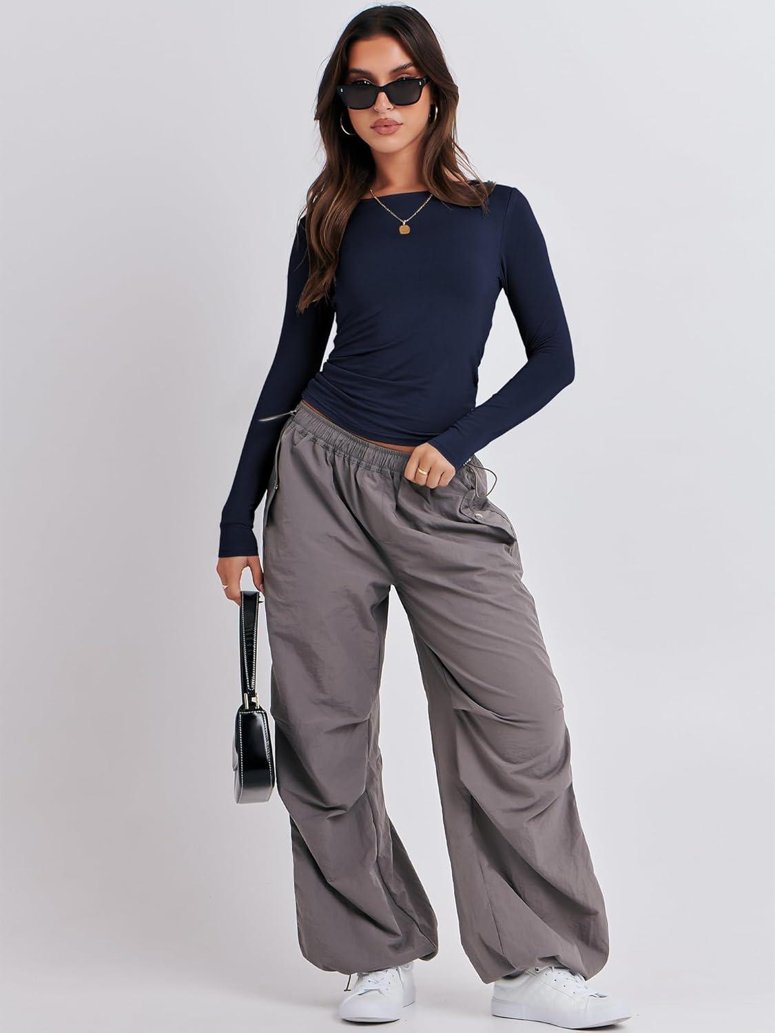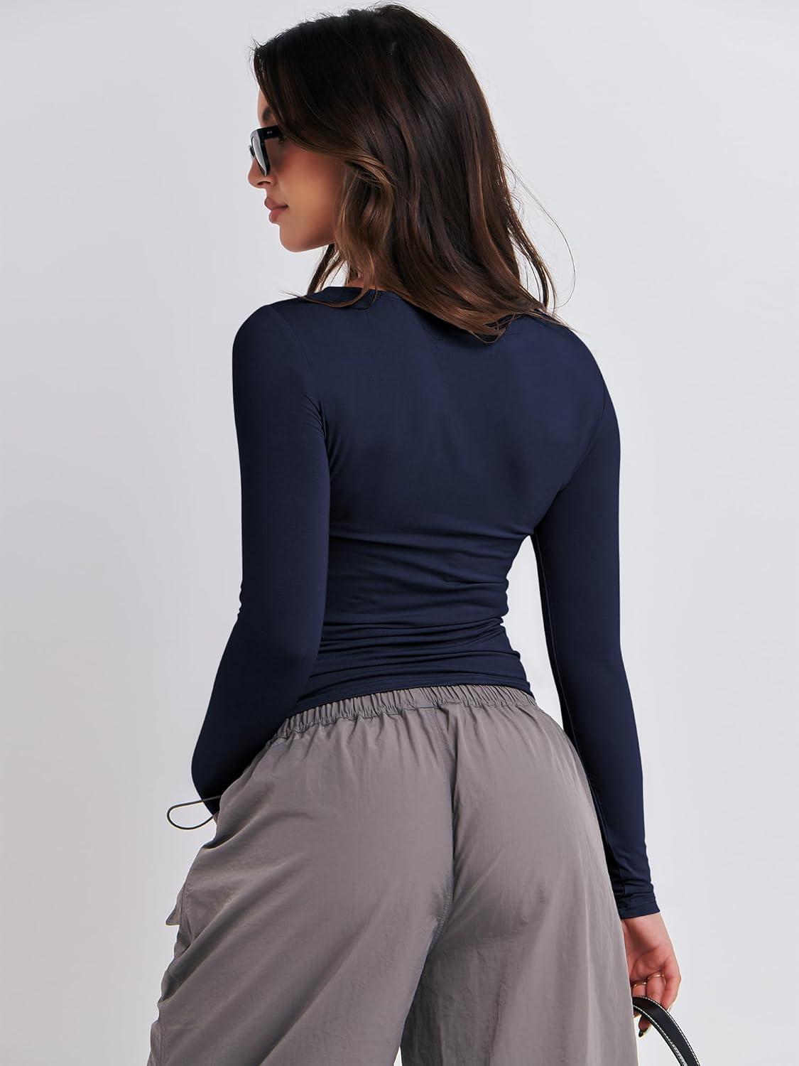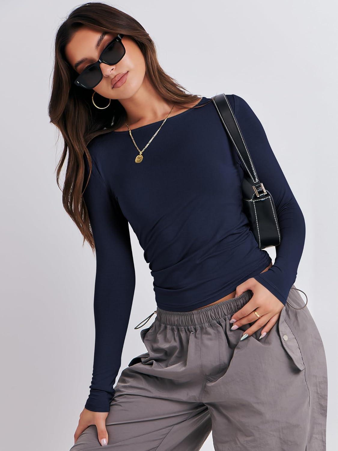 ANRABESS Women’s Long Sleeve Shirts Tight Fitted Going Out Crop Tops Crewneck Basic Tee Y2k Fall Outfits Teens Girls Clothes(Navy Blue)