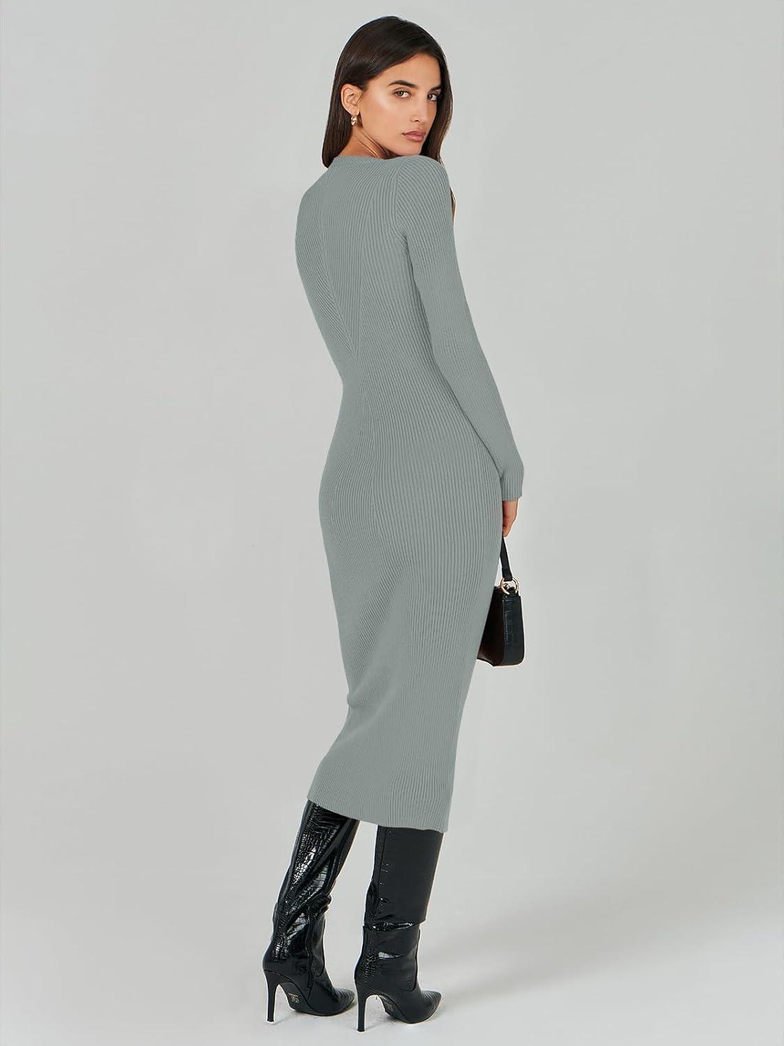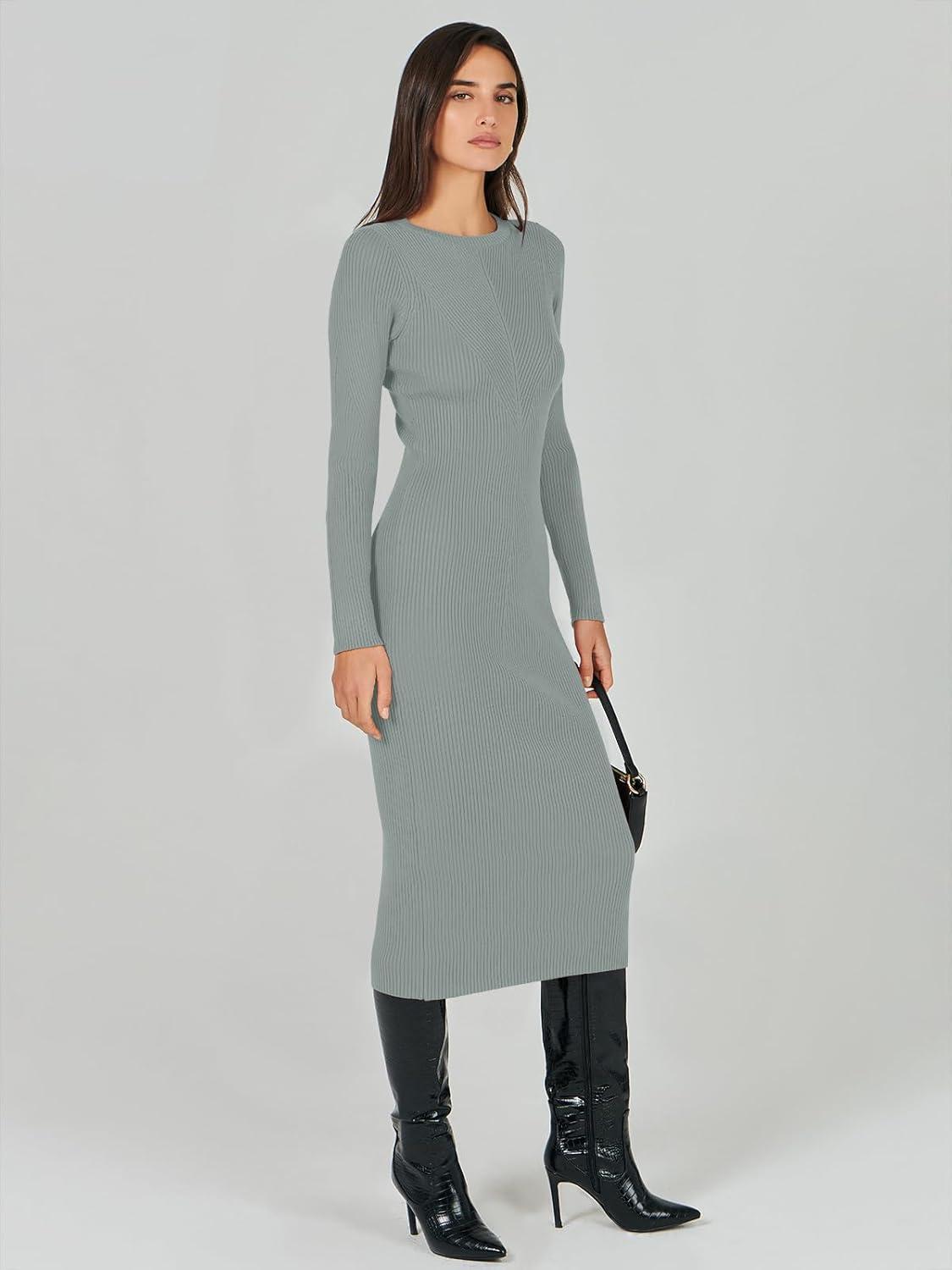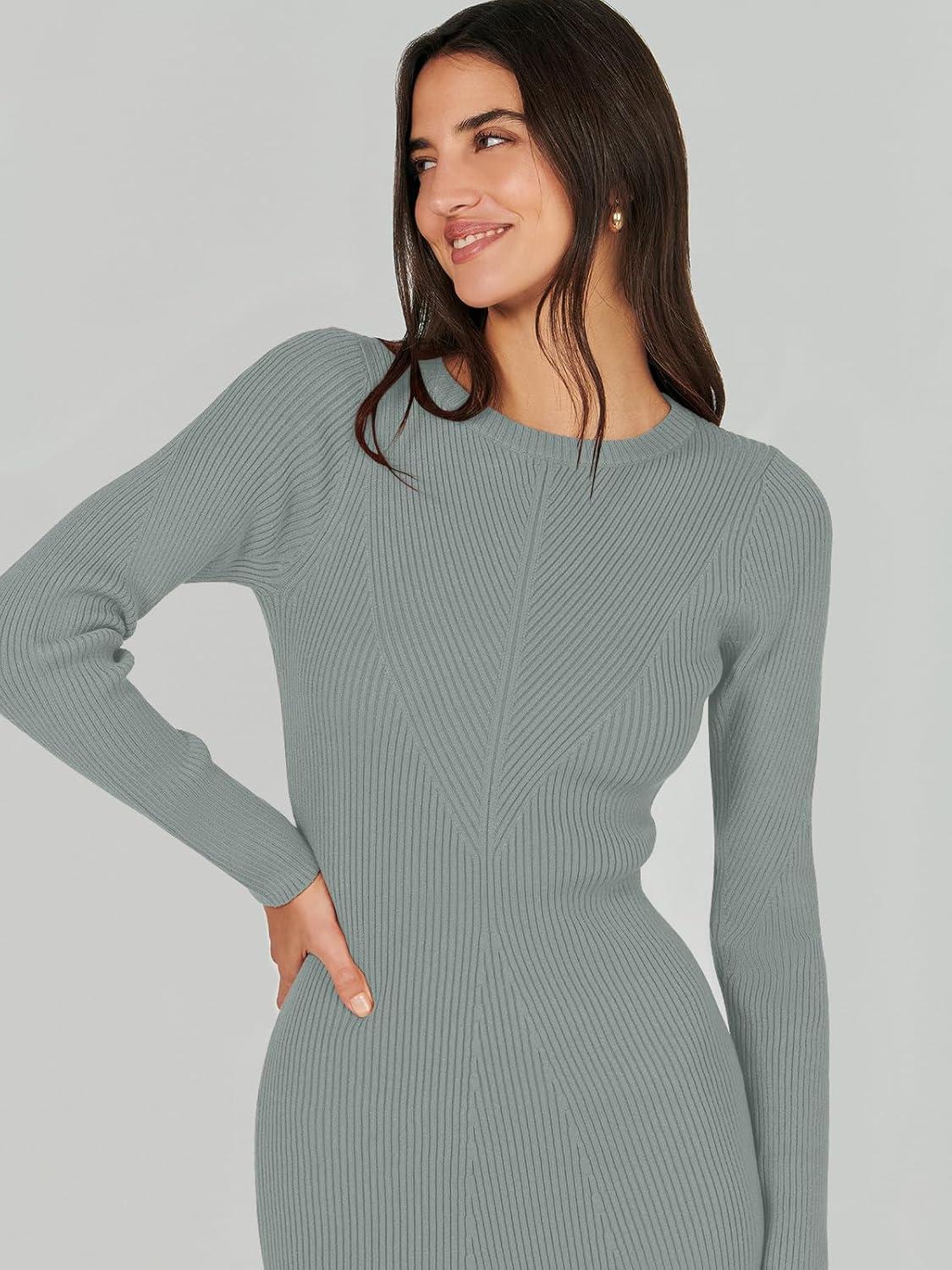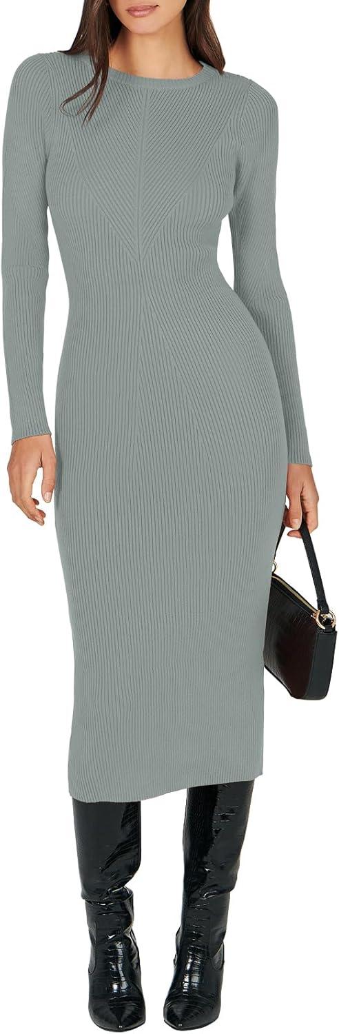 ANRABESS Womens Long Sleeve Sweater Dress 2025 Fall Crewneck Bodycon Stretch Ribbed Knit Slim Fit Midi Dresses Trendy Outfits(Light Gray)