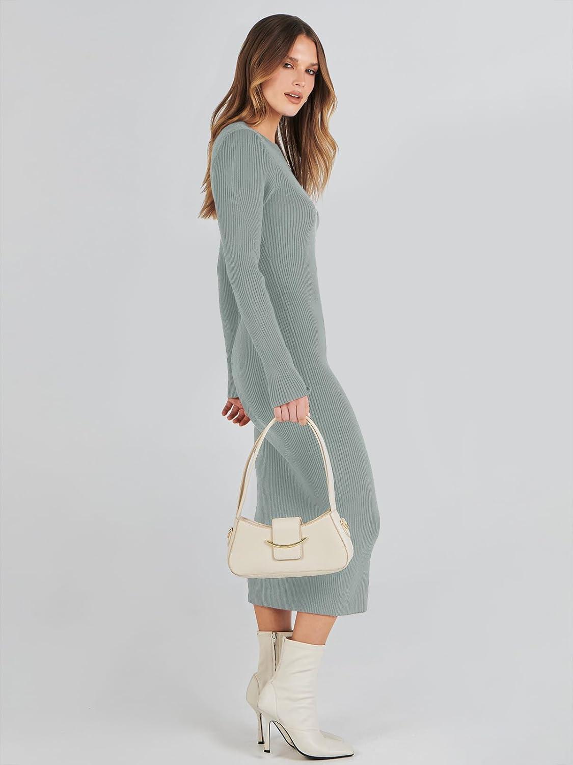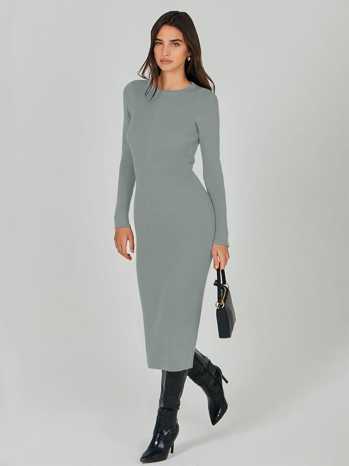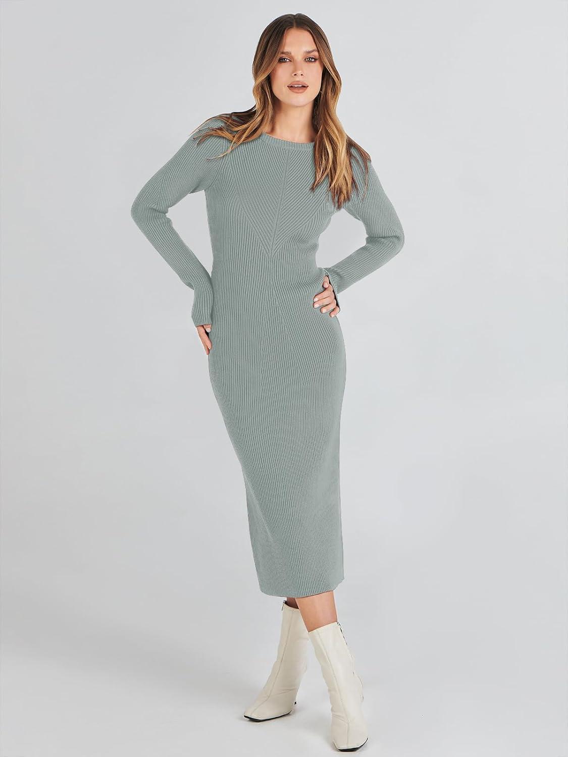 ANRABESS Womens Long Sleeve Sweater Dress 2025 Fall Crewneck Bodycon Stretch Ribbed Knit Slim Fit Midi Dresses Trendy Outfits(Light Gray)