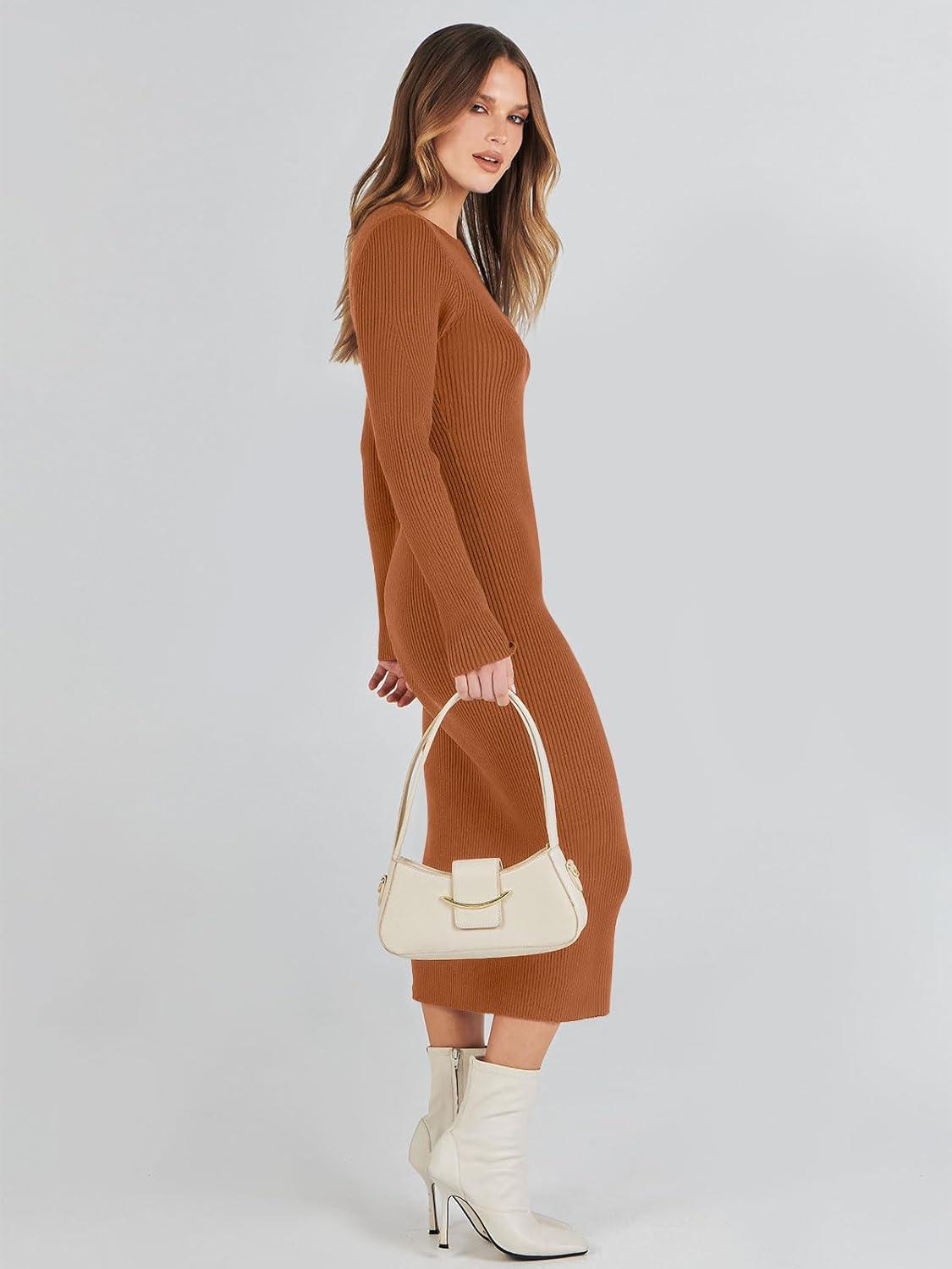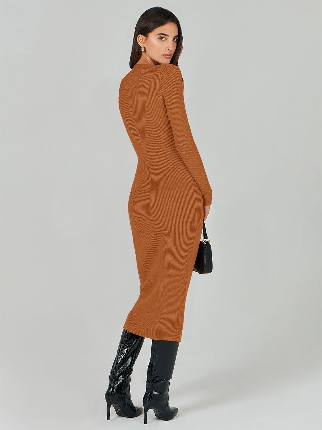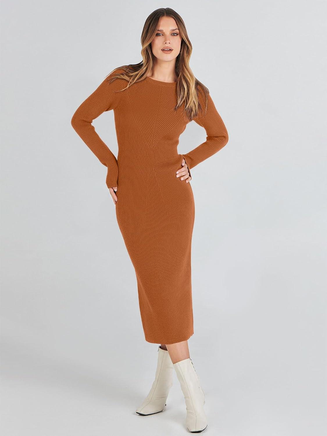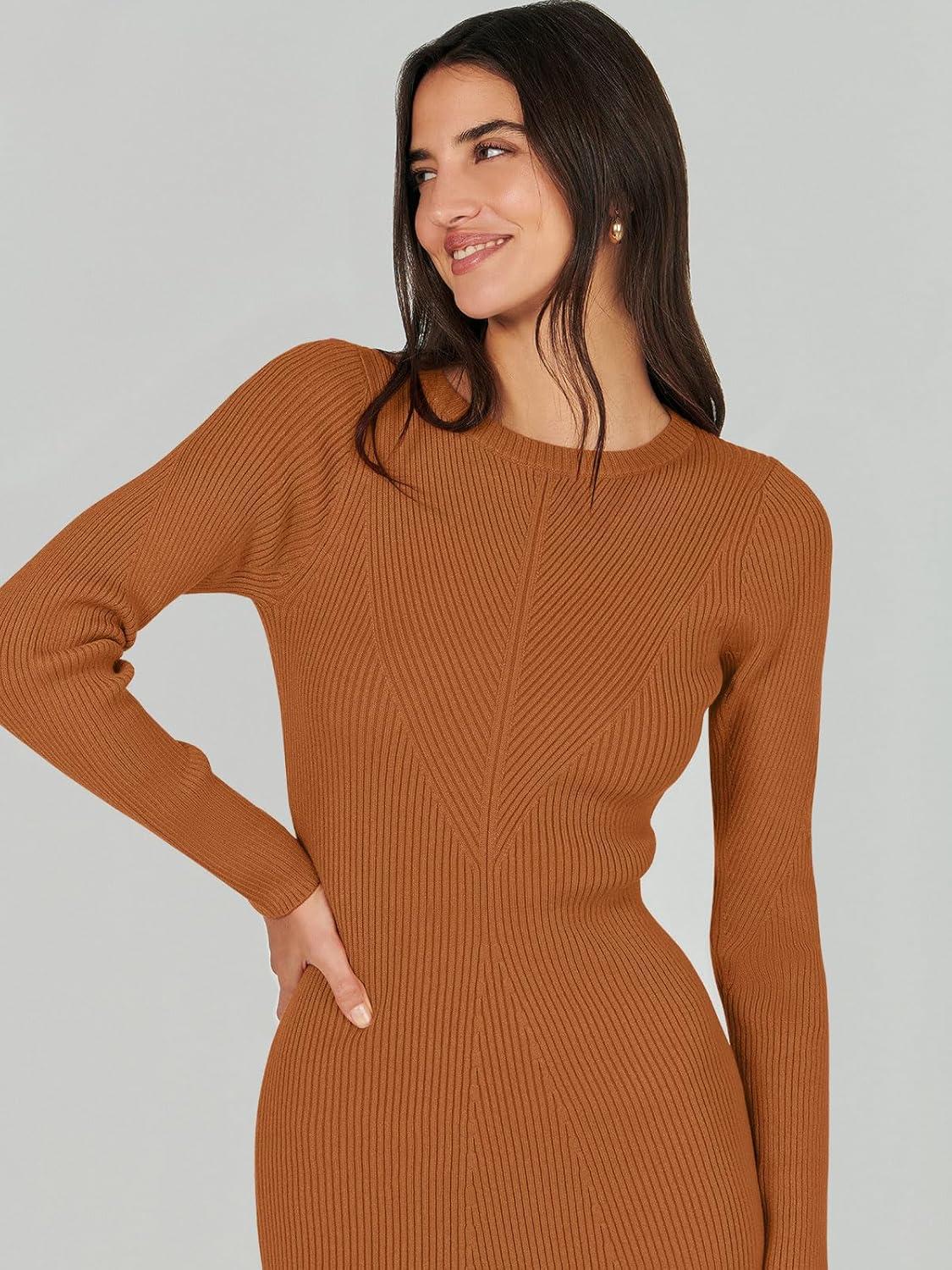 ANRABESS Womens Long Sleeve Sweater Dress 2025 Fall Crewneck Bodycon Stretch Ribbed Knit Slim Fit Midi Dresses Trendy Outfits(Rust)