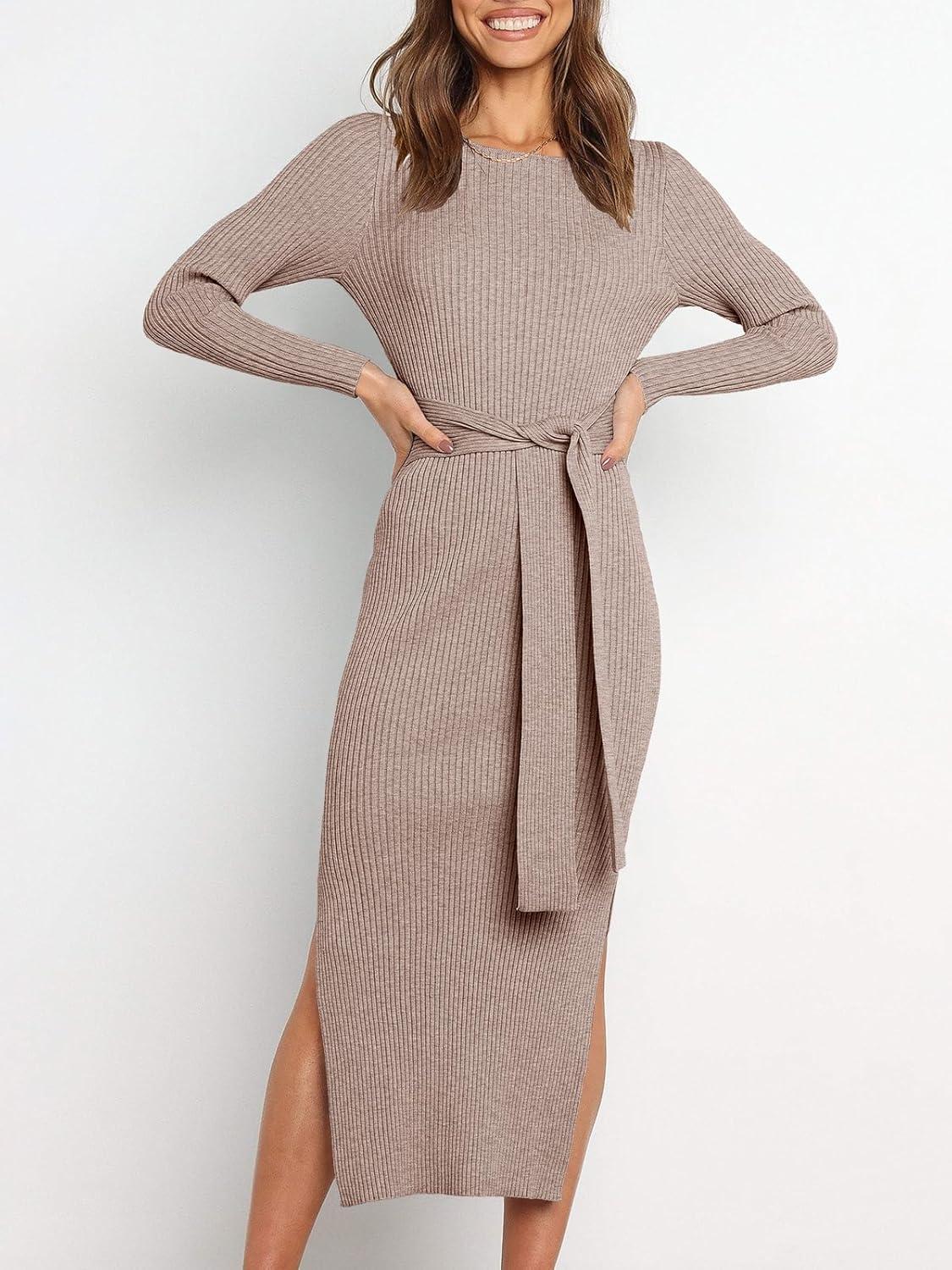 ANRABESS Womens Long Sleeve Sweater Dress Crew Neck Slim Fit Slit Tie Waist 2025 Ribbed Knit Bodycon Midi Dress Fall Outfits(Camel)