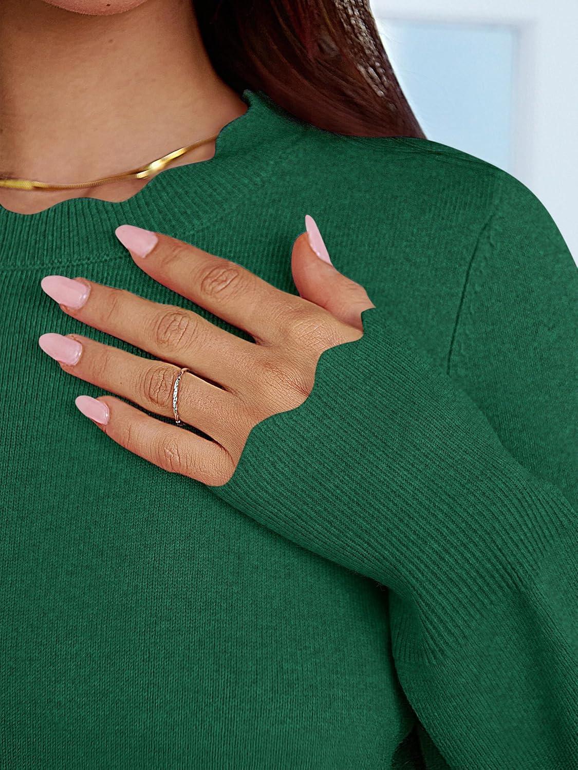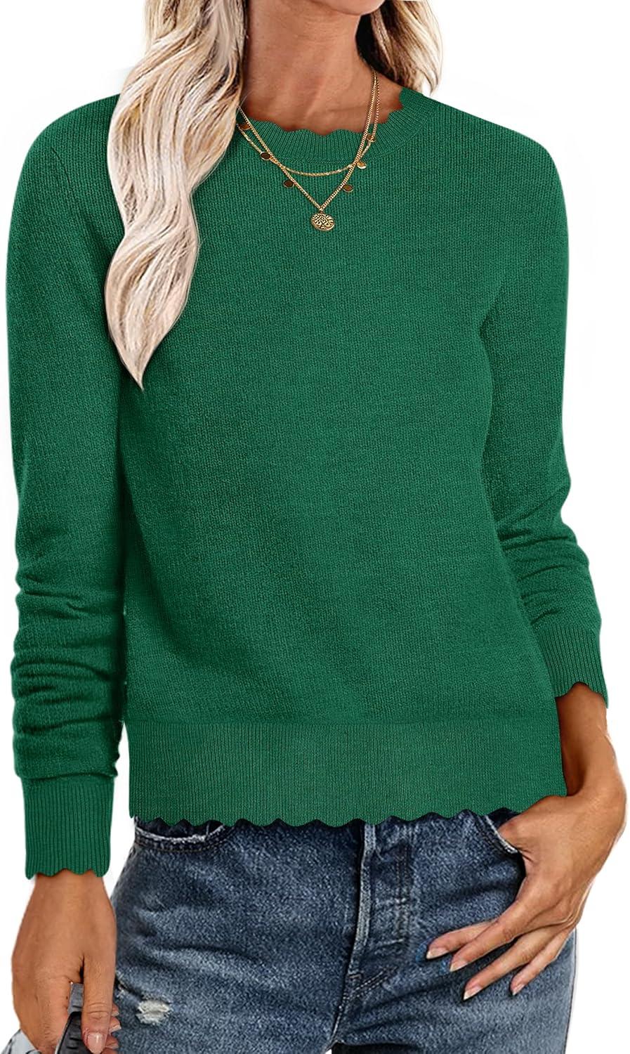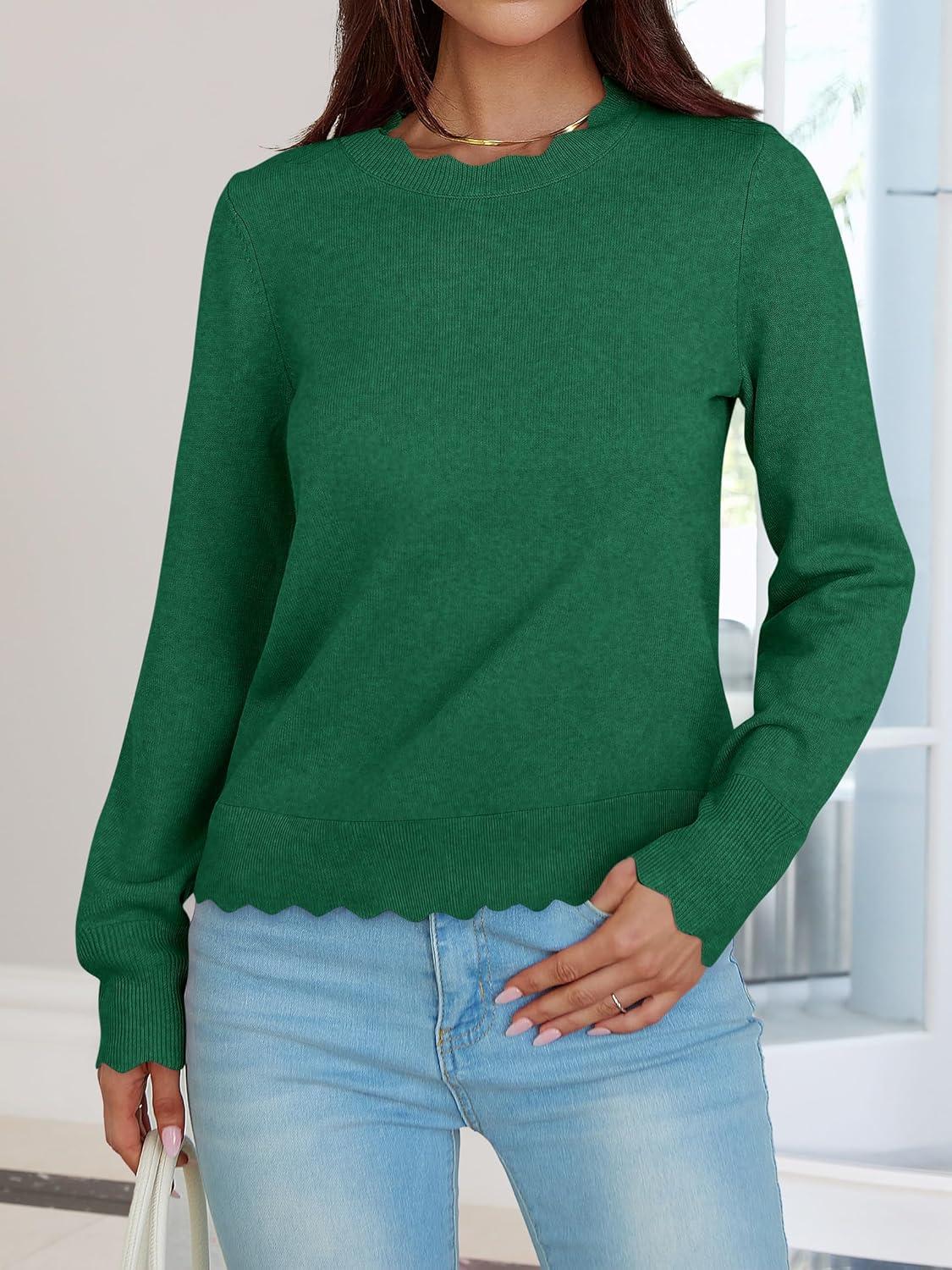 ANRABESS Womens Long Sleeve Sweaters Loose Fit Lightweight Scalloped Knit Soft Dressy Pullover Tops 2025 Fall Casual Outfits(Forest Green)