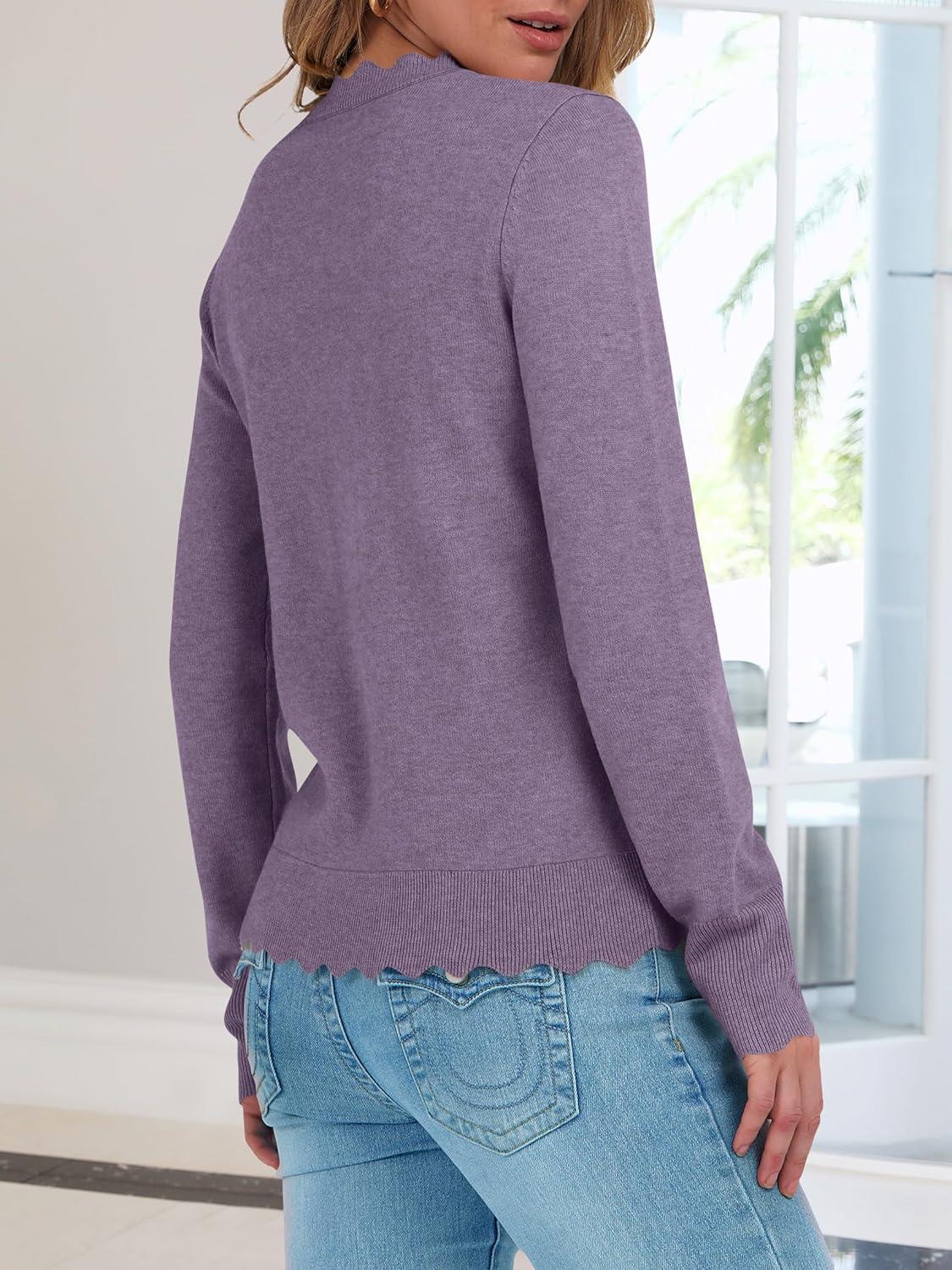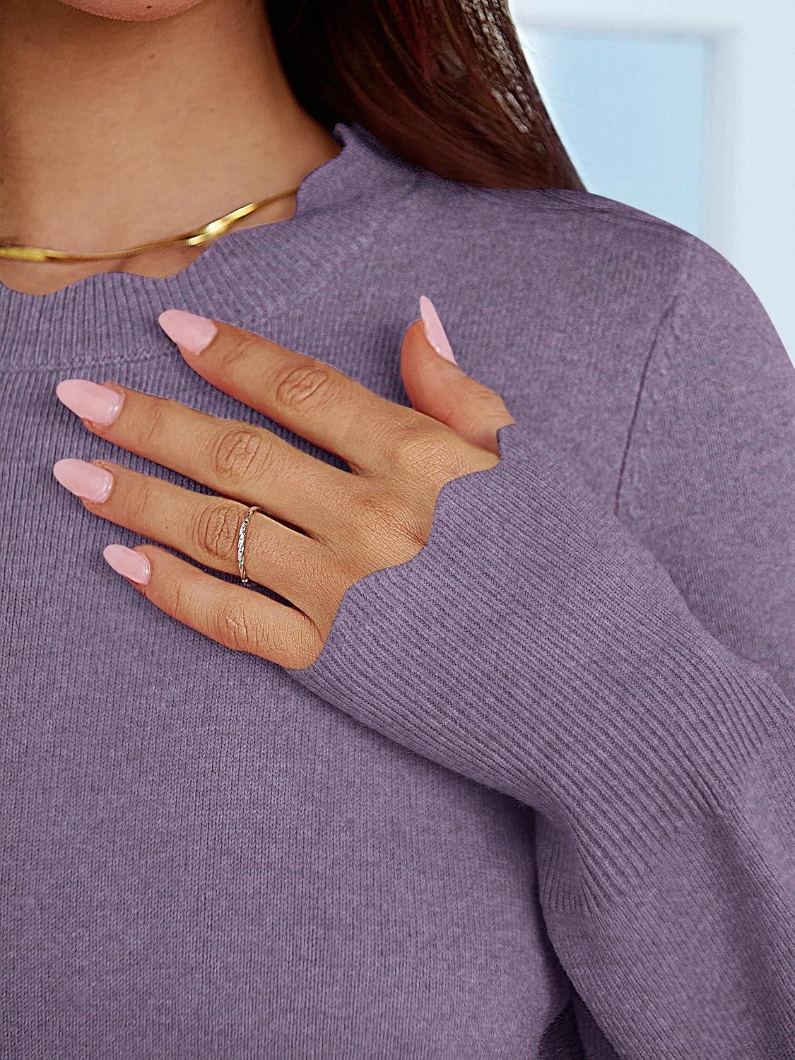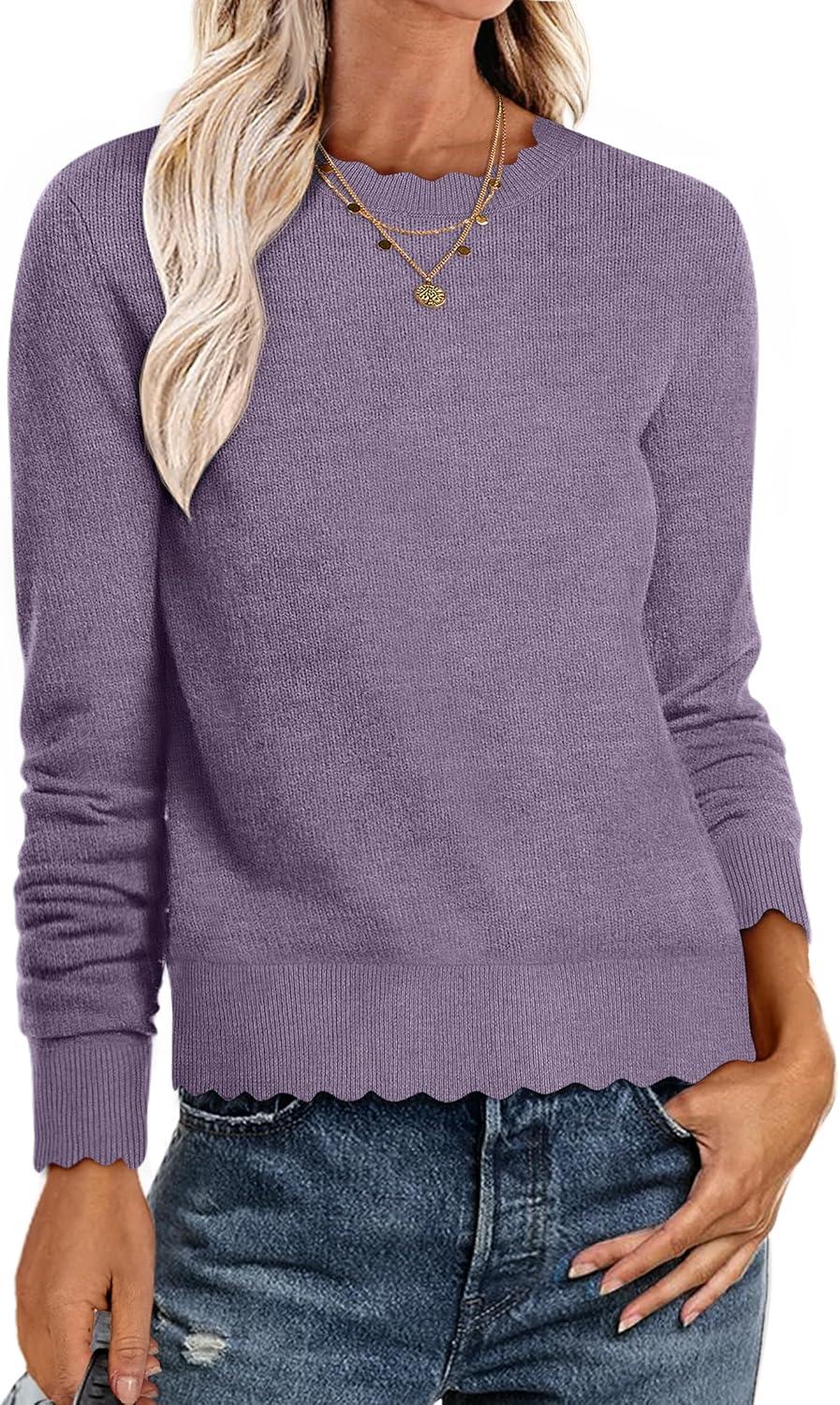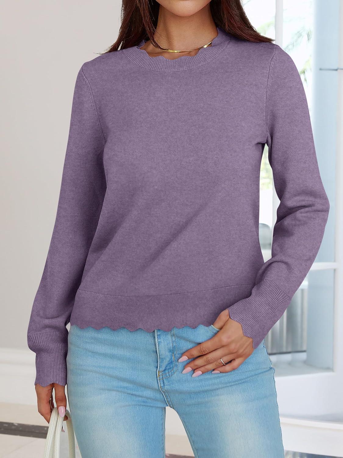 ANRABESS Womens Long Sleeve Sweaters Loose Fit Lightweight Scalloped Knit Soft Dressy Pullover Tops 2025 Fall Casual Outfits(Purple)