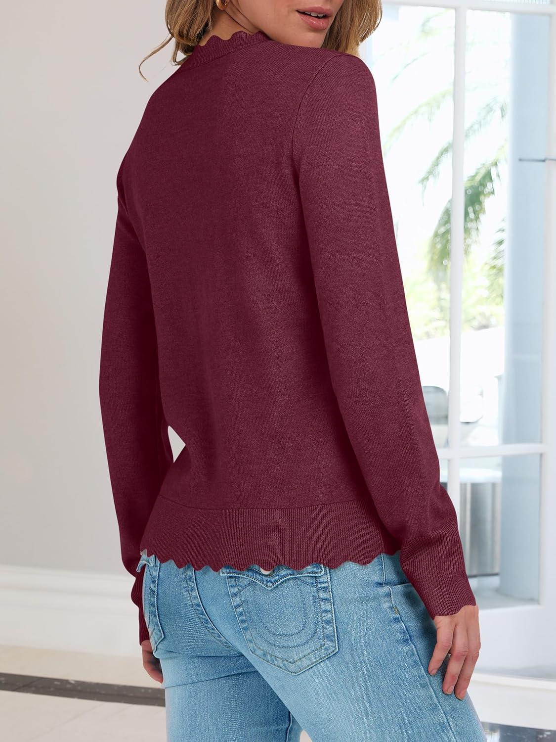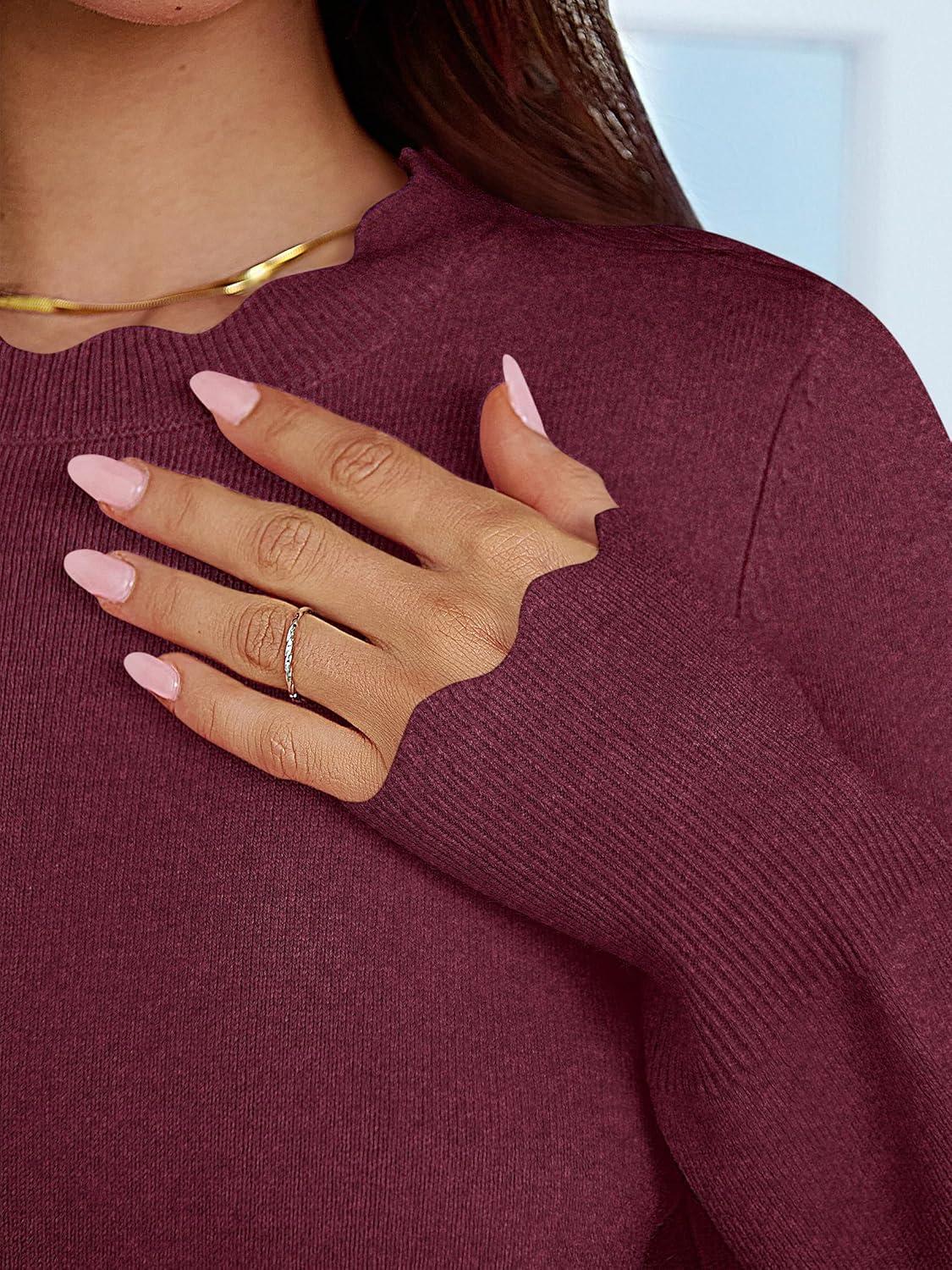 ANRABESS Womens Long Sleeve Sweaters Loose Fit Lightweight Scalloped Knit Soft Dressy Pullover Tops 2025 Fall Casual Outfits(Wine Red)