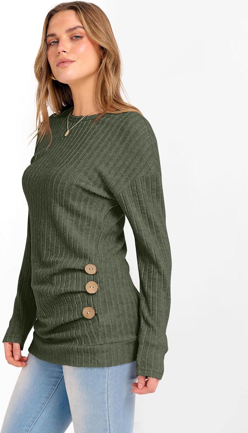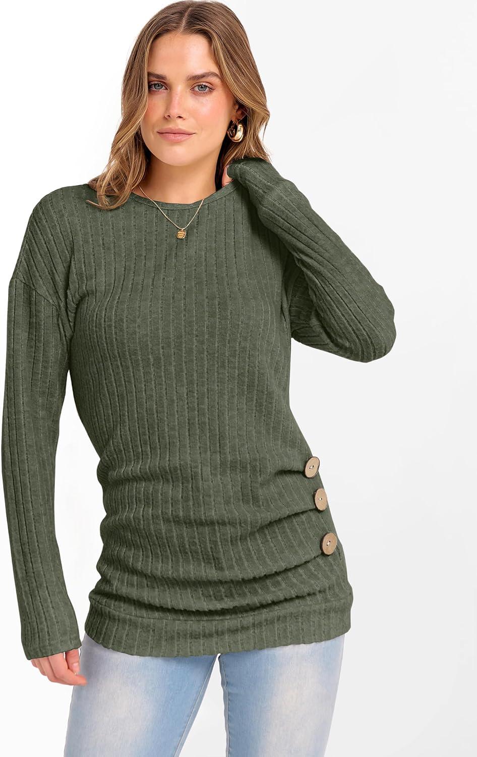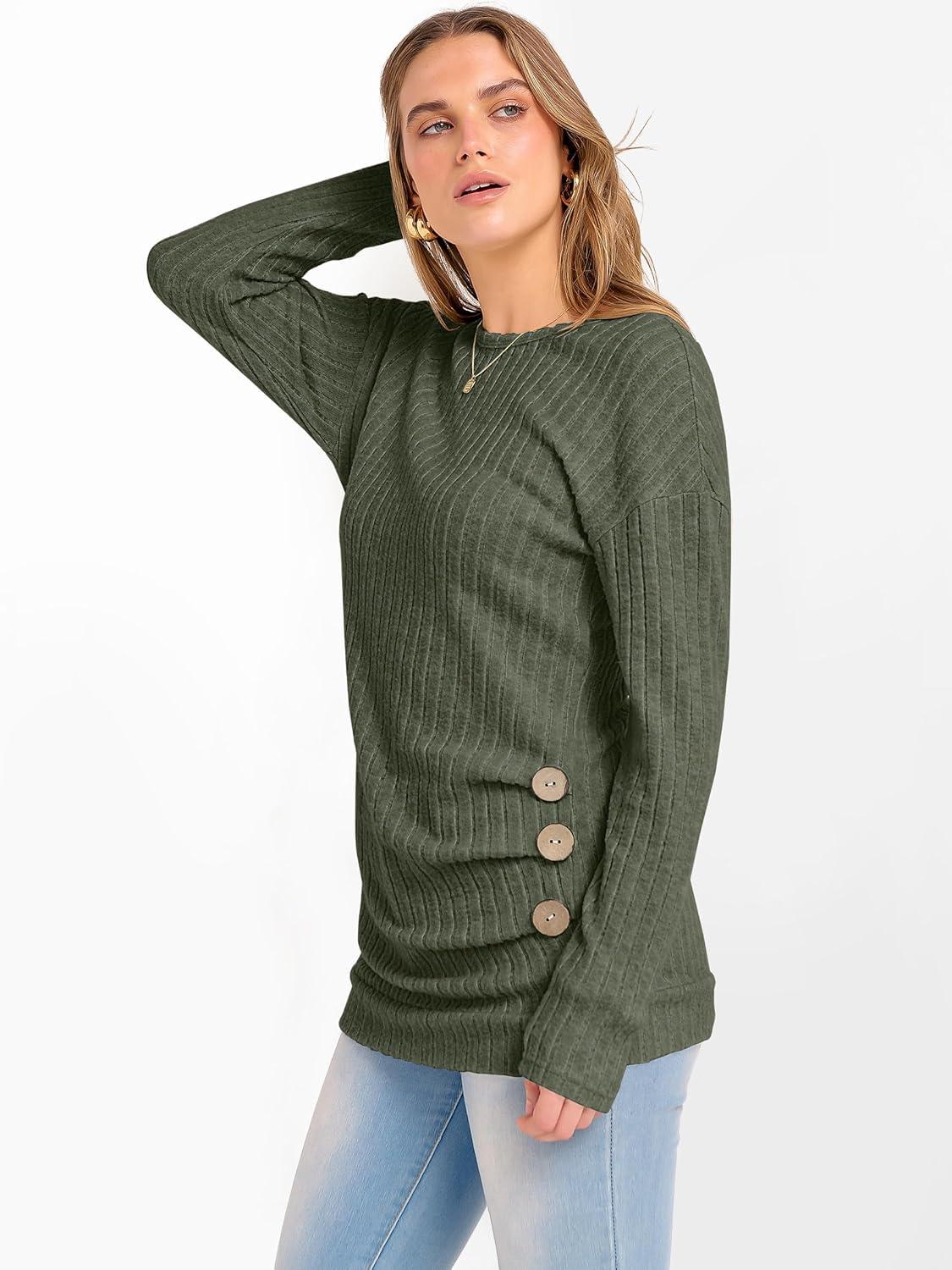 ANRABESS Womens Long Sleeve Tunic Top 2025 Fall Sweaters Lightweight Ribbed Knit Buttons Shirts Casual Work Outfits(Deep Green)
